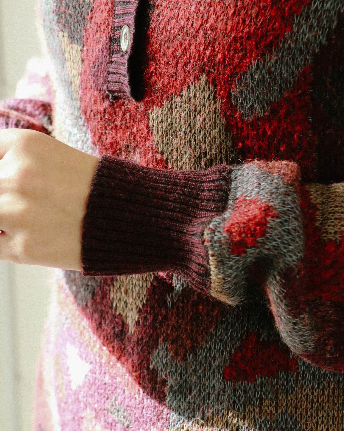 花柄にも見える幾何学柄で、ウールワンピースにみられるほっこり感はなくどこか辛口な印象も。とくに首元と袖口のリブが活かされています。