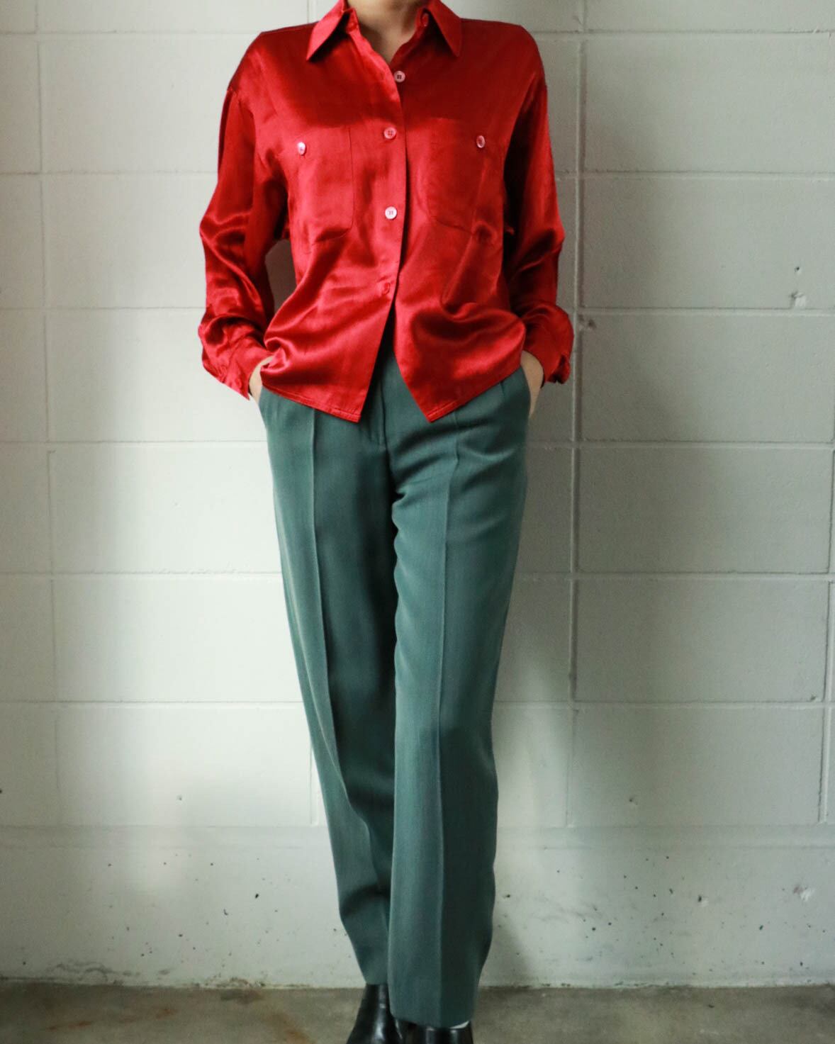 光が反射するたびに優雅には発色するレッドカラーの美しいシルクシャツが入荷しました。エレガントさが増す滑らかなシルク素材はゆったりとしたオーバーサイズで着るくらいがちょうどいい。