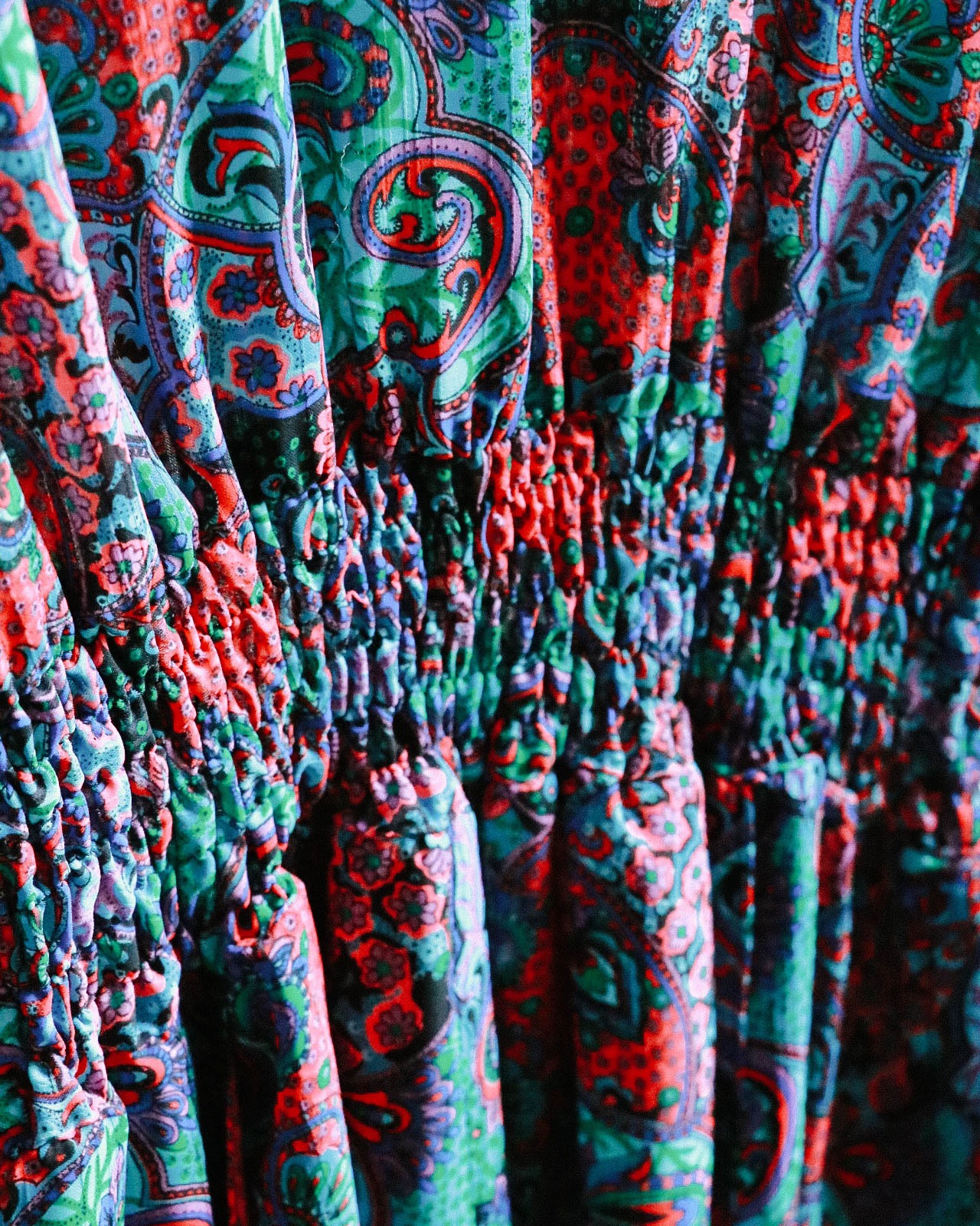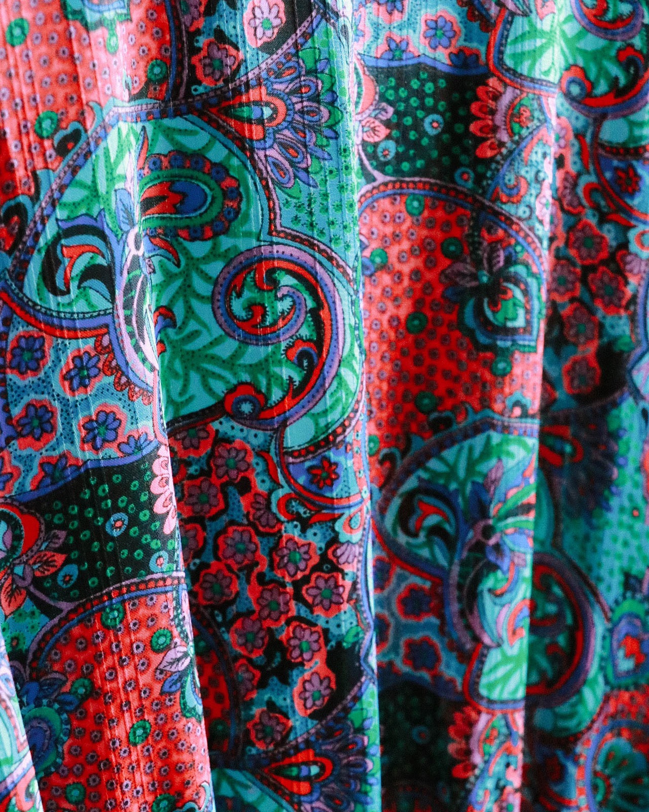 グリーン、ブルー、赤などのカラフルな模様に、動きやすいゴムウエスト、プリーツ になったフレアボトムの裾にたくさのスリットが入ったデザイン。柄パターンを上手く組み合わせて作られた魅力満載の一着です。