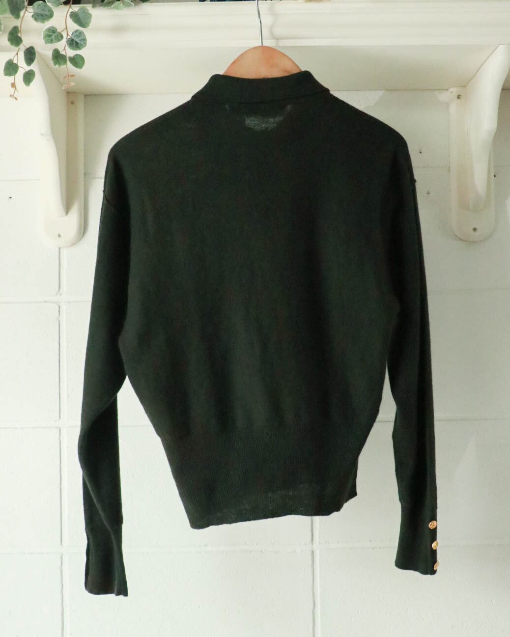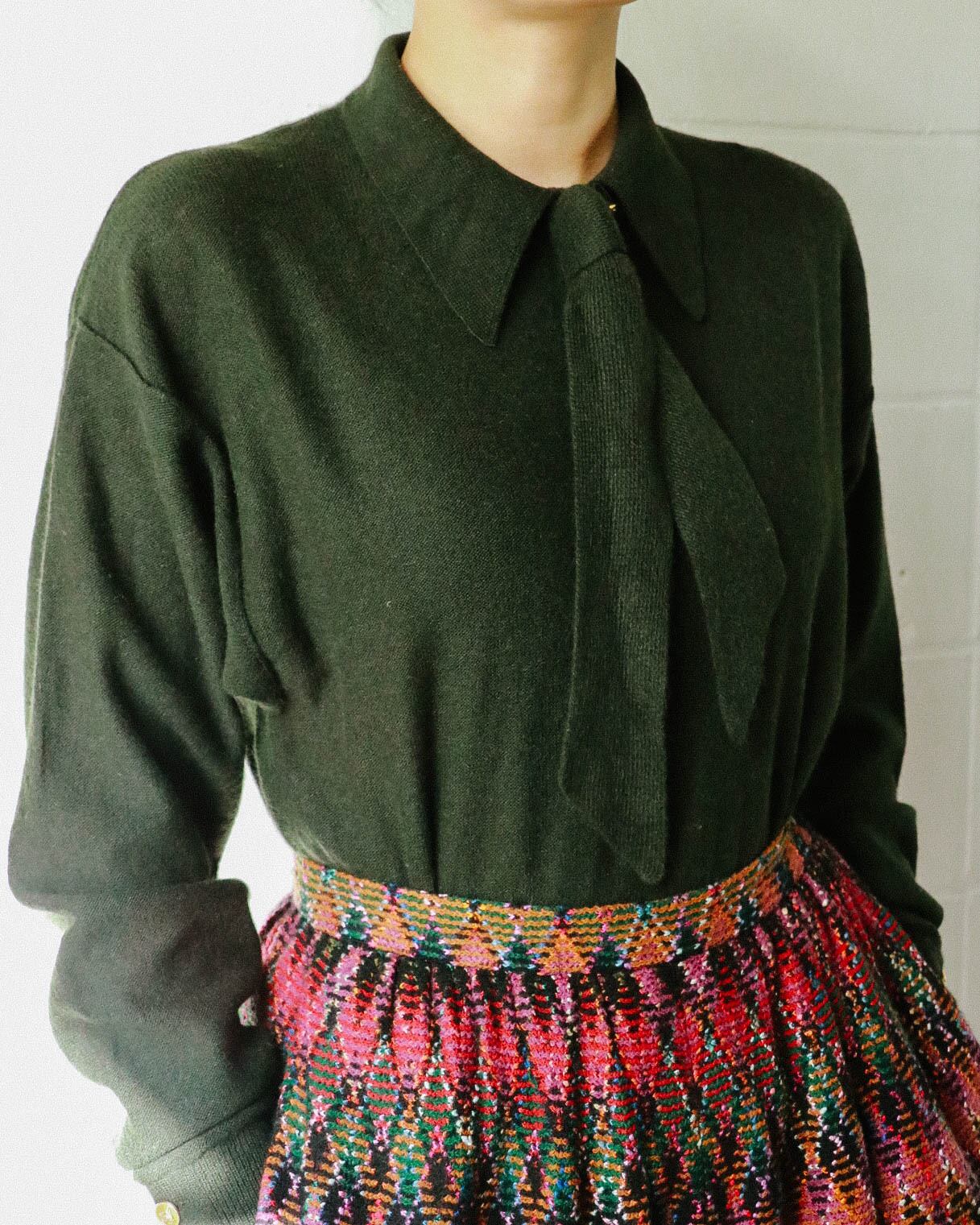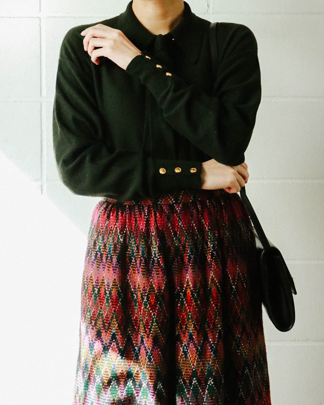 ダークグリーンのセーターはソニアリキエル のもの。コンパクトな身頃でインもアウトもしやすく、長めにとられたソニアらしいリブ袖のゴールドボタンのディテールは乙女心にきゅんとくる。カジュアルになりがちなワンカラーのニット、首元のリボンやゴールドボタンなどで女性らしい仕上がりで様々なテイストにハマる使い勝手の良さ。薄手なので夏以外は楽しめる万能な素材感です。