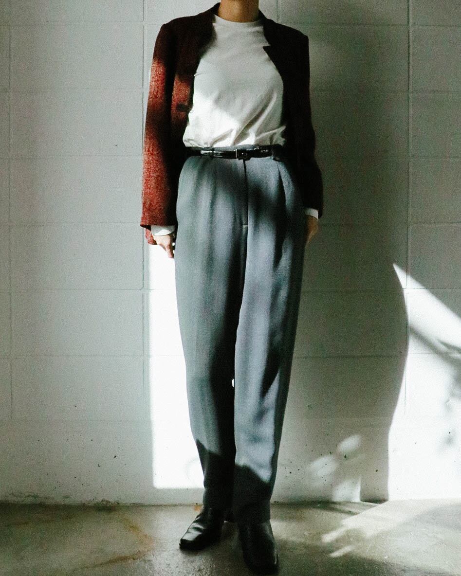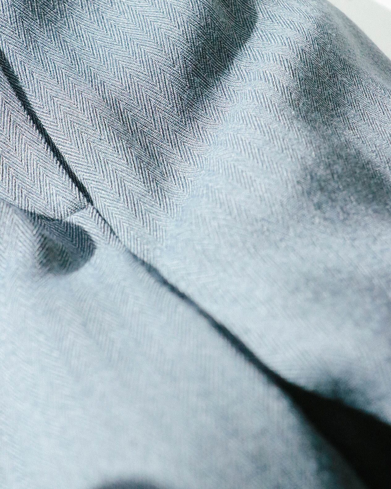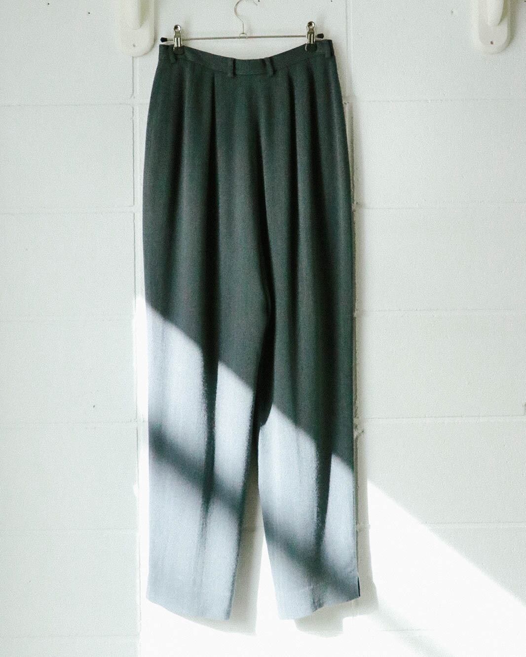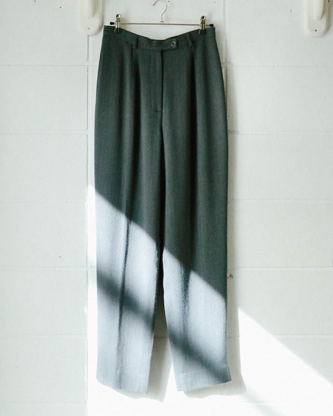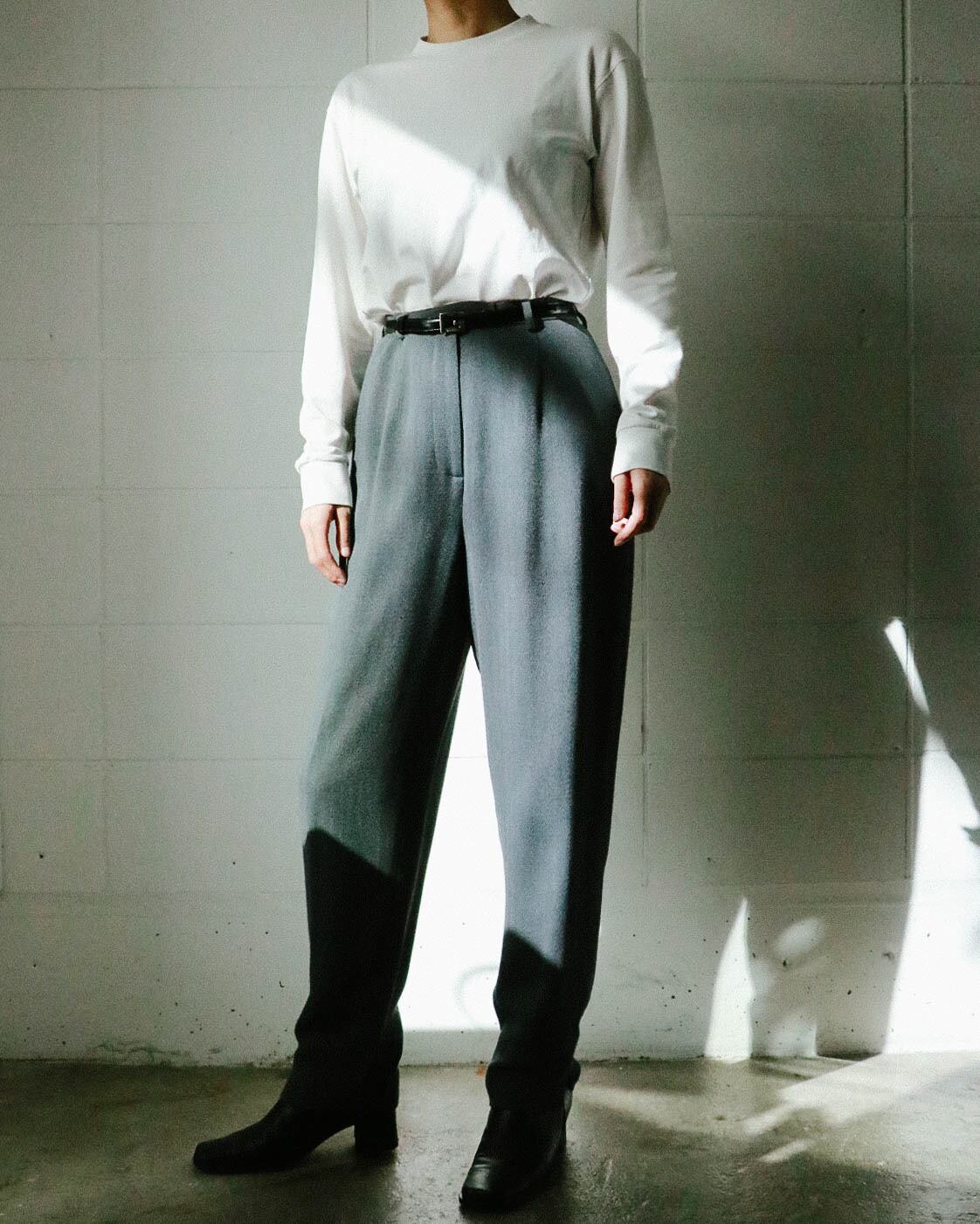 カジュアルなセーターから綺麗めなブラウスまで幅広く対応してくれる万能パンツは、何本でも欲しい。こちらのグレーパンツはうっすらとヘリンボーン模様で、折り目が付いてないミニマルでゆったりとした動きやすいデザイン。ハイウエスト のテーパード寄りのシルエットがトップスインスタイルも綺麗に決まり足長効果をアップしてくれます。さらっとした肌触りで着心地も快適。
