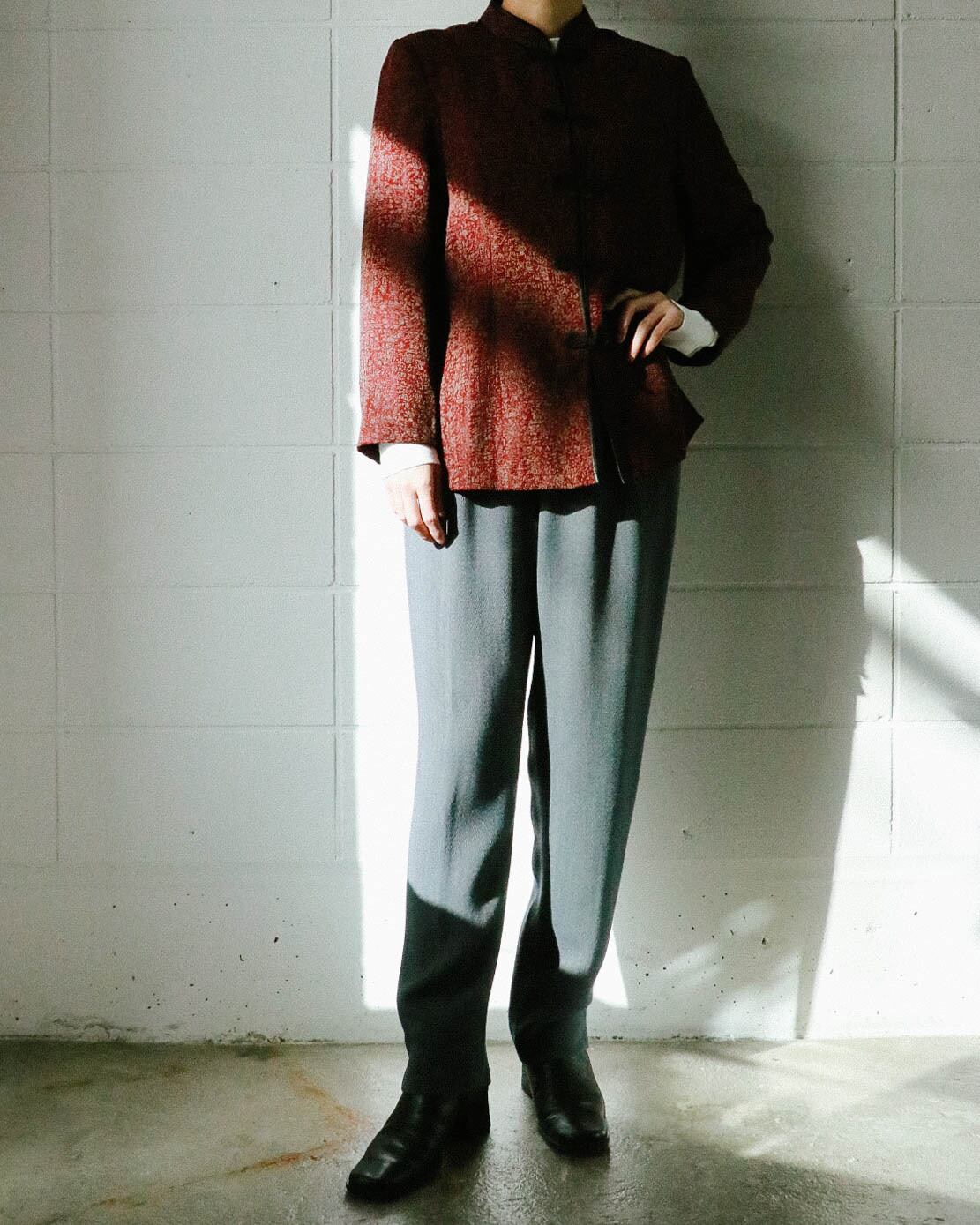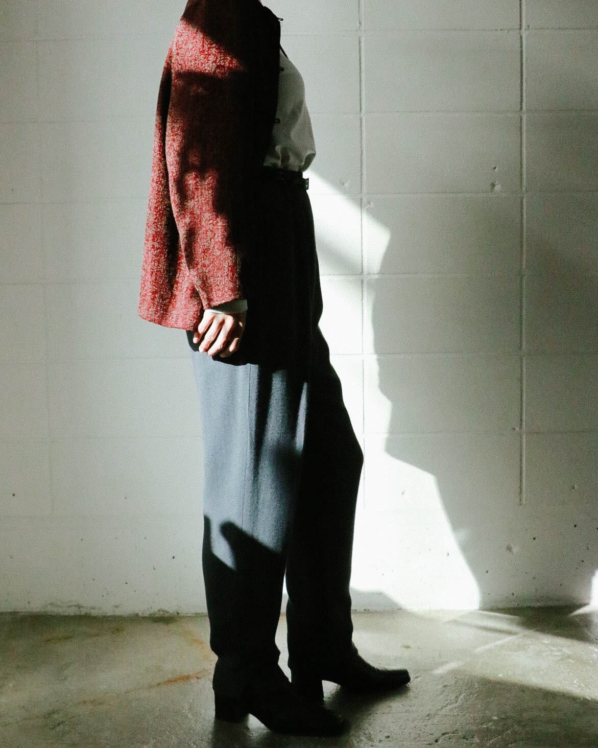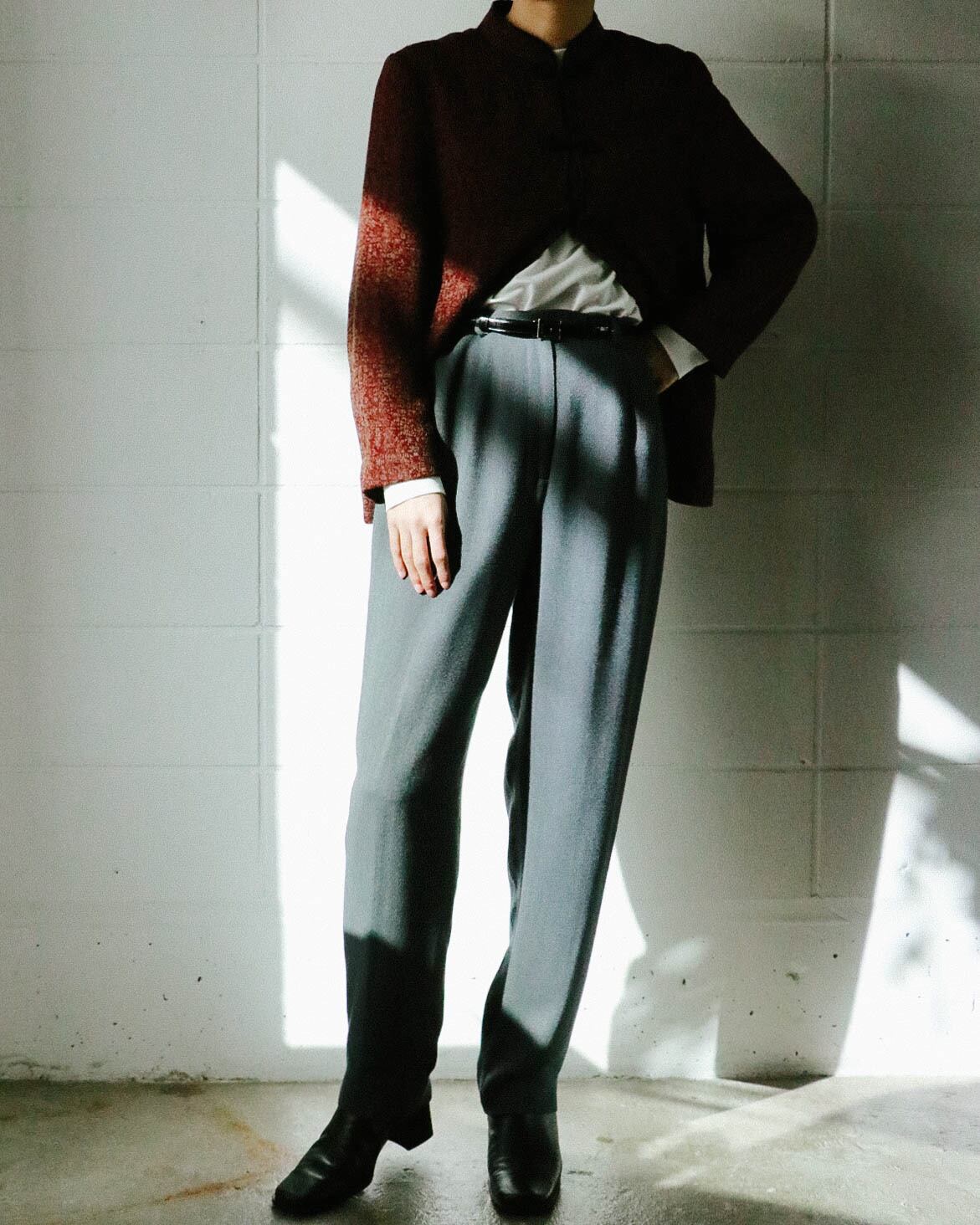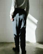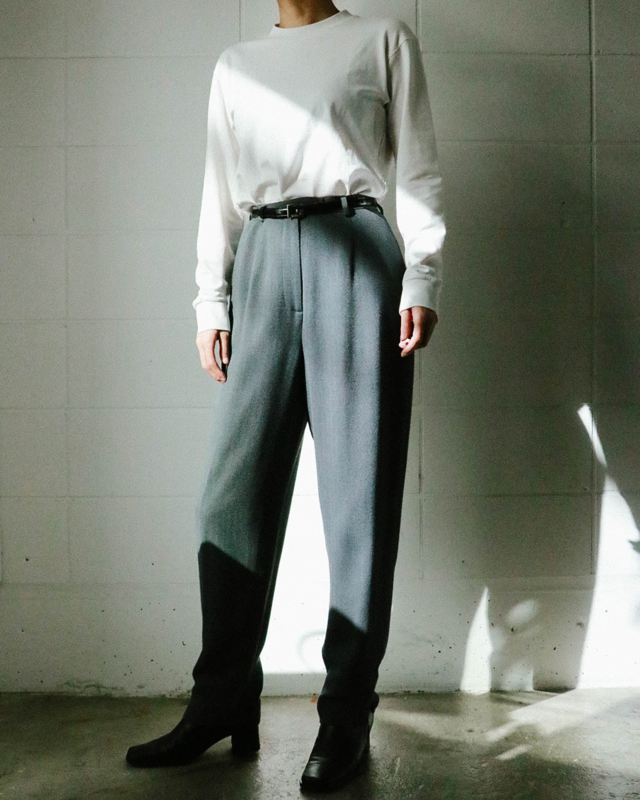 カジュアルなセーターから綺麗めなブラウスまで幅広く対応してくれる万能パンツは、何本でも欲しい。こちらのグレーパンツはうっすらとヘリンボーン模様で、折り目が付いてないミニマルでゆったりとした動きやすいデザイン。ハイウエスト のテーパード寄りのシルエットがトップスインスタイルも綺麗に決まり足長効果をアップしてくれます。さらっとした肌触りで着心地も快適。