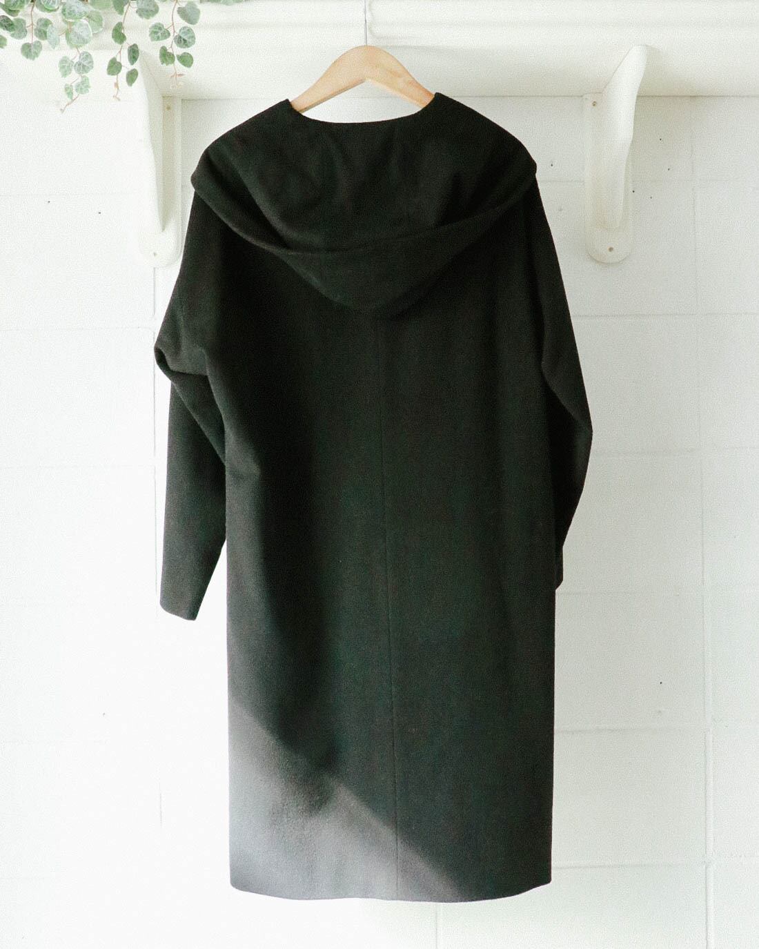 カルバンクラインのブラックコート。シンプルデザインに大きめのフードがかわいい。またセミロング丈でインナーのコーディネートを選びません。