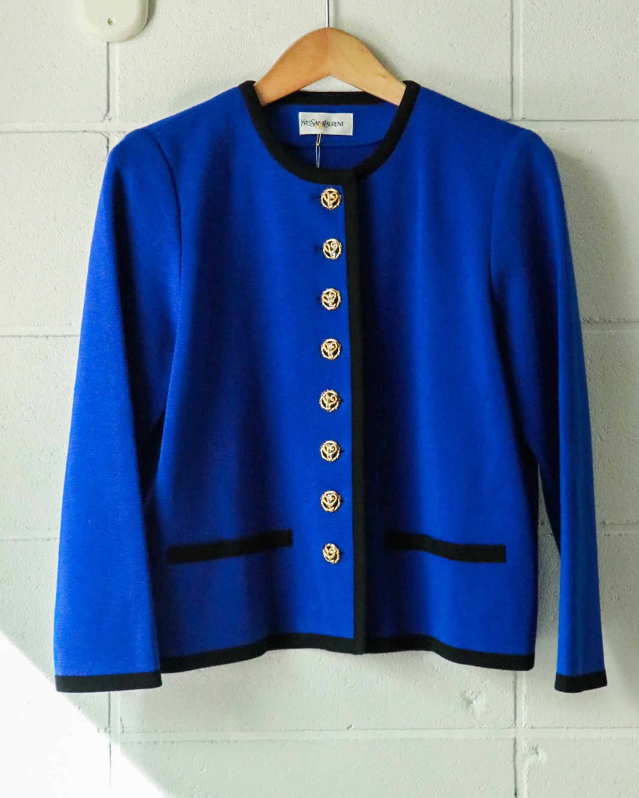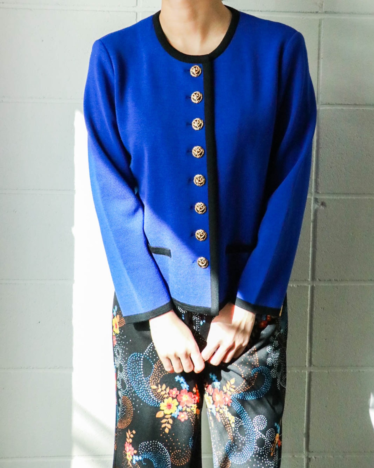 こちらのイブサンローランのカーディガンは鮮やかなブルーが解き放つオーラが魅力的。