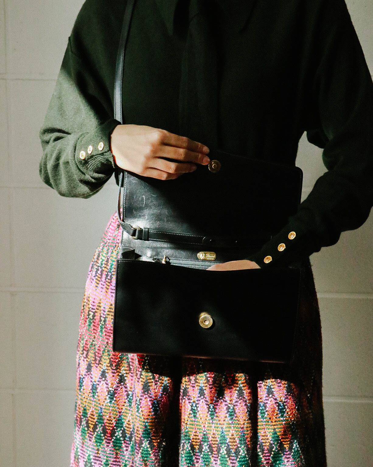 控えめなゴールドロゴとオールブラックレザーの仕様でエレガントな佇まいのオールドグッチショルダーバッグ。