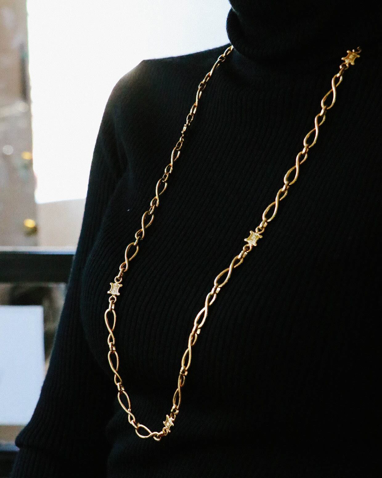 無地のプレーンなトップスやワンピースのアクセントにも大活躍。所々に付いたCelineのロゴが他と差をつけるポイントに。手持ちのネックレスとの重ねづけも楽しみたい。写真の様にベルトにしたりレイヤブレスレットとしても使えます。