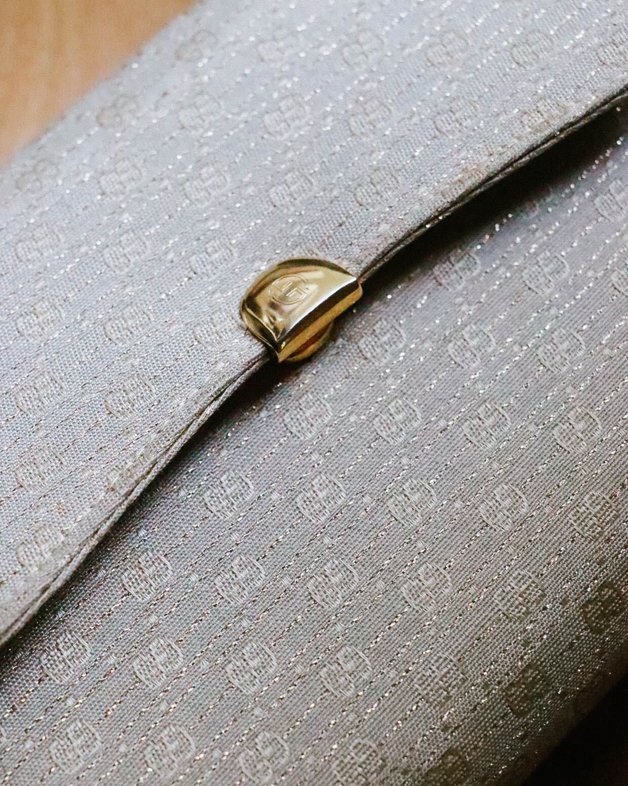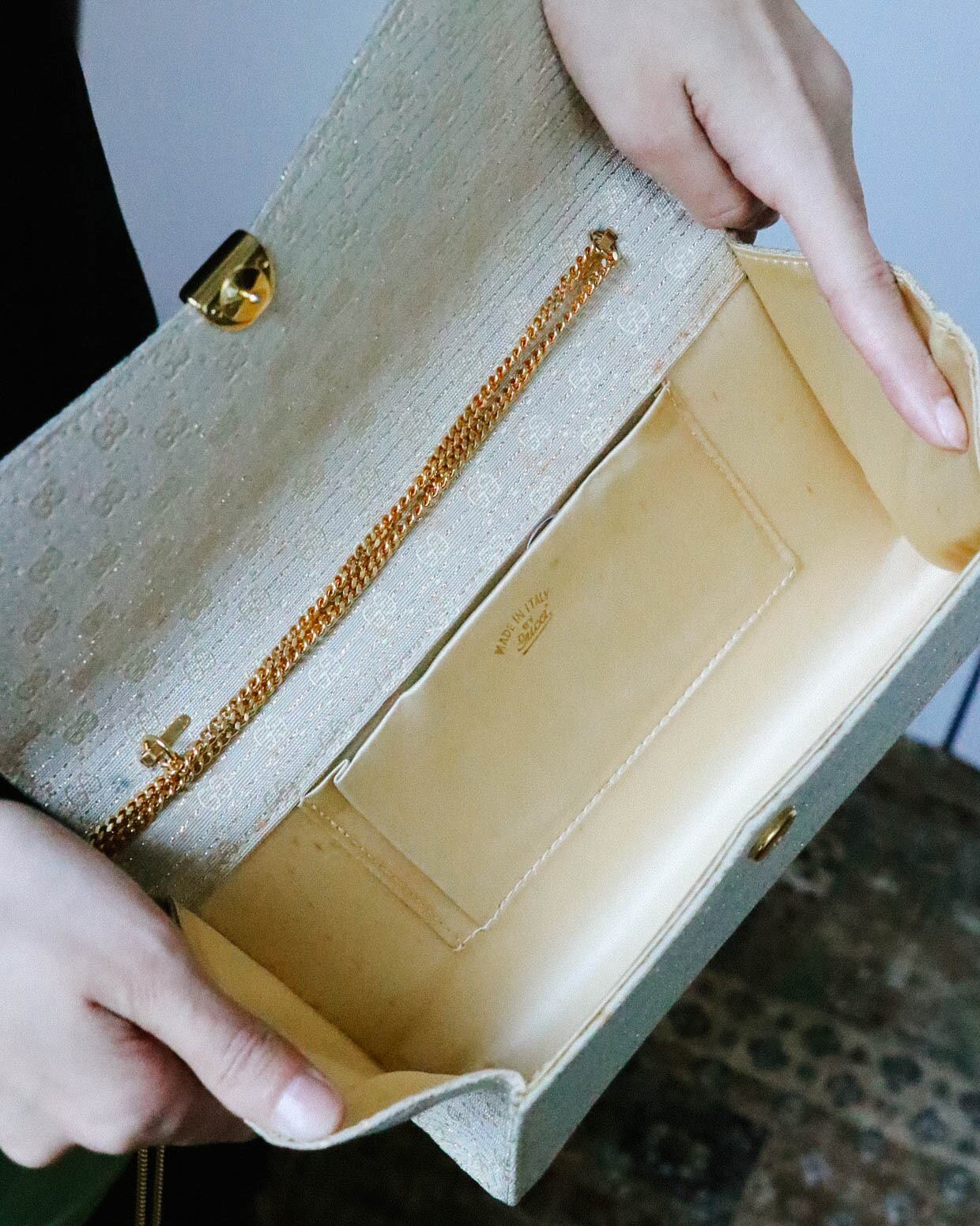 東洋の美意識をどこか感じさせる織物と、ゴールドのチェーンや金具の絶妙なバランスが奥ゆかしい。