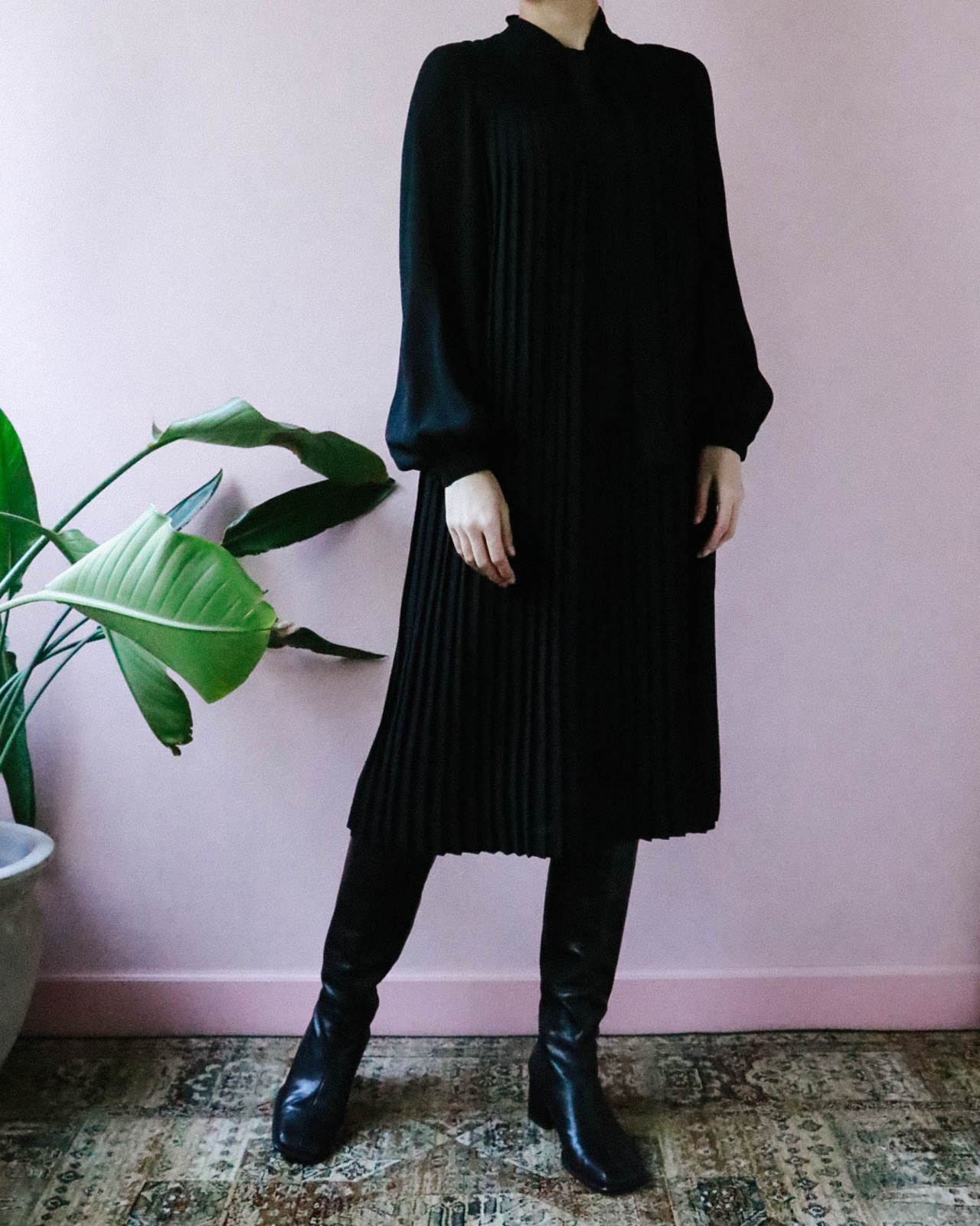 大人のフェミニンスタイルを演出するブラックドレスが入荷。胸元から繊細なプリーツが入ったデザインがとても流麗。