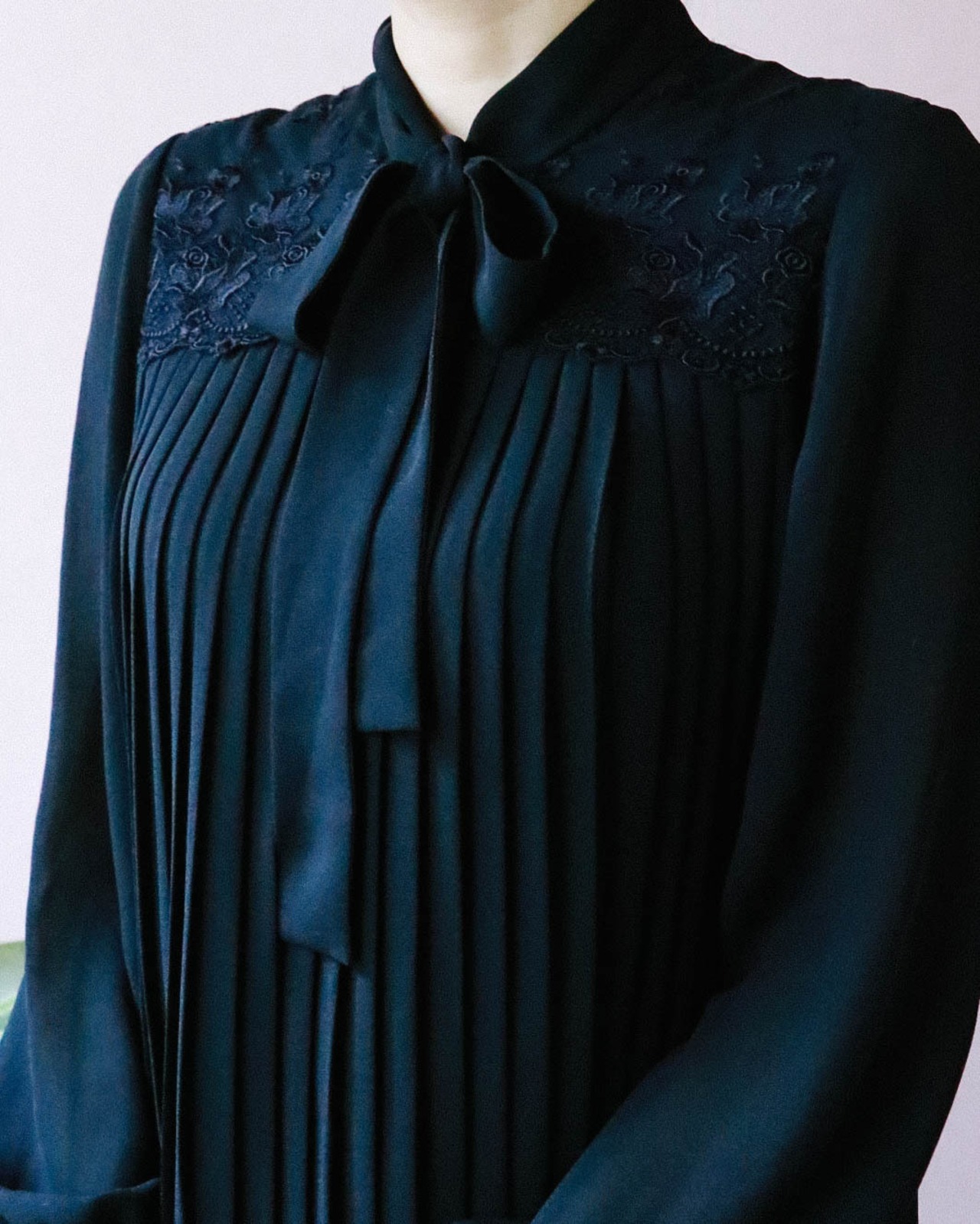 ボウタイはルーズにおろしてもきゅっと結んでも様になります。ゆったりとしたボディーで飽きがこないブラックワンピースは重宝します。