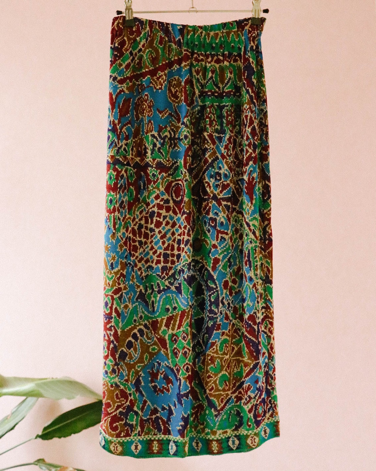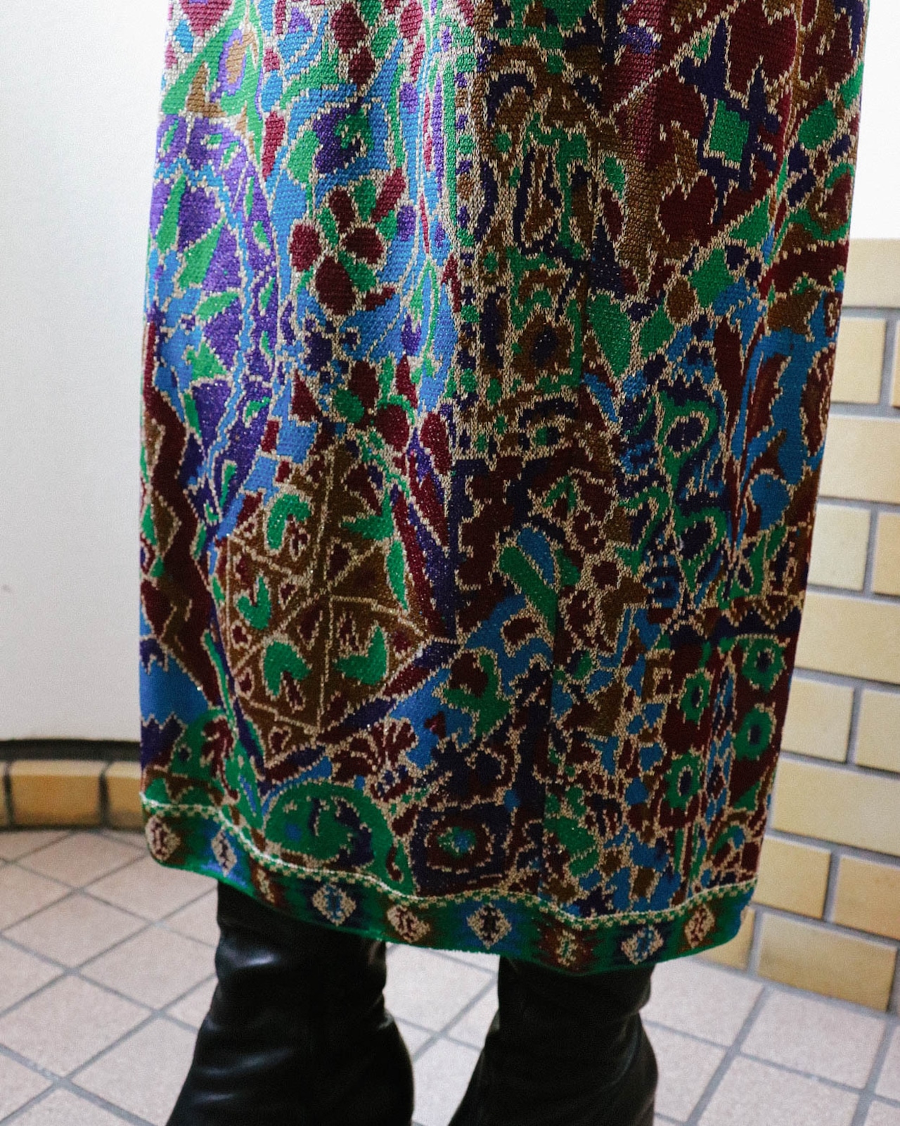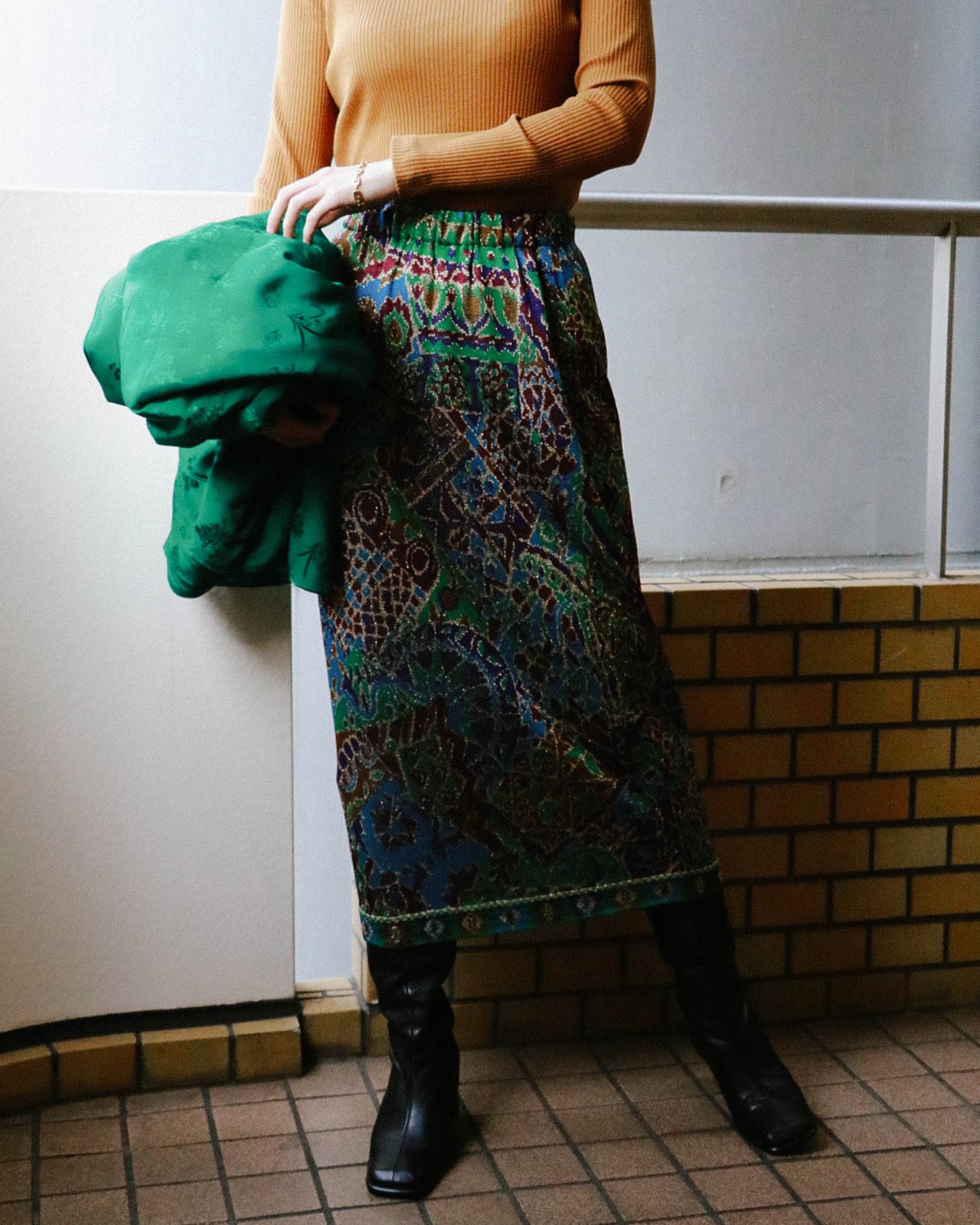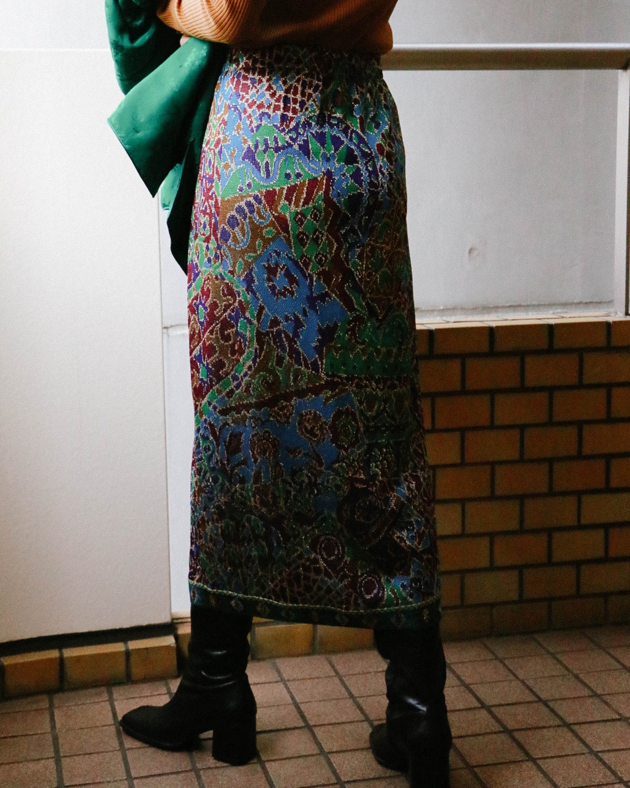 すとんと落ちた縦シルエットに幾何学模様が絶妙にデザインされたニットスカートはミッソーニのもの。