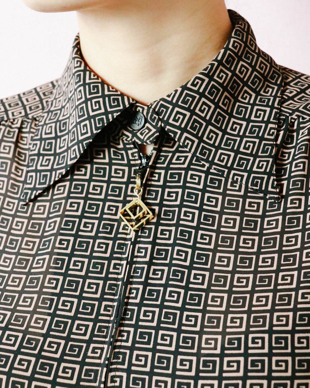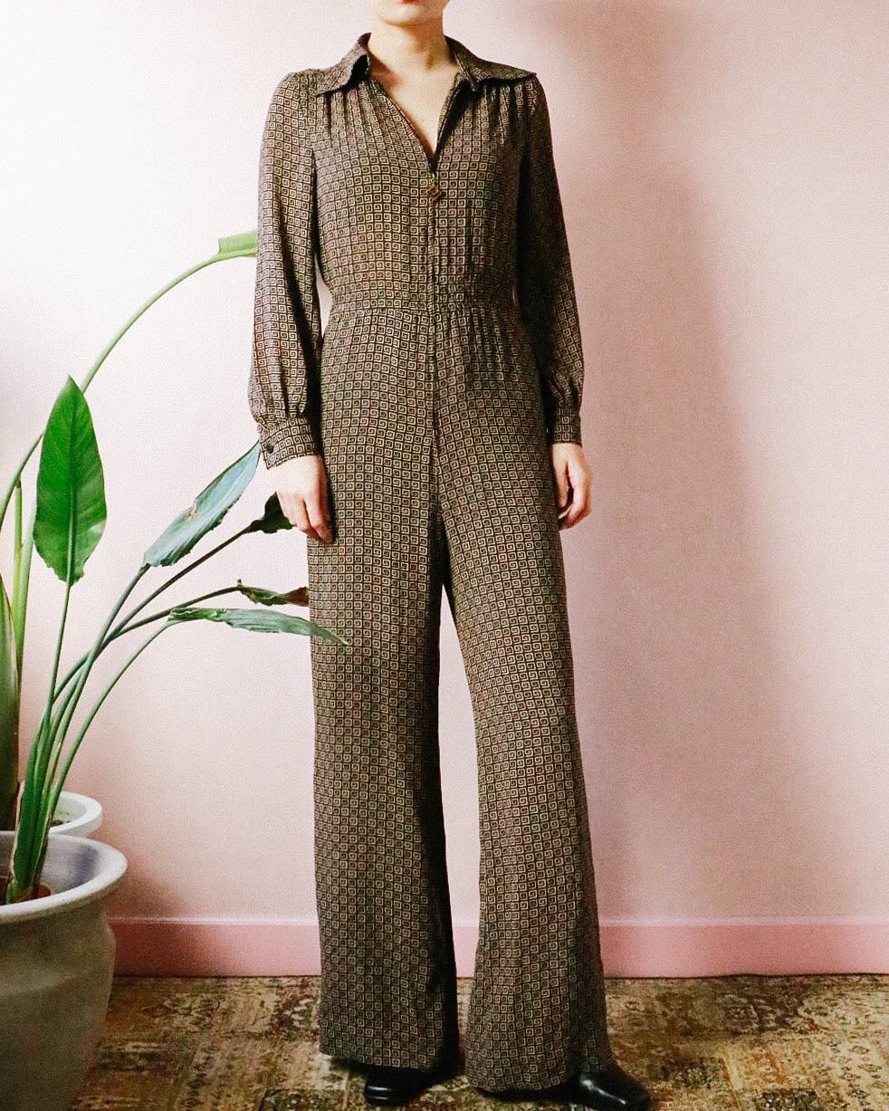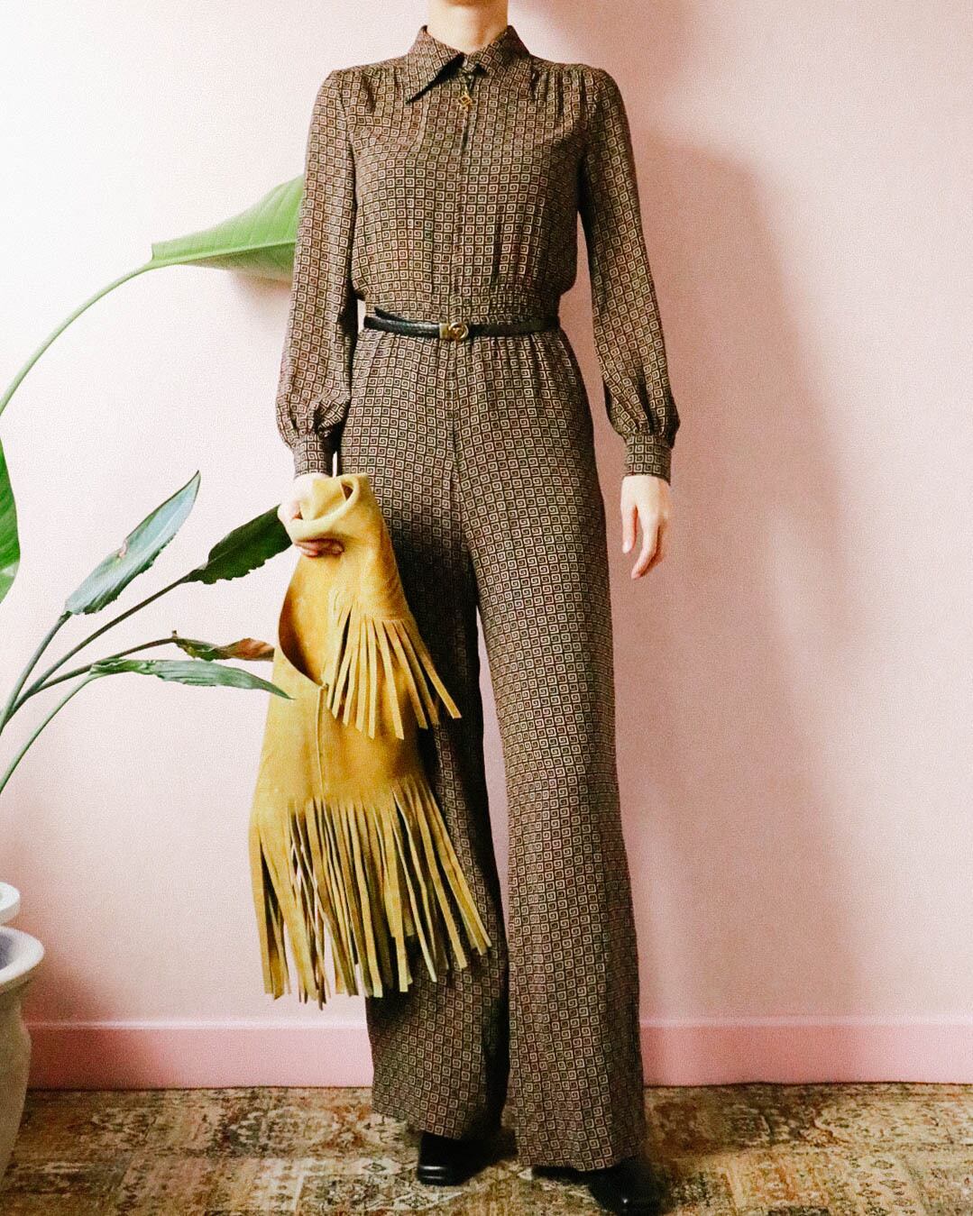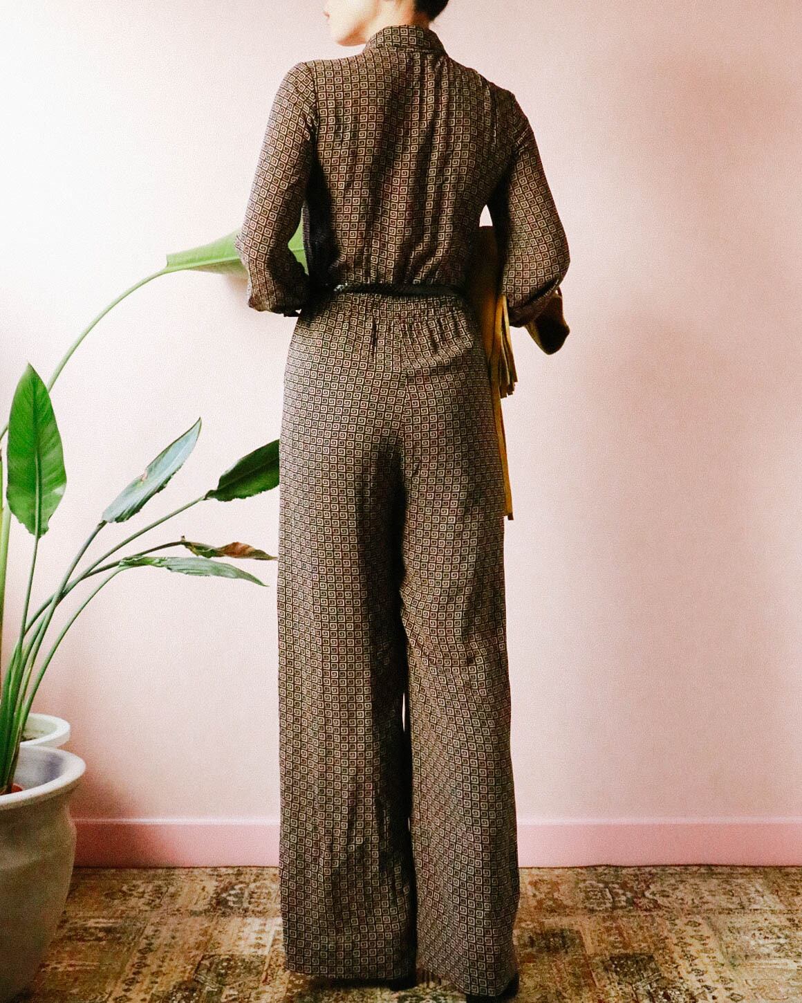 70年代をにわかに彷彿させるでか襟や、やや広がりのあるパンツシルエット。