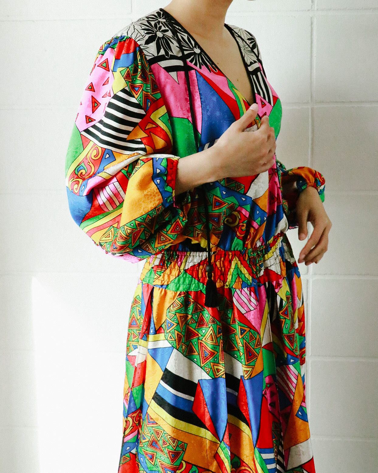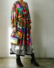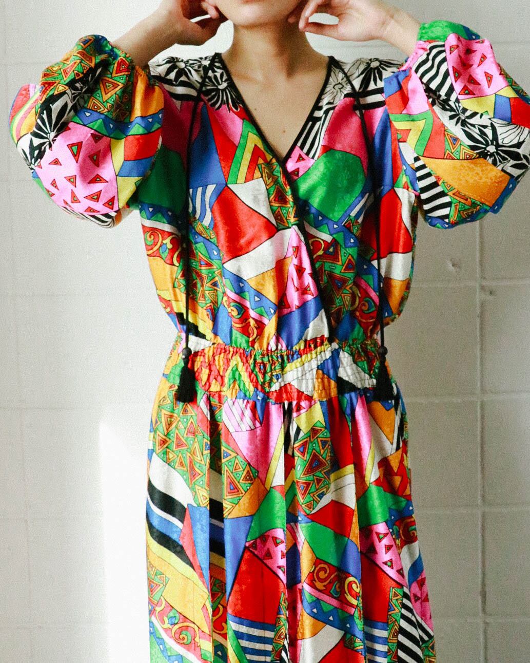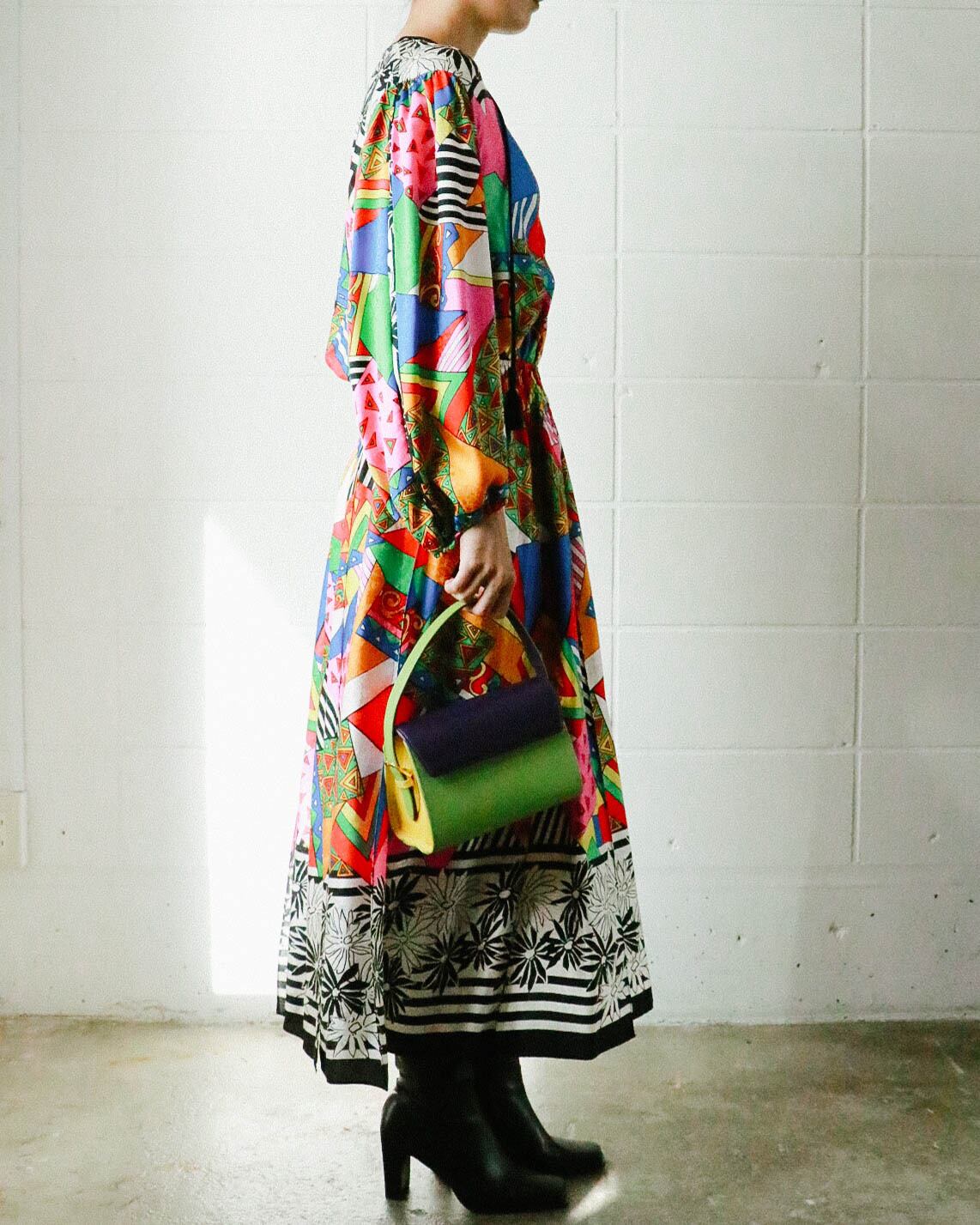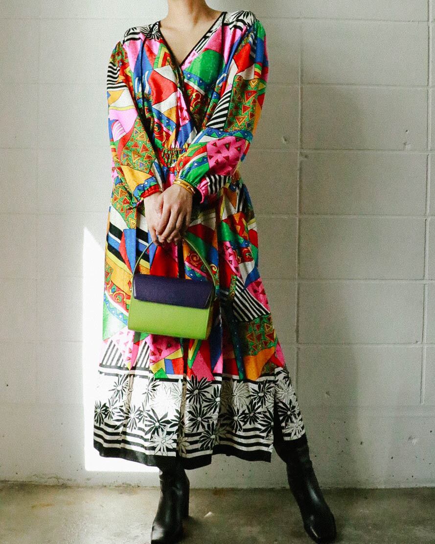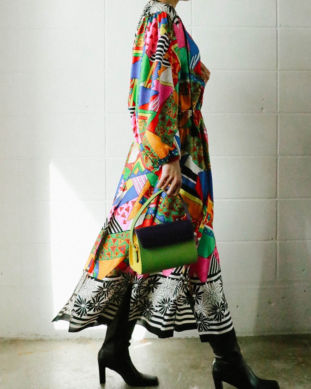 幾何学柄とカラフルなデザインにわくわくさせられるこちらのドレスは、大人気ダイアンフレイスのもの。シルク素材で軽やか且つエクスクルーシブ感のある一着。歩くたびに優雅に踊るスカートのカッティングもかっこいいです。