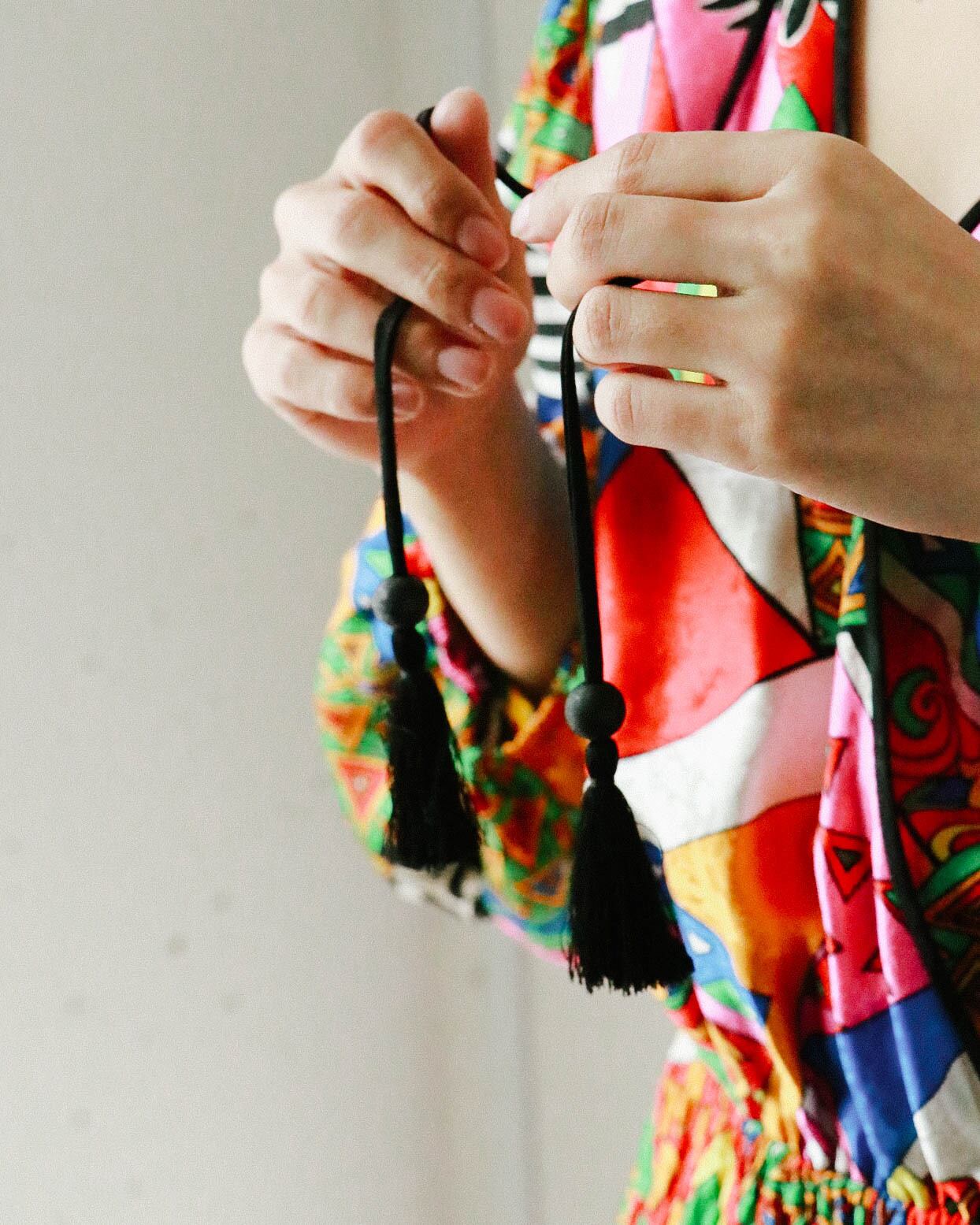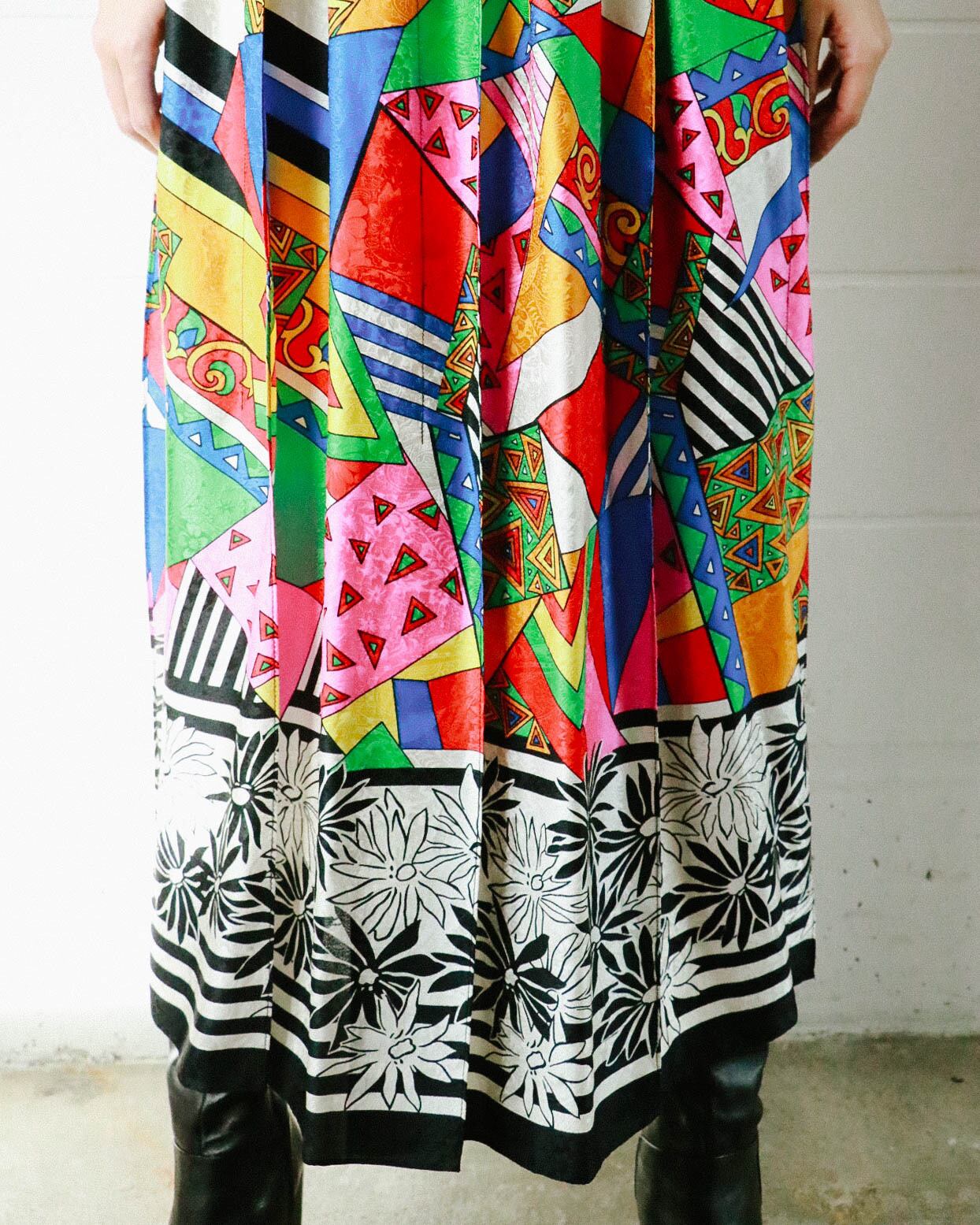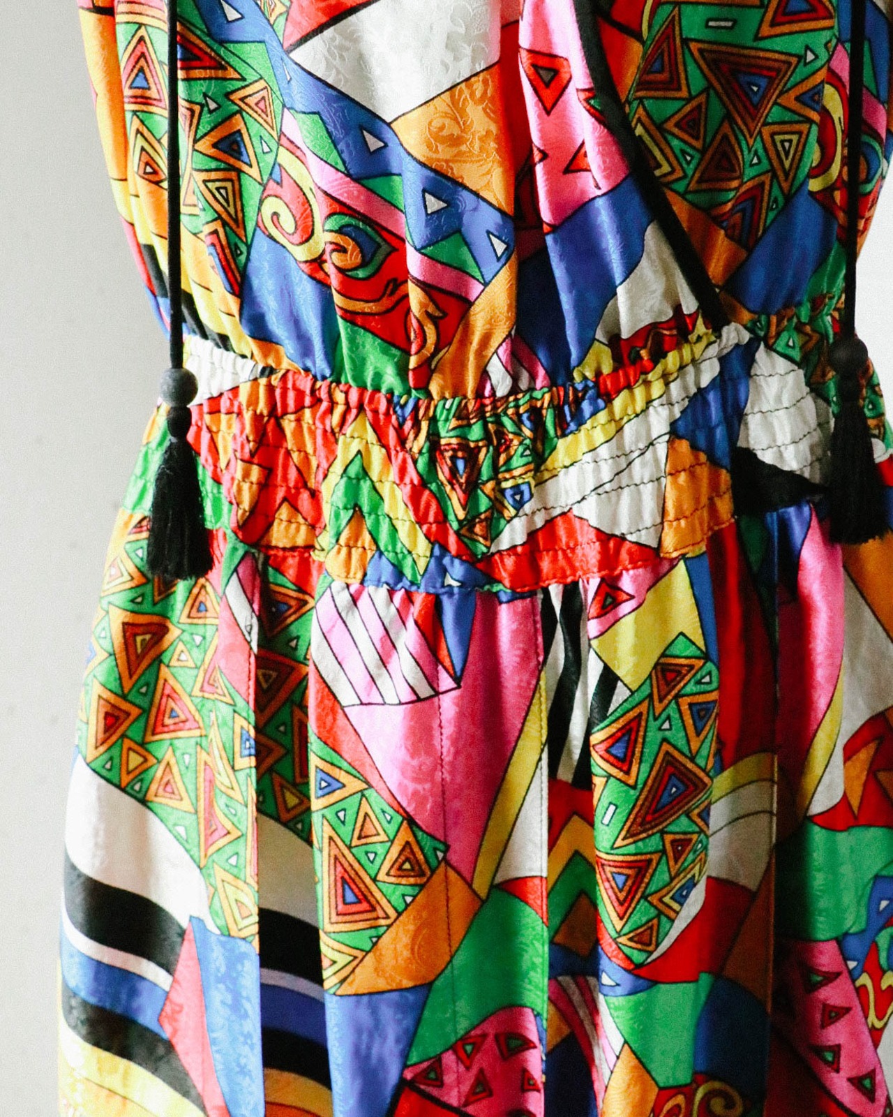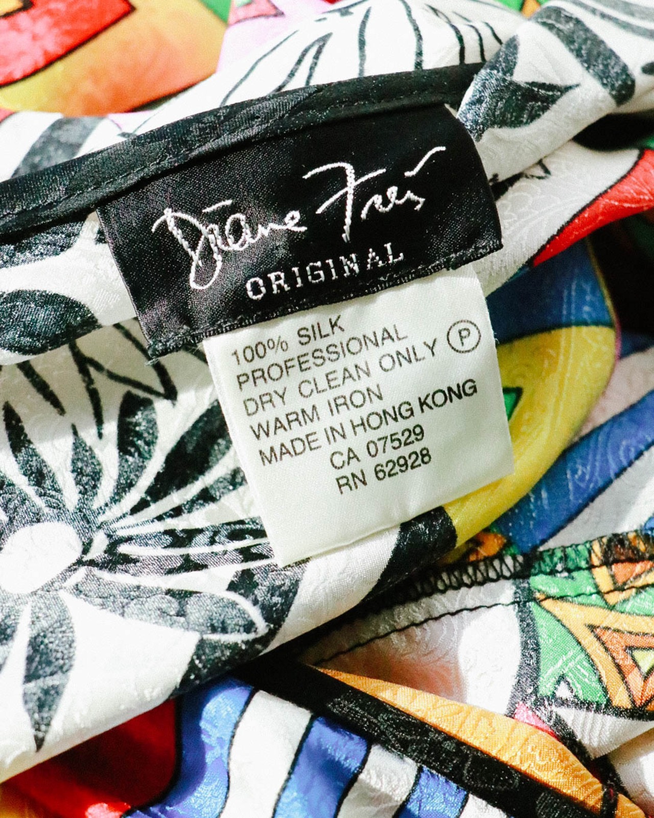 幾何学柄とカラフルなデザインにわくわくさせられるこちらのドレスは、大人気ダイアンフレイスのもの。シルク素材で軽やか且つエクスクルーシブ感のある一着。歩くたびに優雅に踊るスカートのカッティングもかっこいいです。