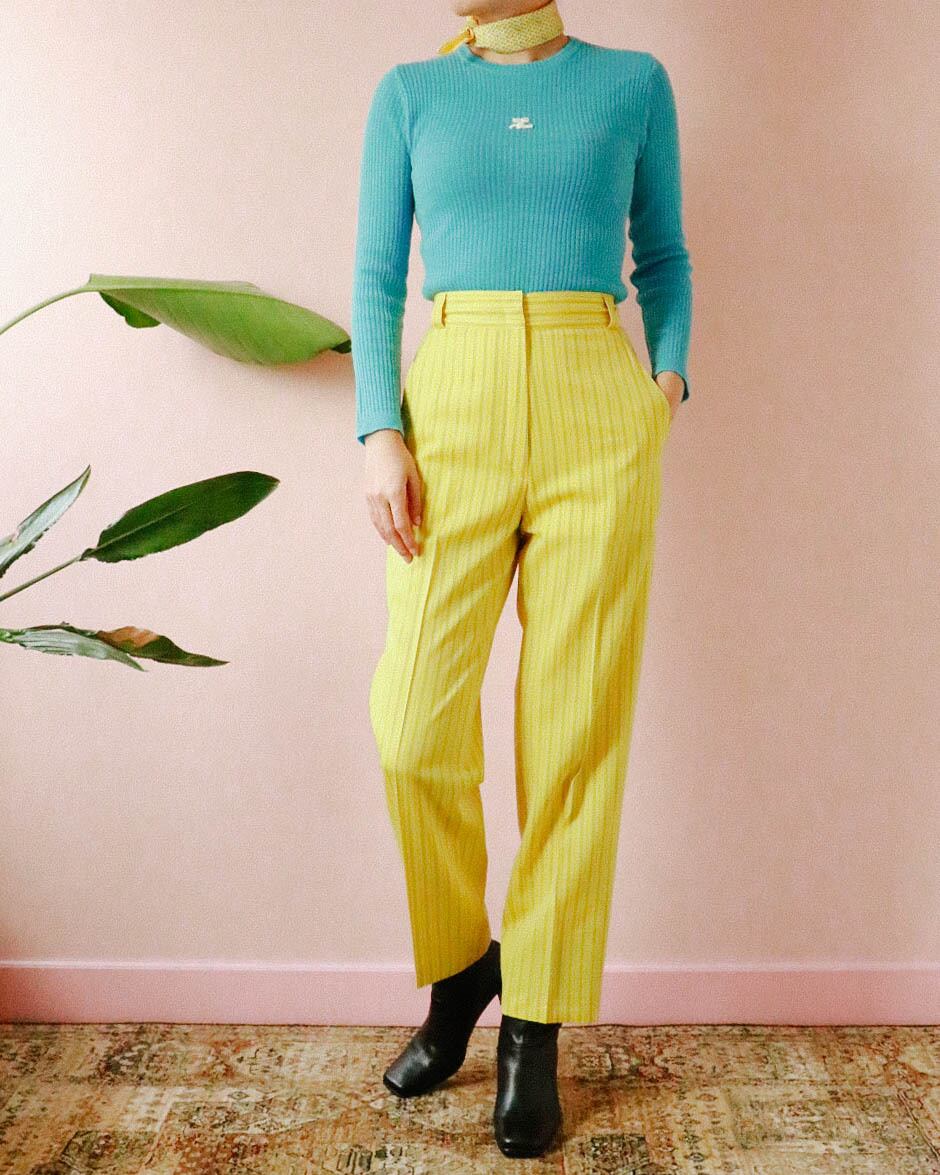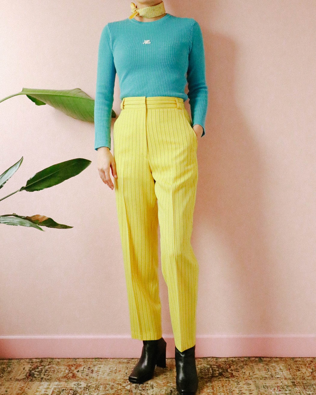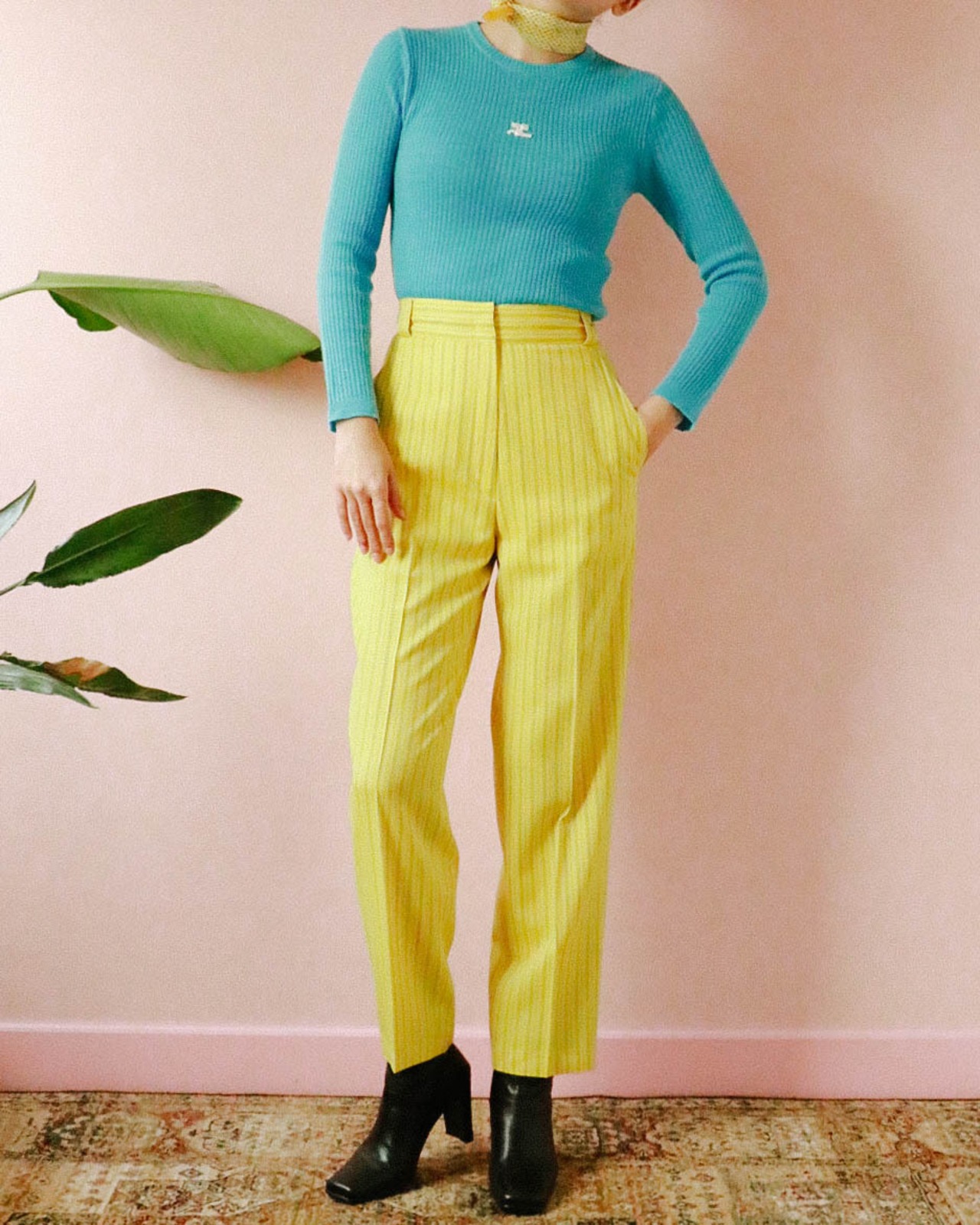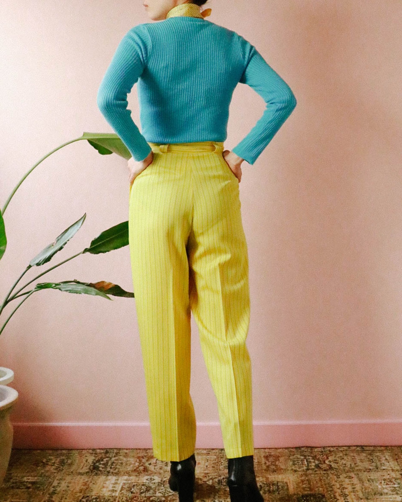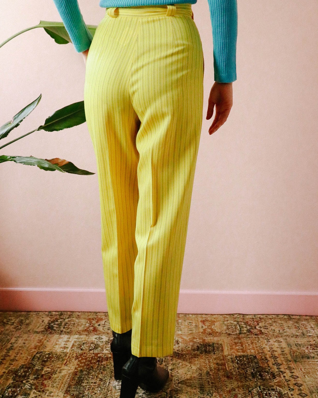 ひまわりのような明るいイエローを基調としたストライプパンツが入荷。