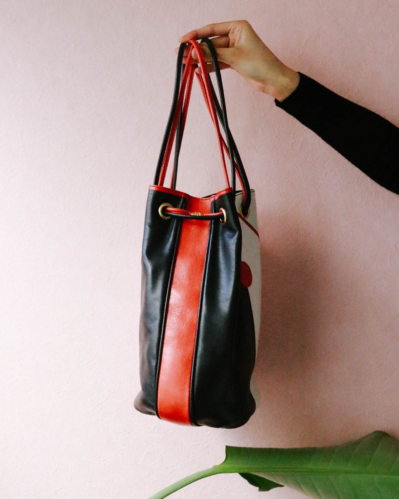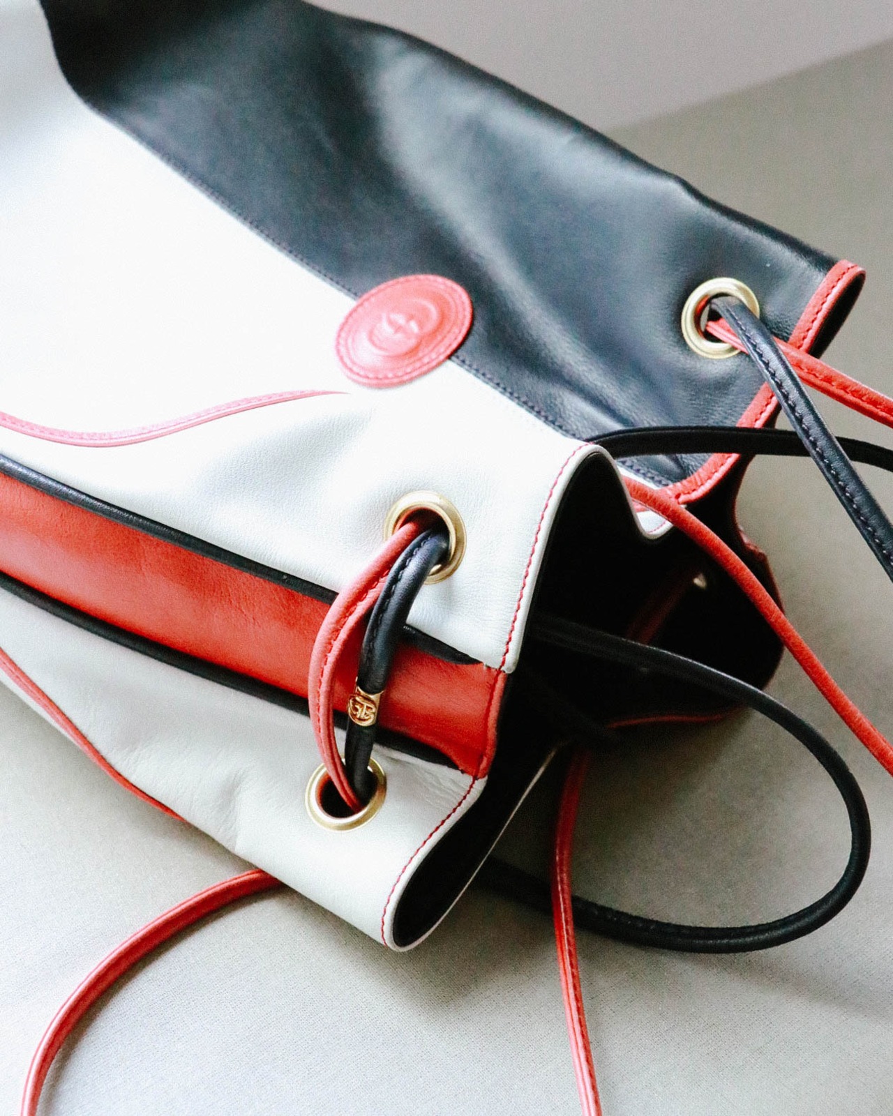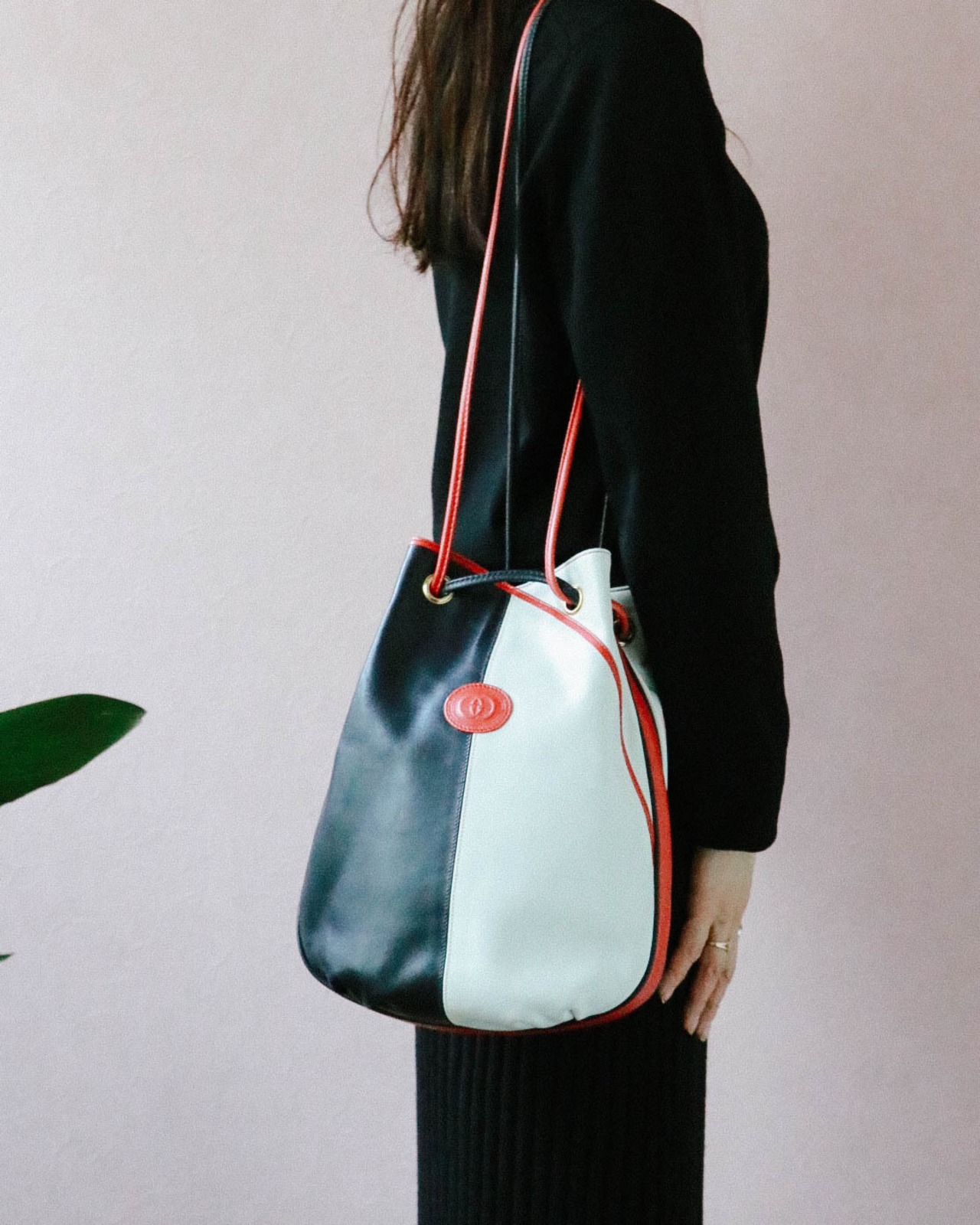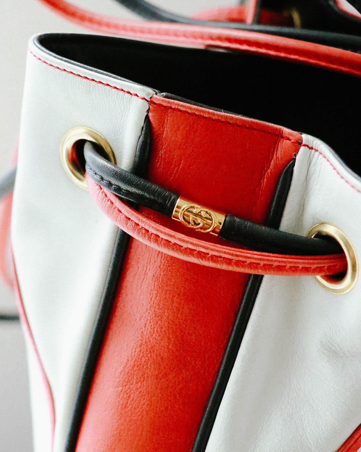 トリコロールカラーと配色バランスがとても個性的でキュートなバッグはオールドグッチのもの。巾着型ですがロングショルダーとしても持つことが可能な自由度の高いデザインです。