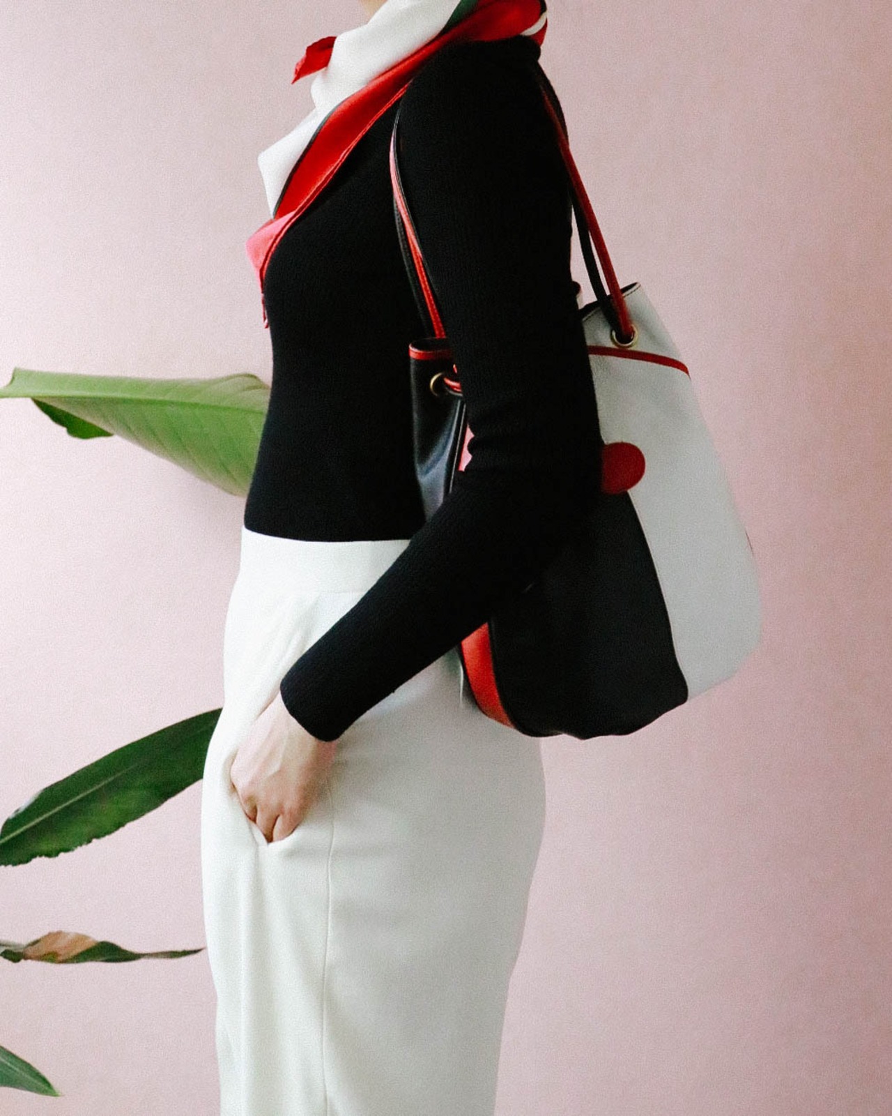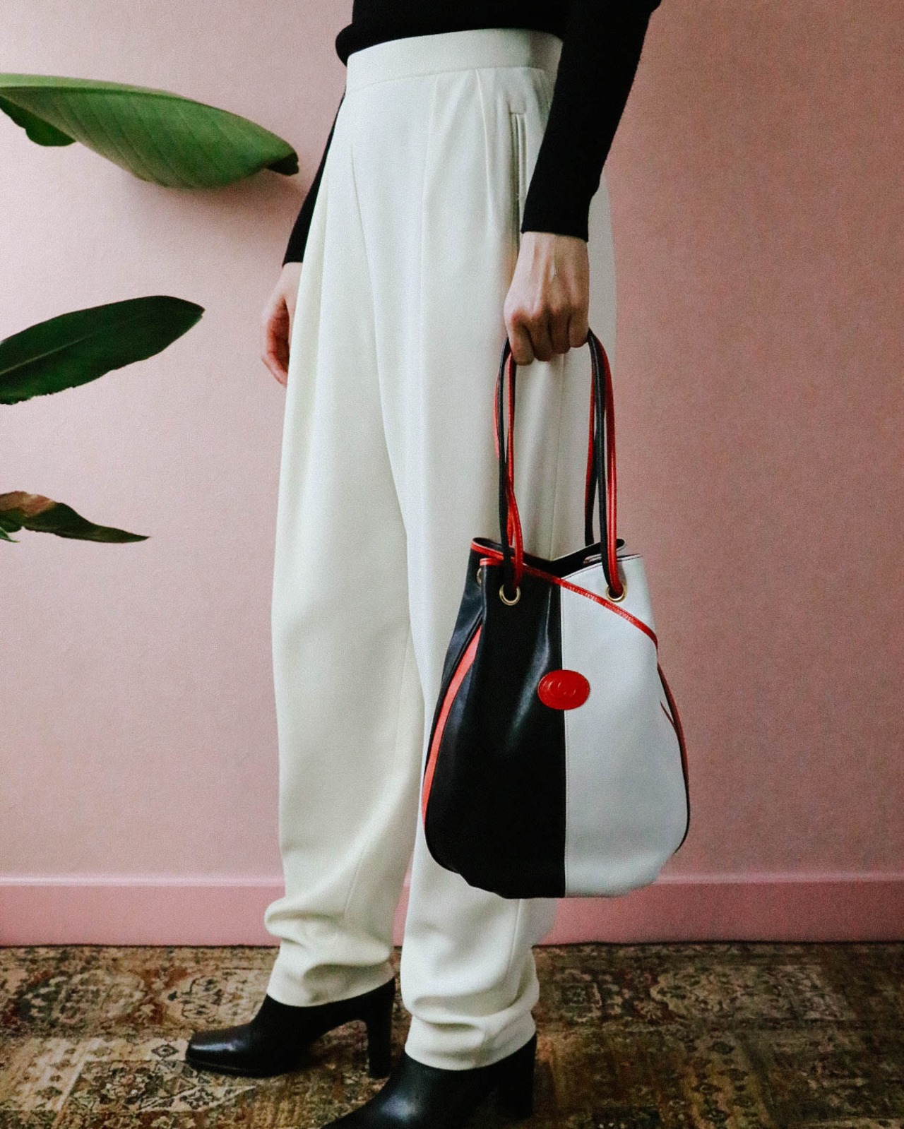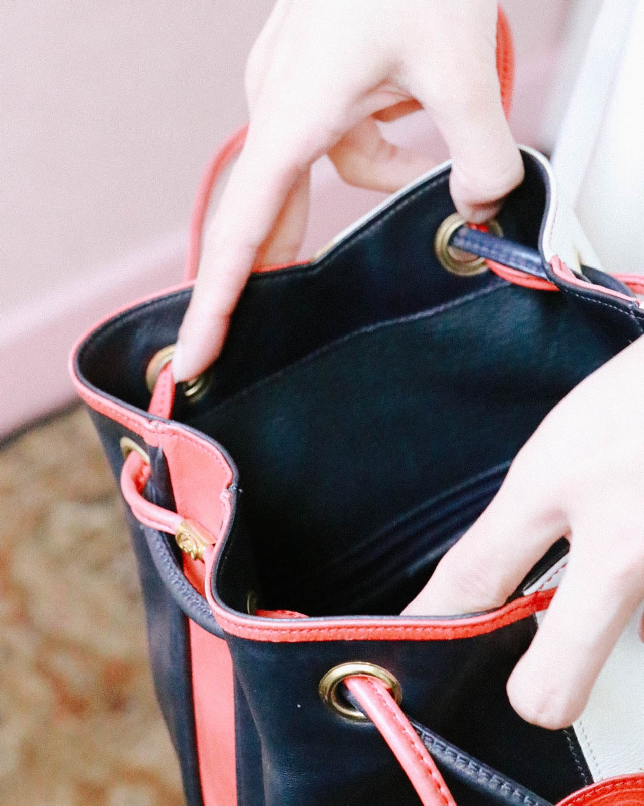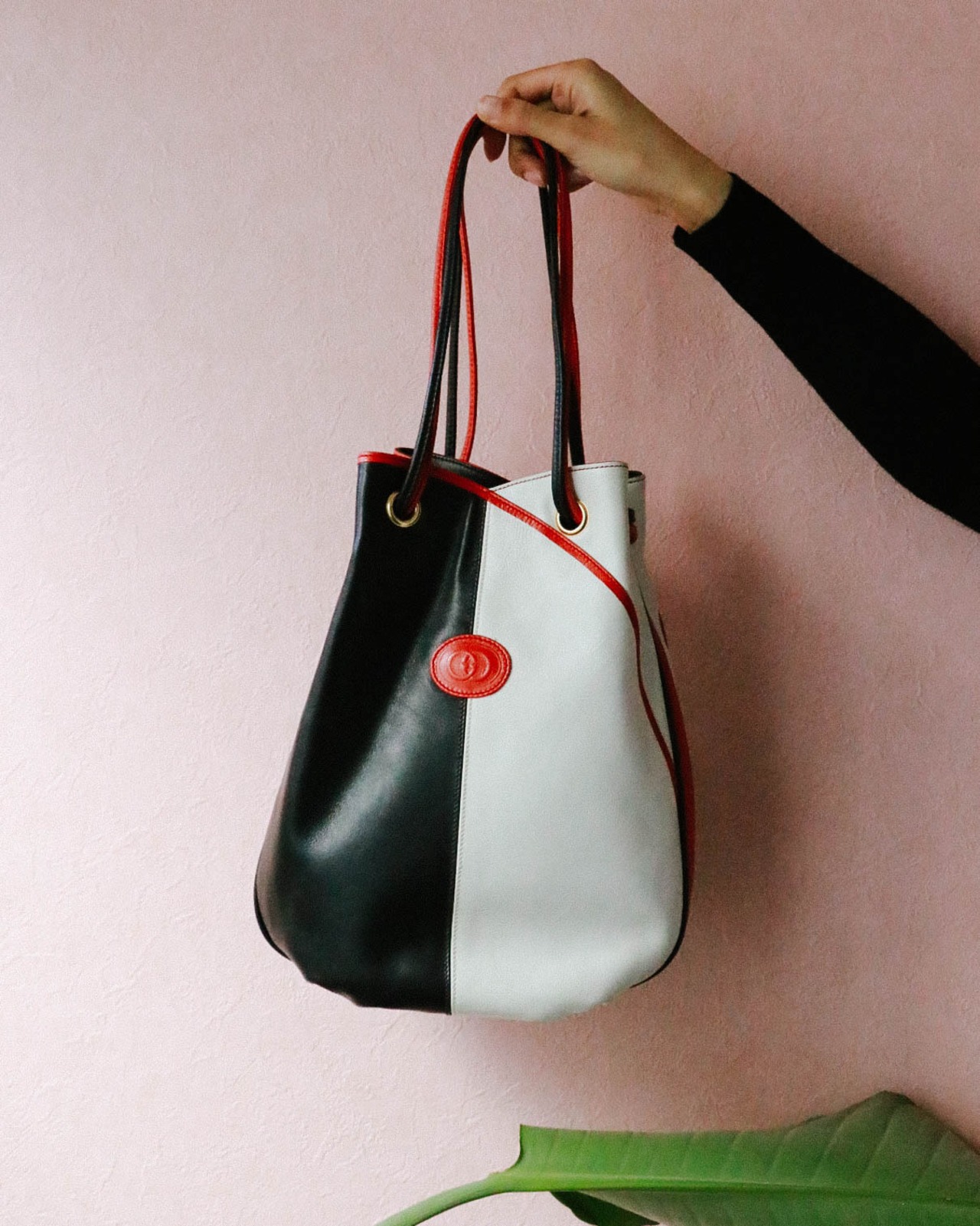 トリコロールカラーと配色バランスがとても個性的でキュートなバッグはオールドグッチのもの。巾着型ですがロングショルダーとしても持つことが可能な自由度の高いデザインです。