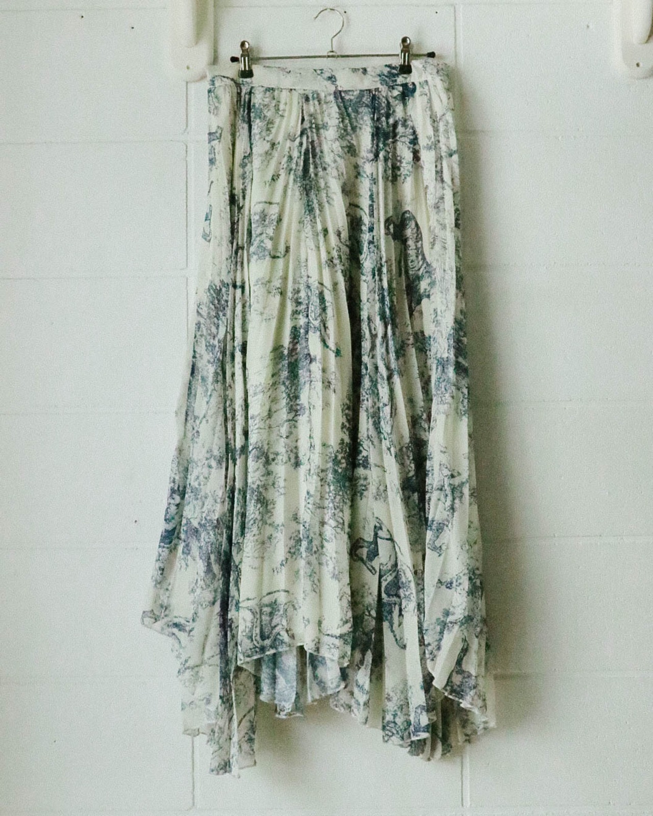 あっさりとした素材感のアニマルモチーフロングプリーツ スカート。フレアの美シルエットが歩くたびにボディーラインを綺麗に表現します。タイムレスで使えるホワイトベーススカート。カジュアルな普段着のような着心地とエレガントさがうまくミックスされた一着です。
