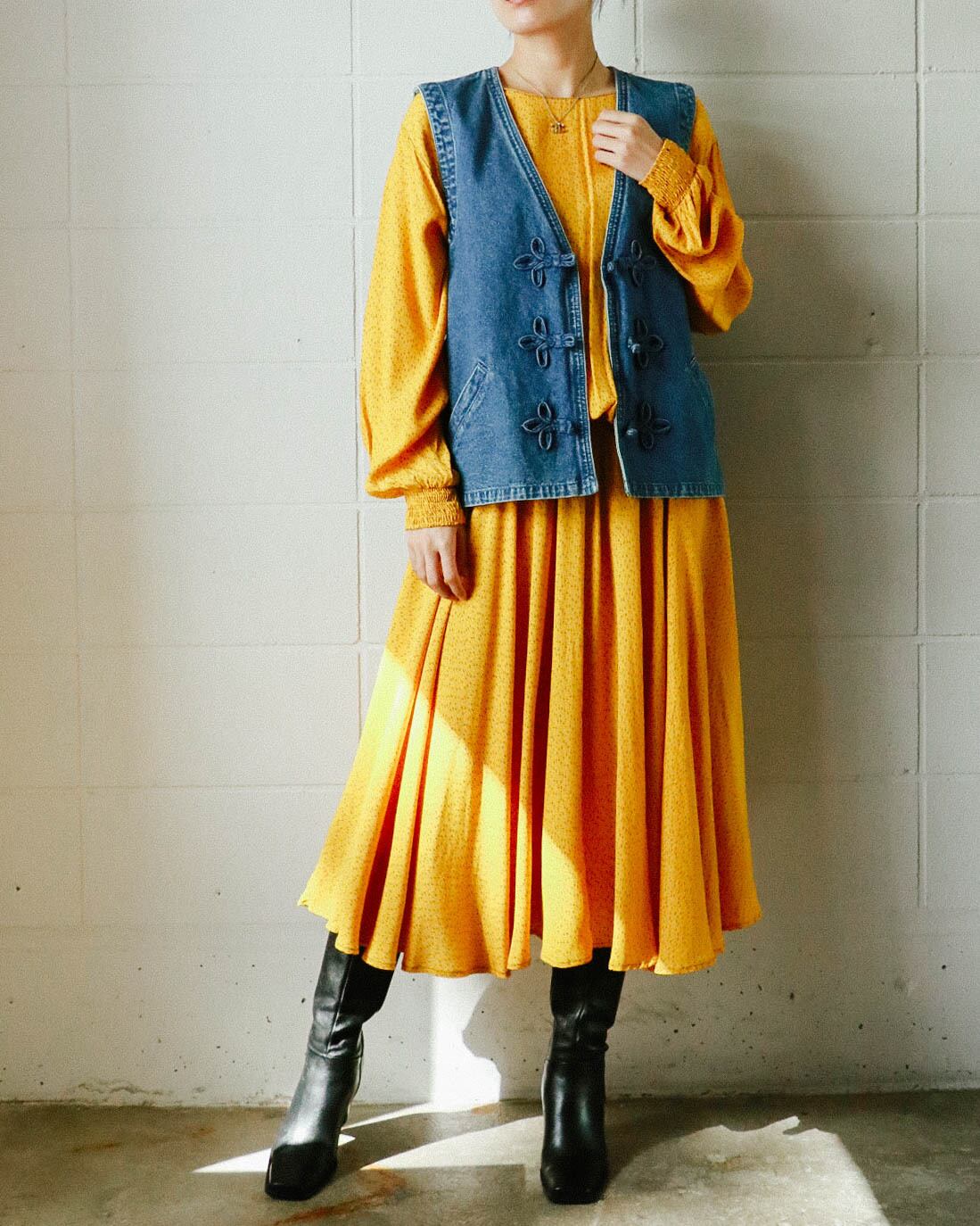 これからの季節に ぴったりのデニムベスト。チャイナ風のボタンが全体のボディーにアクセントを与えてくれます。写真のようにワンピースやTシャツ、ブラウスなどの上に重ねて、センスアップしたコーディネートを楽しんでみてはいかがでしょうか。