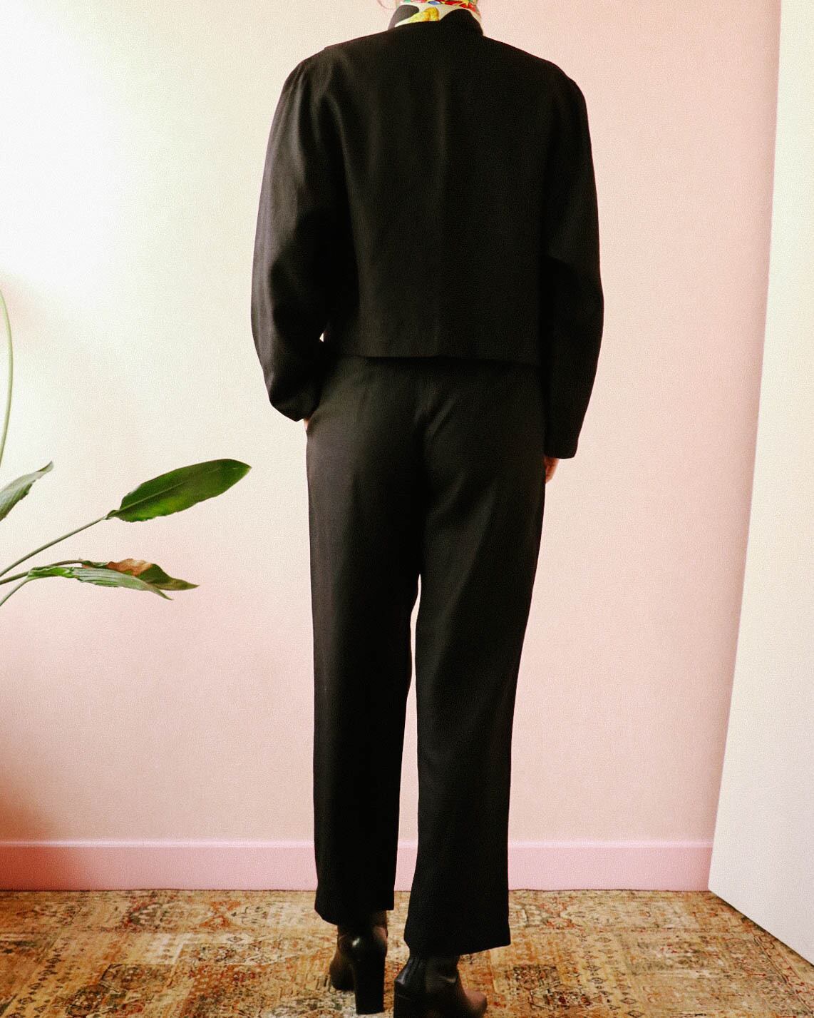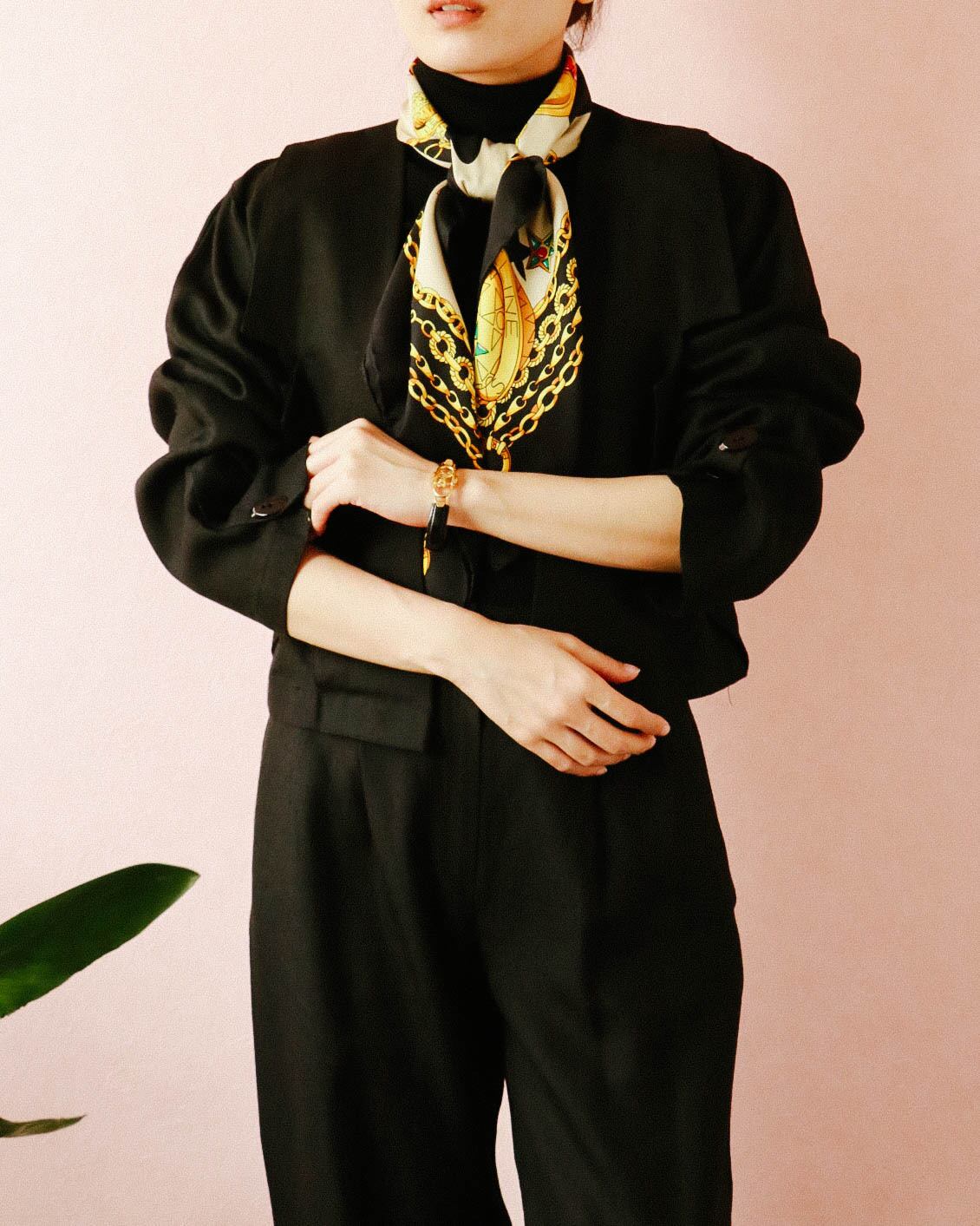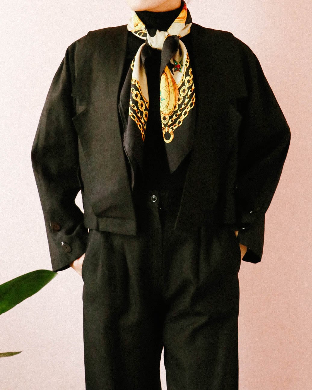 こちらは、春らしい素材感に気分も軽くなる80'sのブラックジャケット。
