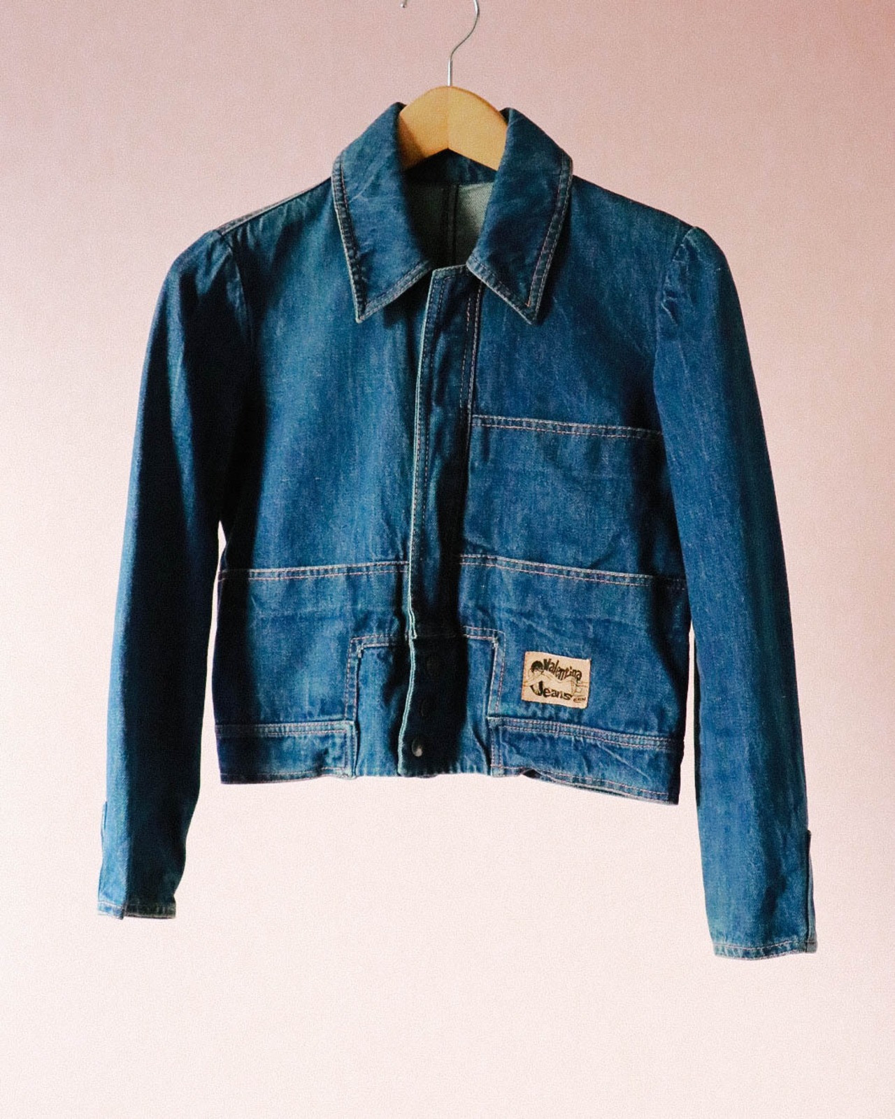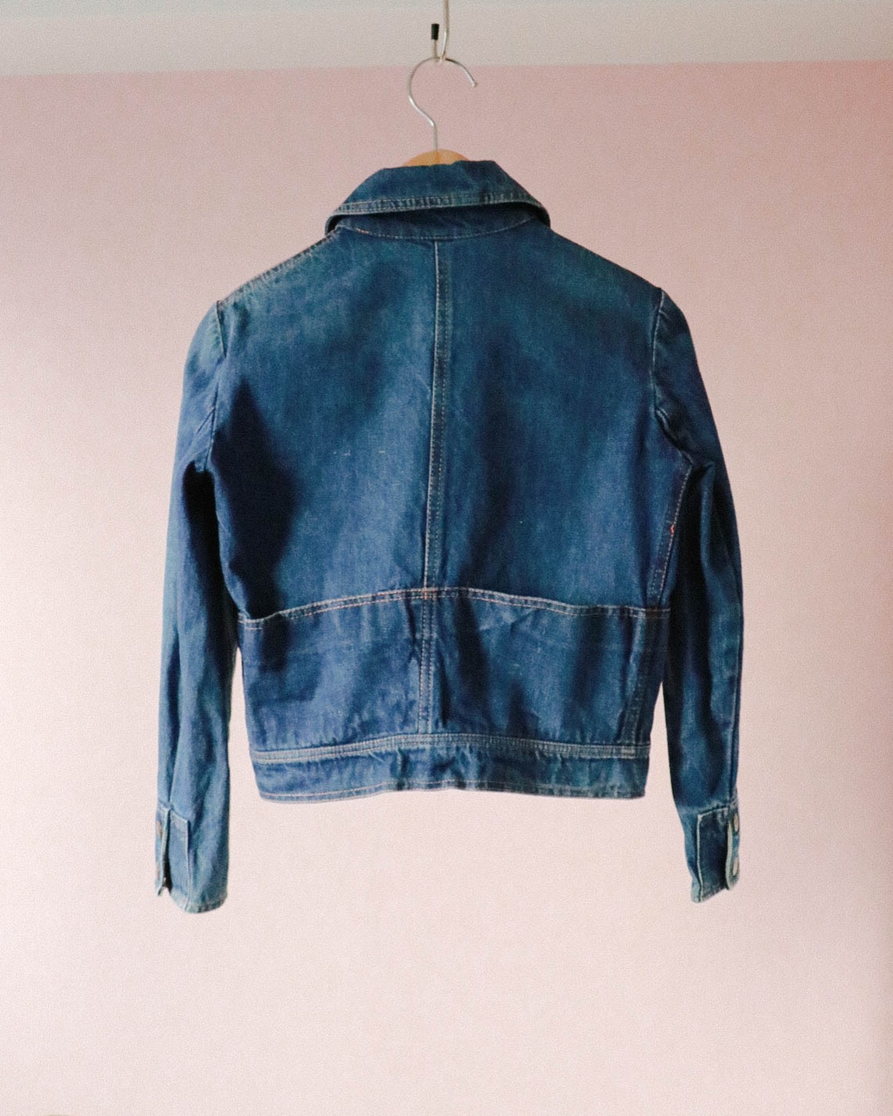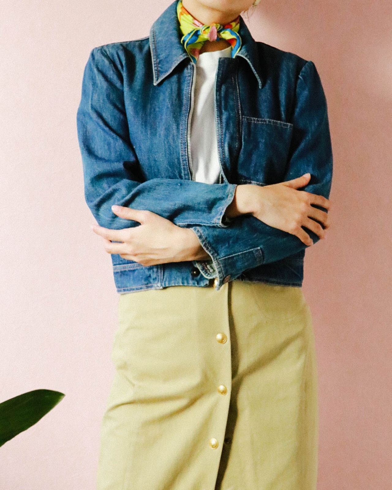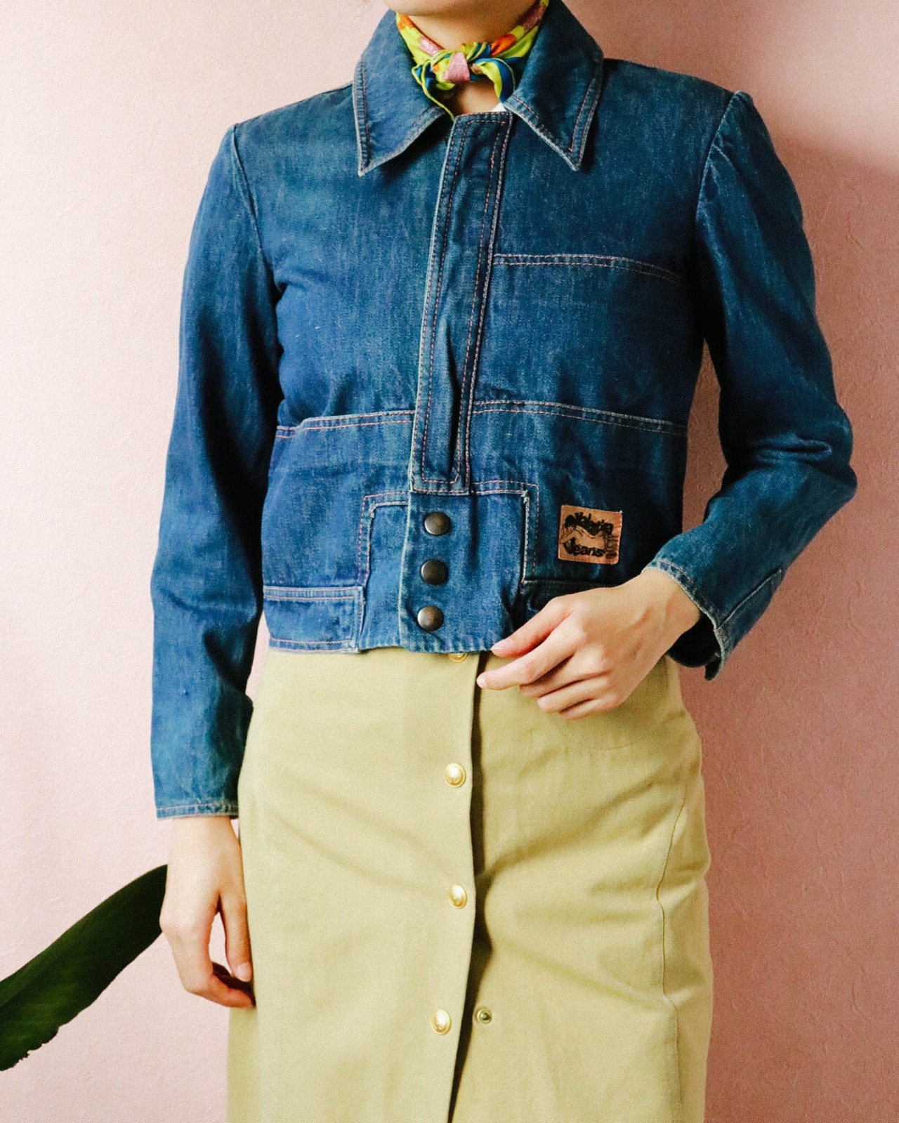クロプド丈のデニムジャケットは70年代のヴィンテージ。トレンドに流される事のないレアなデザインは愛着をもってずっと着れるのが良いところ。シャープな襟元、絶妙な丈感、ボディーには可愛いポケットが全体的に拘った一着。フィット感のあるサイズで、インナーにはこれからの季節Tシャツやタンクトップなどを合わせて春ファッションをお楽しみください。