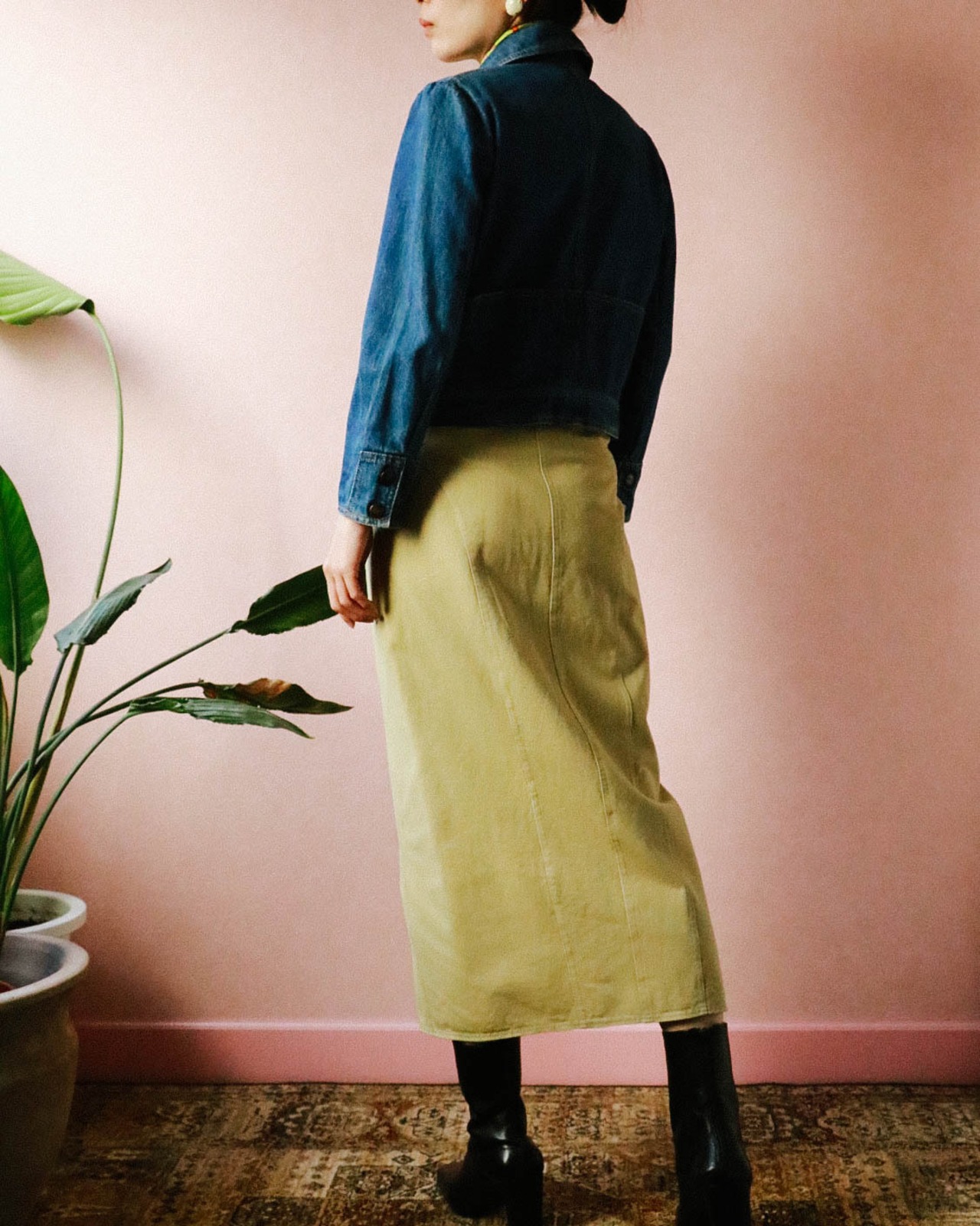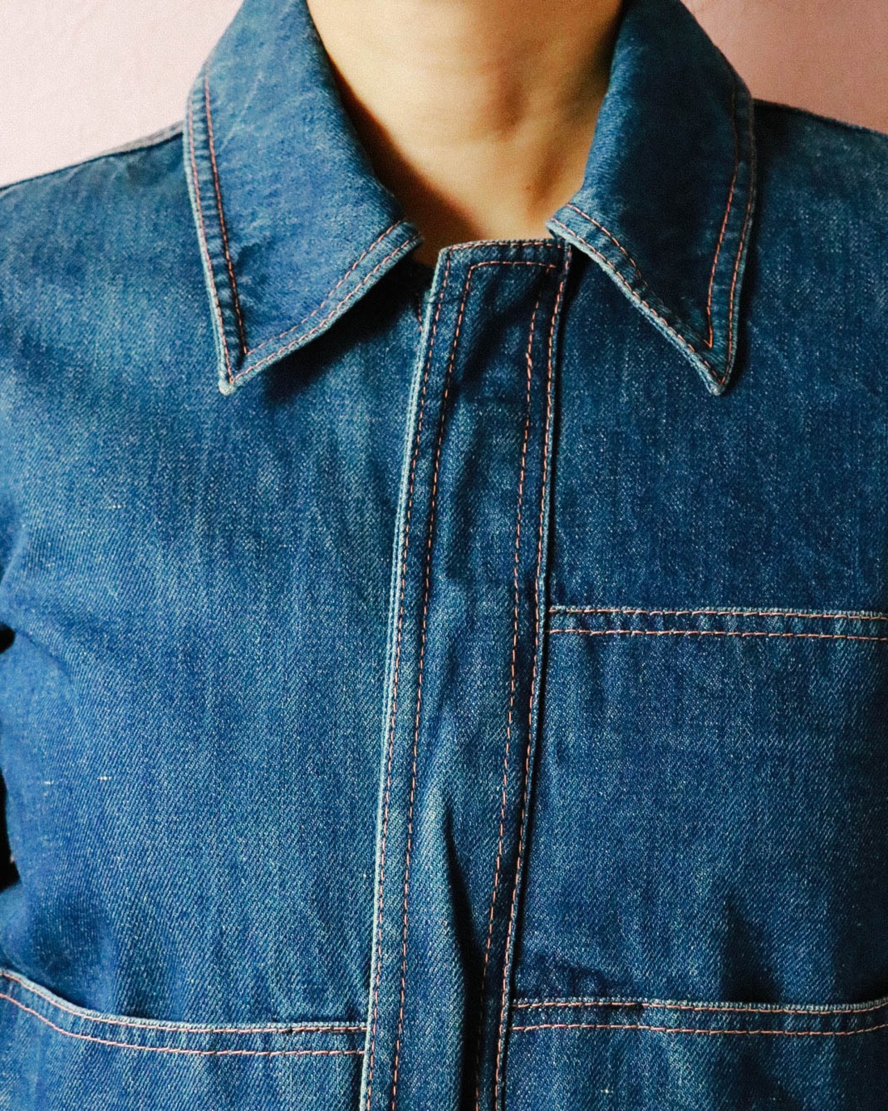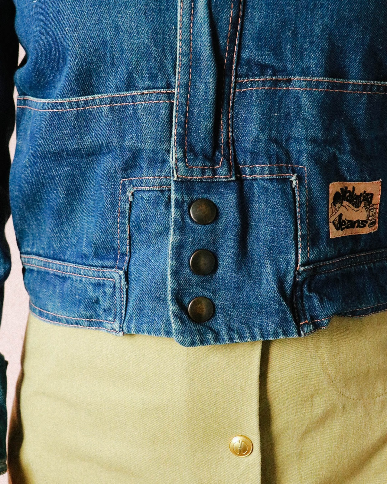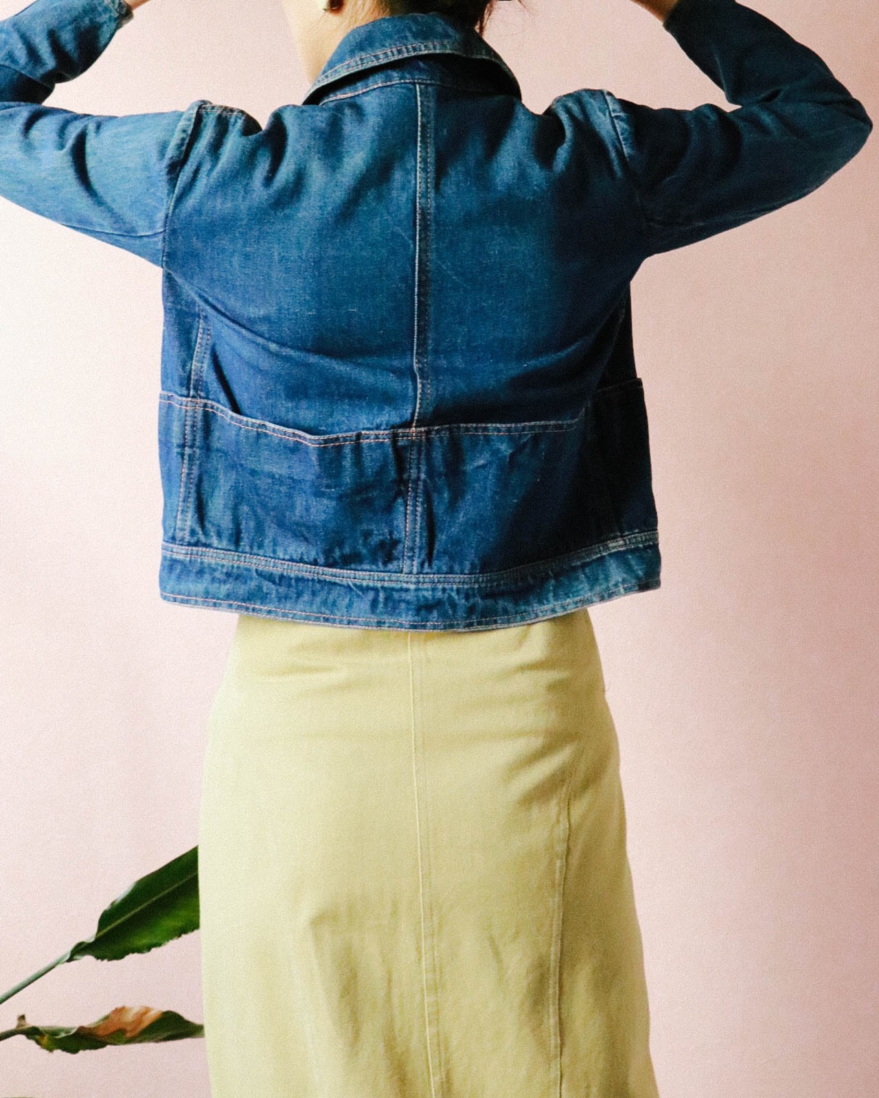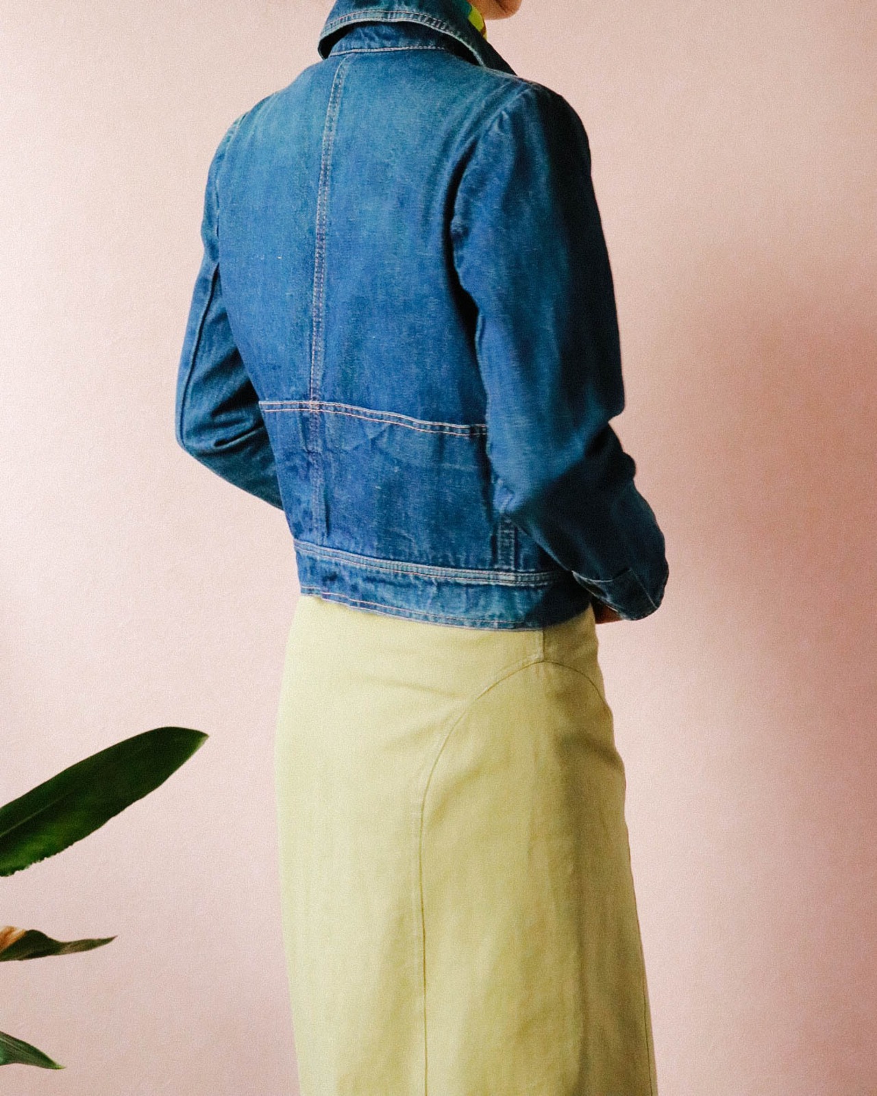 クロプド丈のデニムジャケットは70年代のヴィンテージ。トレンドに流される事のないレアなデザインは愛着をもってずっと着れるのが良いところ。シャープな襟元、絶妙な丈感、ボディーには可愛いポケットが全体的に拘った一着。フィット感のあるサイズで、インナーにはこれからの季節Tシャツやタンクトップなどを合わせて春ファッションをお楽しみください。