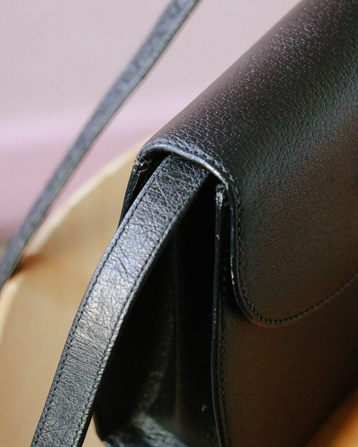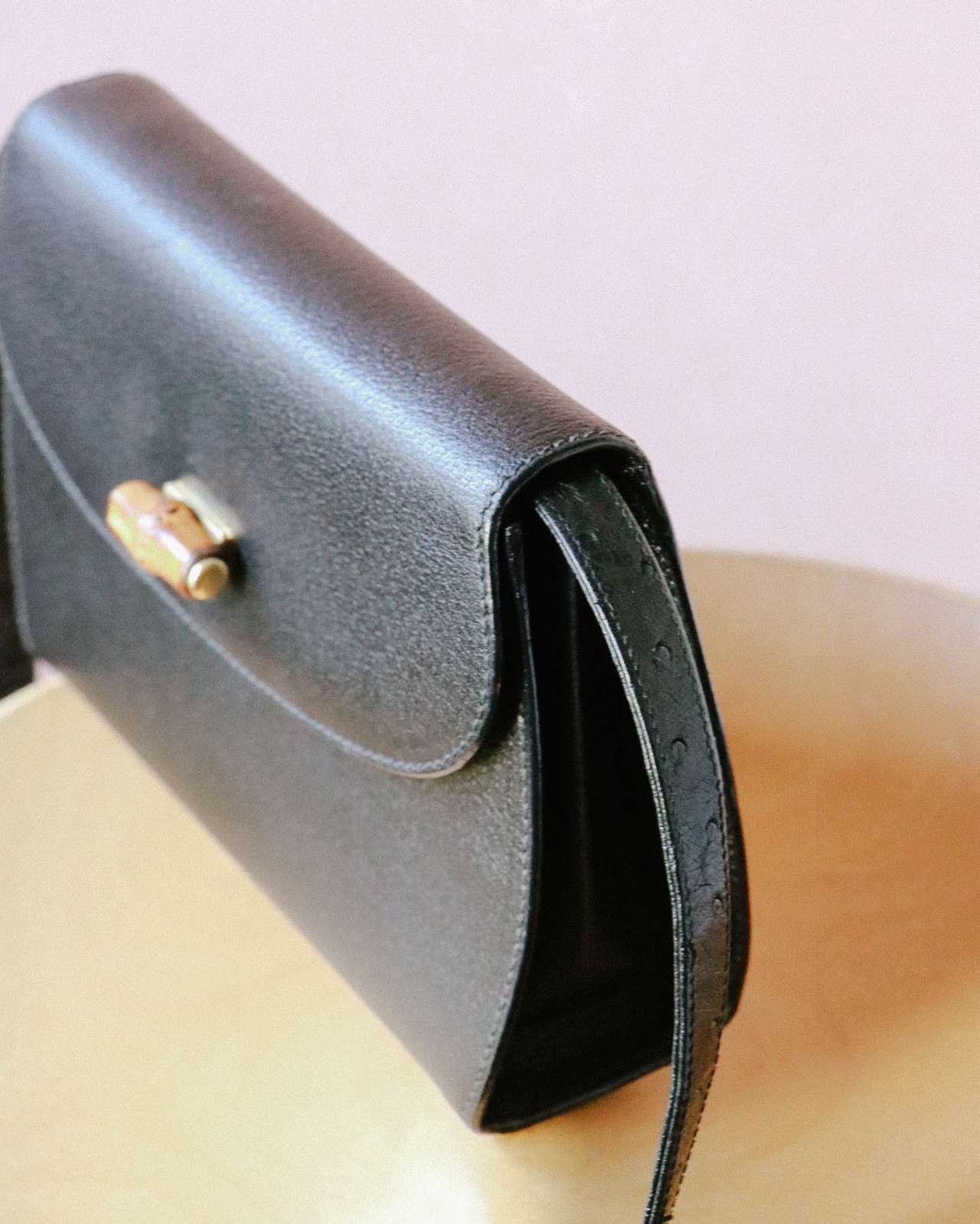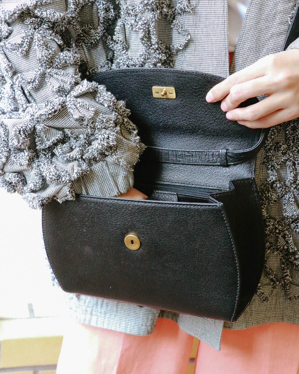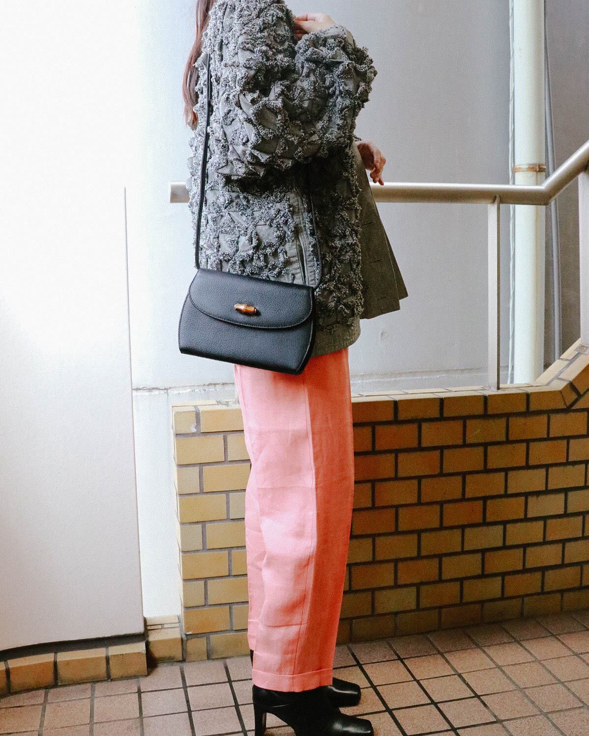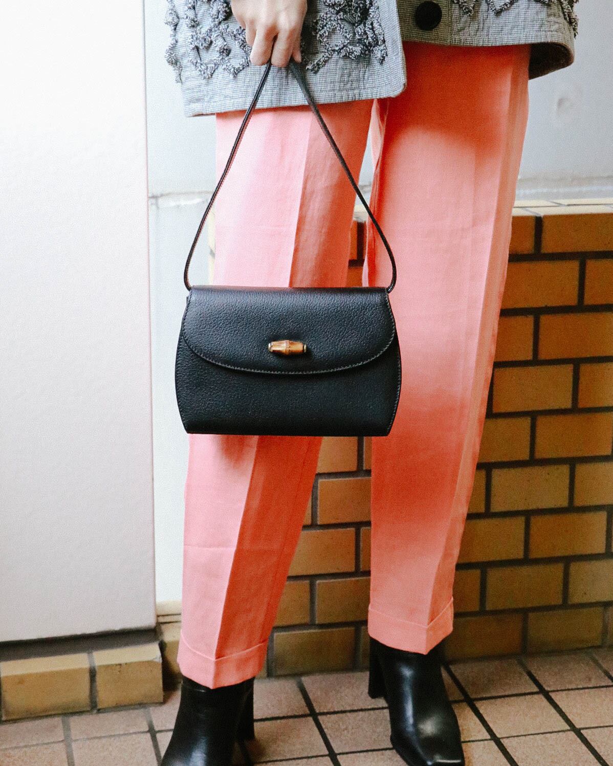 シンプルな見た目が嬉しいこちらのバッグは、オールドグッチのもの。程よい容量感に収納しやすい大きさ。フロントのバックルがバンブになっていてーデザイン性の豊さも感じます。ブラックバッグは、飽きが来ず永くご愛用いただけるのでおすすめです。