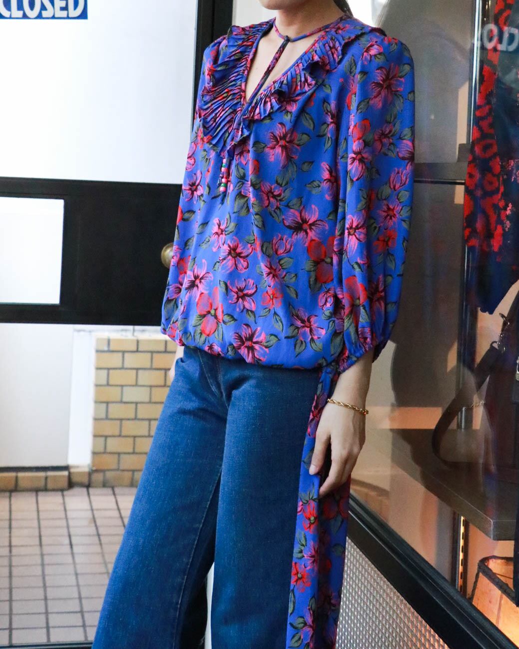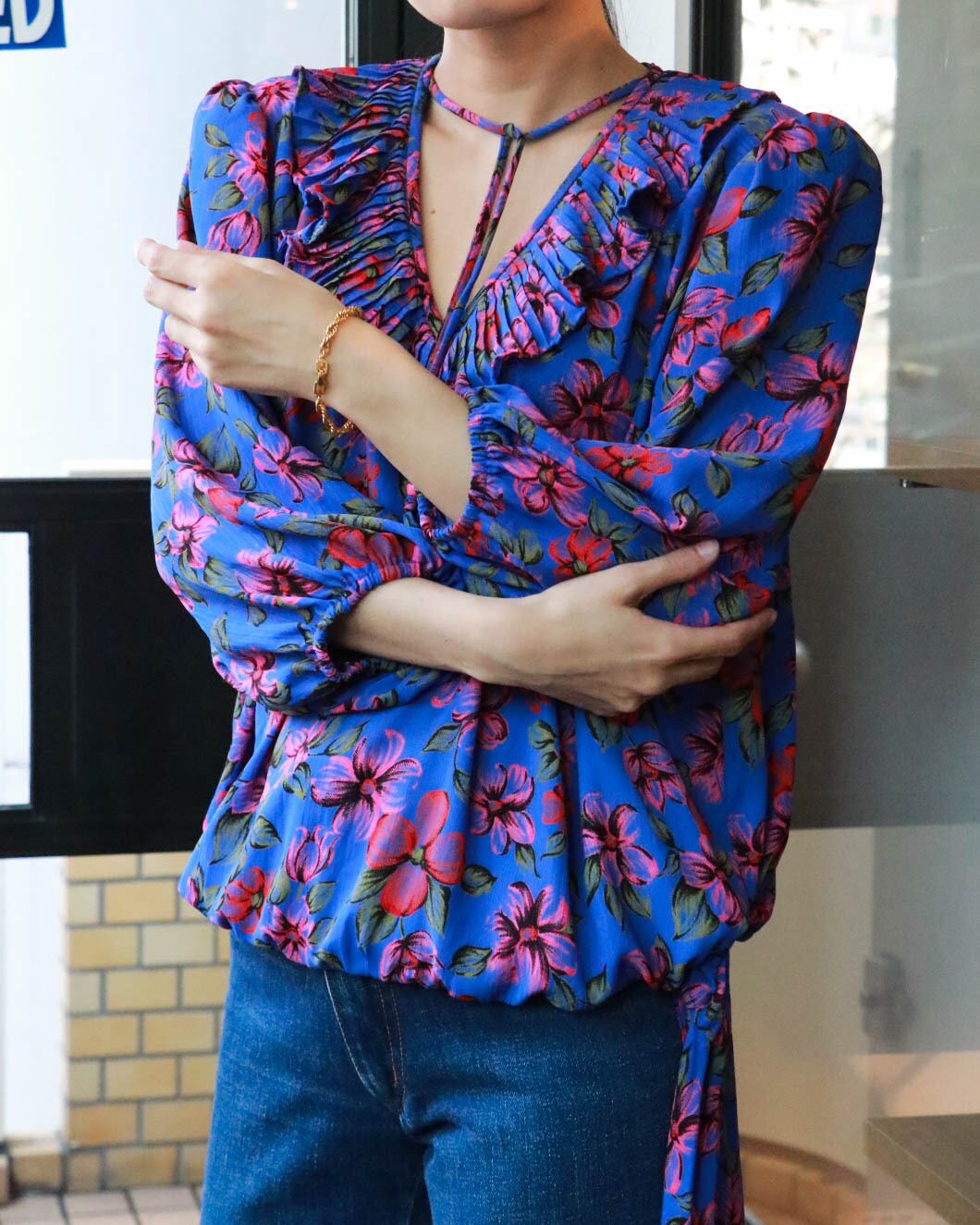 ブルーベースにピンクのお花柄が可愛いスーザンフレイスのブラウスが入荷。襟のフリルや裾のディテールが女性らしいデザインに。