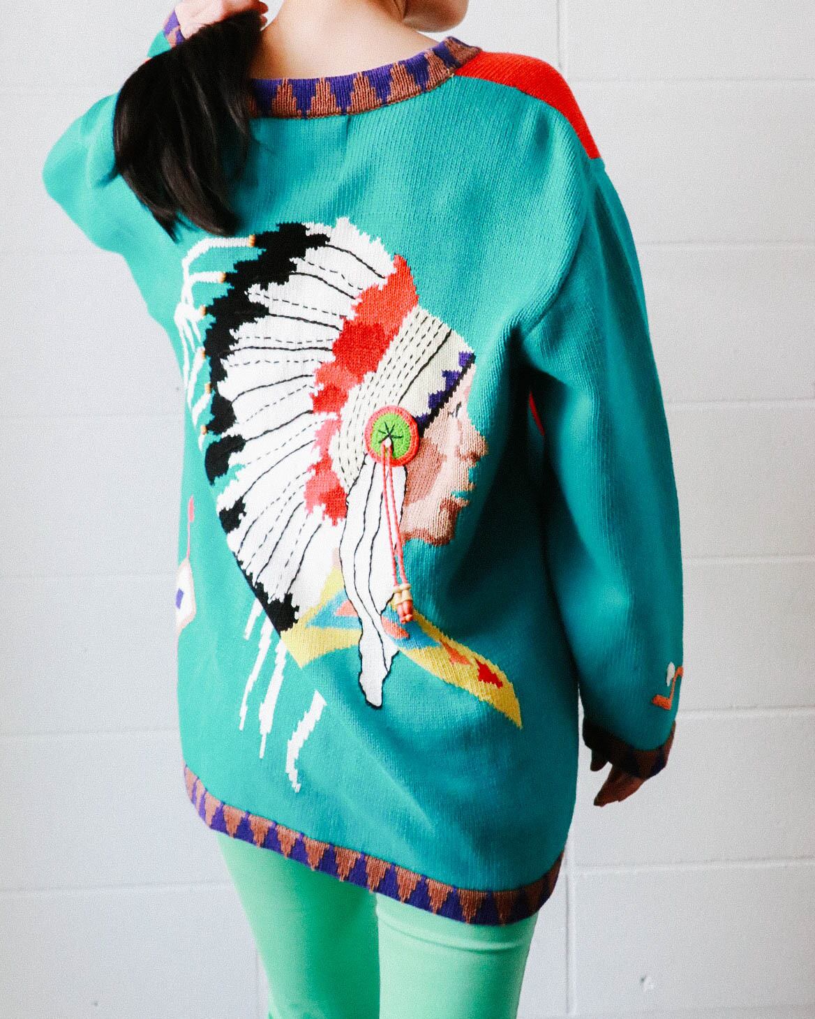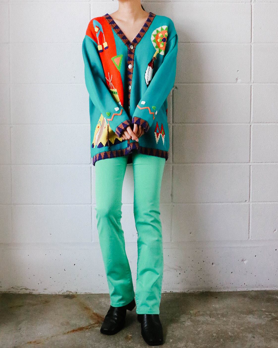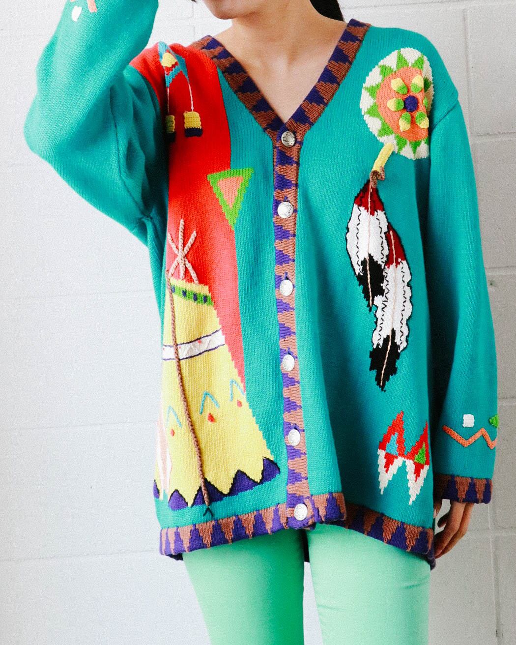作り手のこだわりを感じるネイティブアメリカンモチーフのニットカーディガン。ニットボディーにクロシェットでできたいろんなモチーフが所々に施されたスペシャルな一点。写真のようにカラーパンツやお好みのTシャツに羽織って自分だけのコーディネートをお楽しみください。