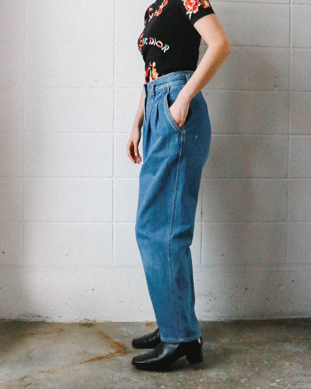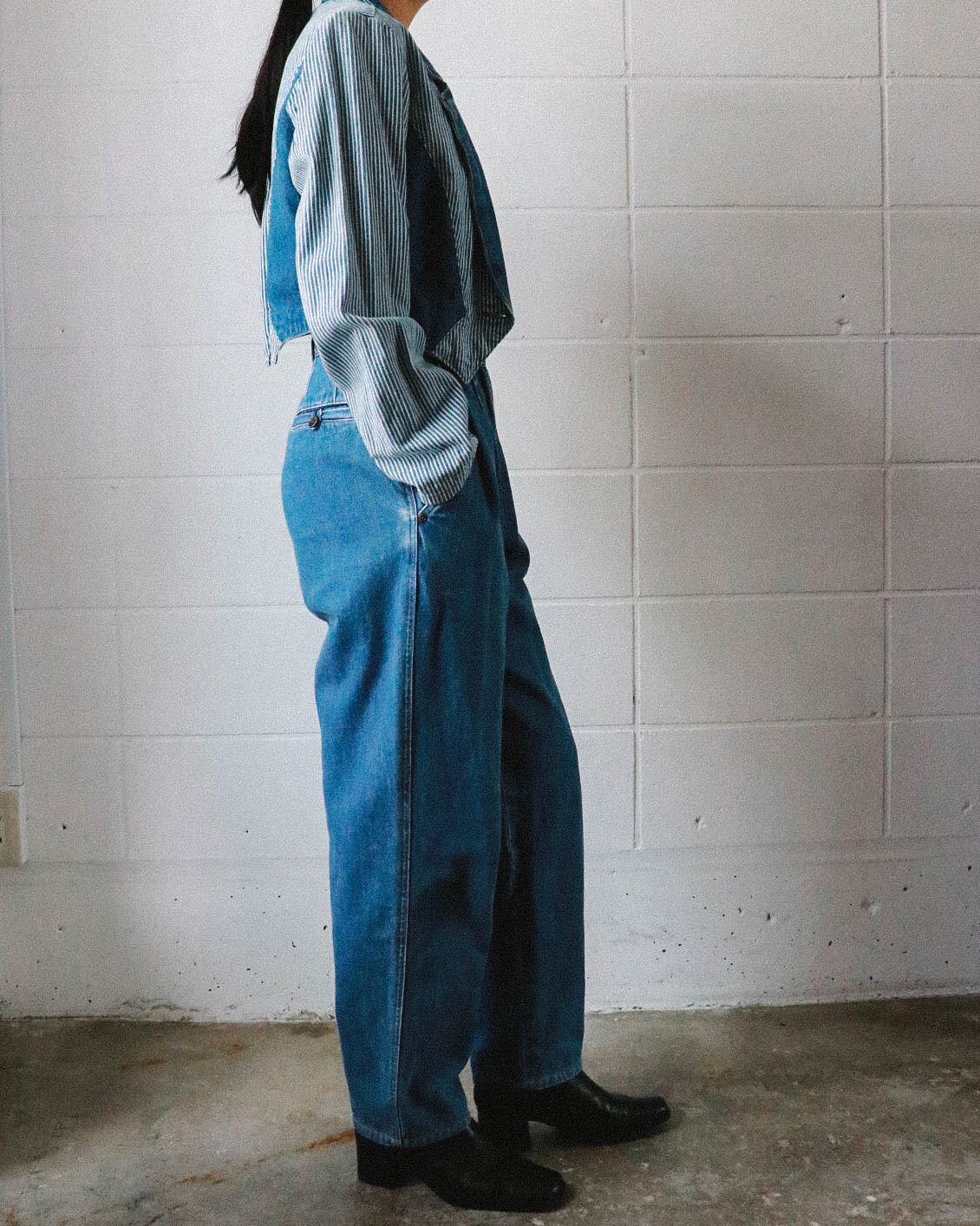 一年中大活躍するデニムパンツ。こちらは、DKNYのもの。股上深めのハイライズはスタイルアップの着こなしをサポート。ウエストのプリーツデザインにゆったりとしたボディーがヴィンテージらしく、こなれた印象。ヒールやスニーカーと合わせて、スタイリッシュに着こなすのが今の気分です。