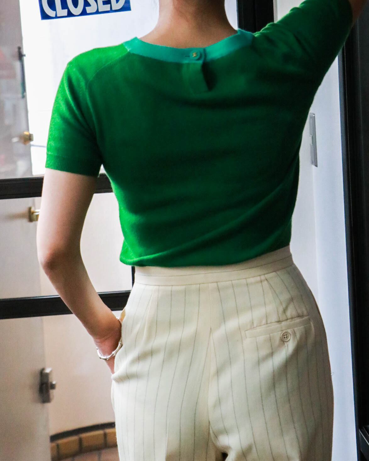 極シンプルでありながらさりげない首元のココマークのボタンや計算された女性の体のラインをよく魅せるバランスの良いシルエットはさすがの一言。