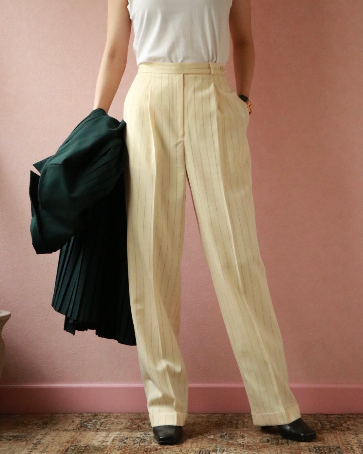 清涼感のある薄手のウール素材使用したローレンのアイボリーカラーのフルレングスパンツ。