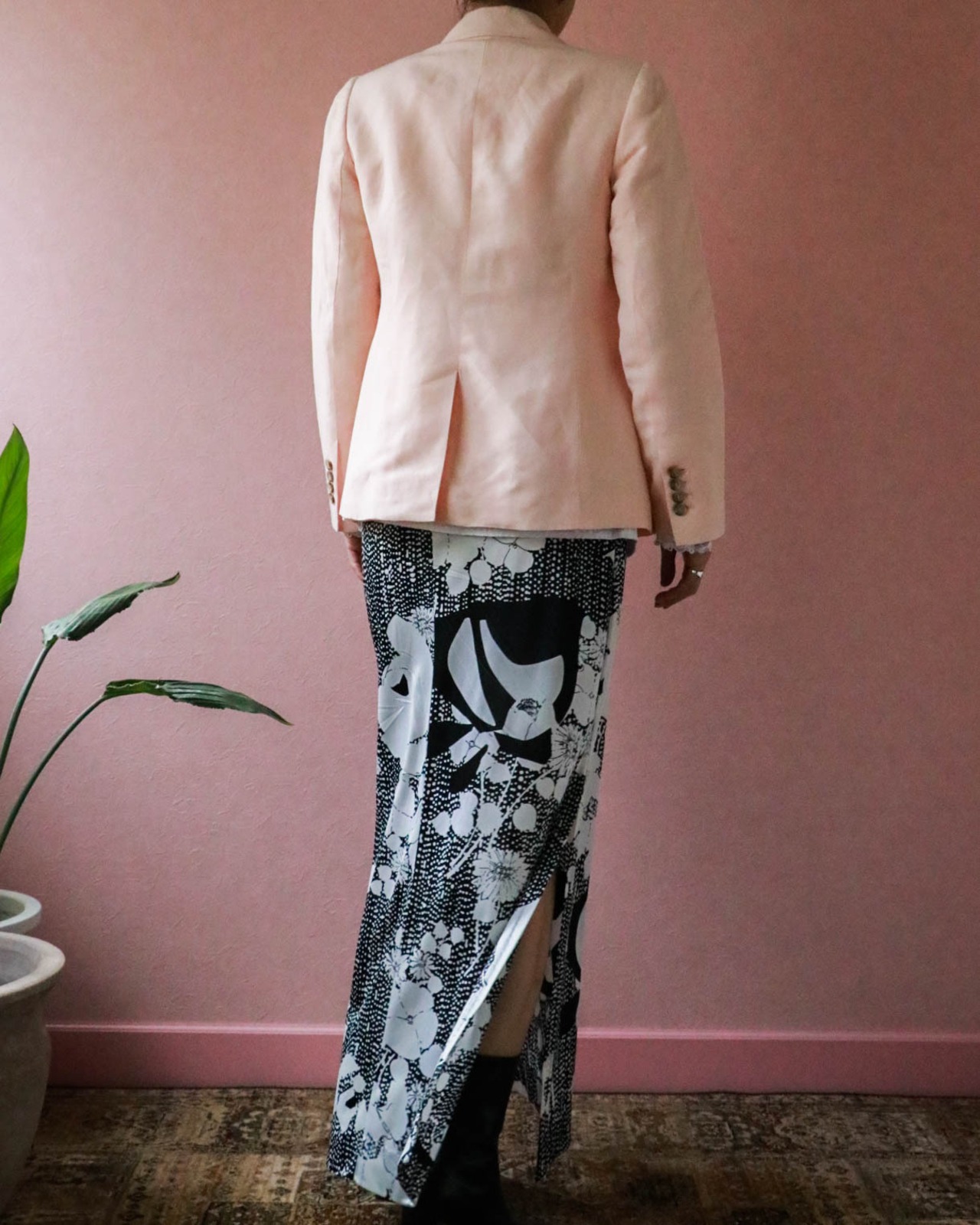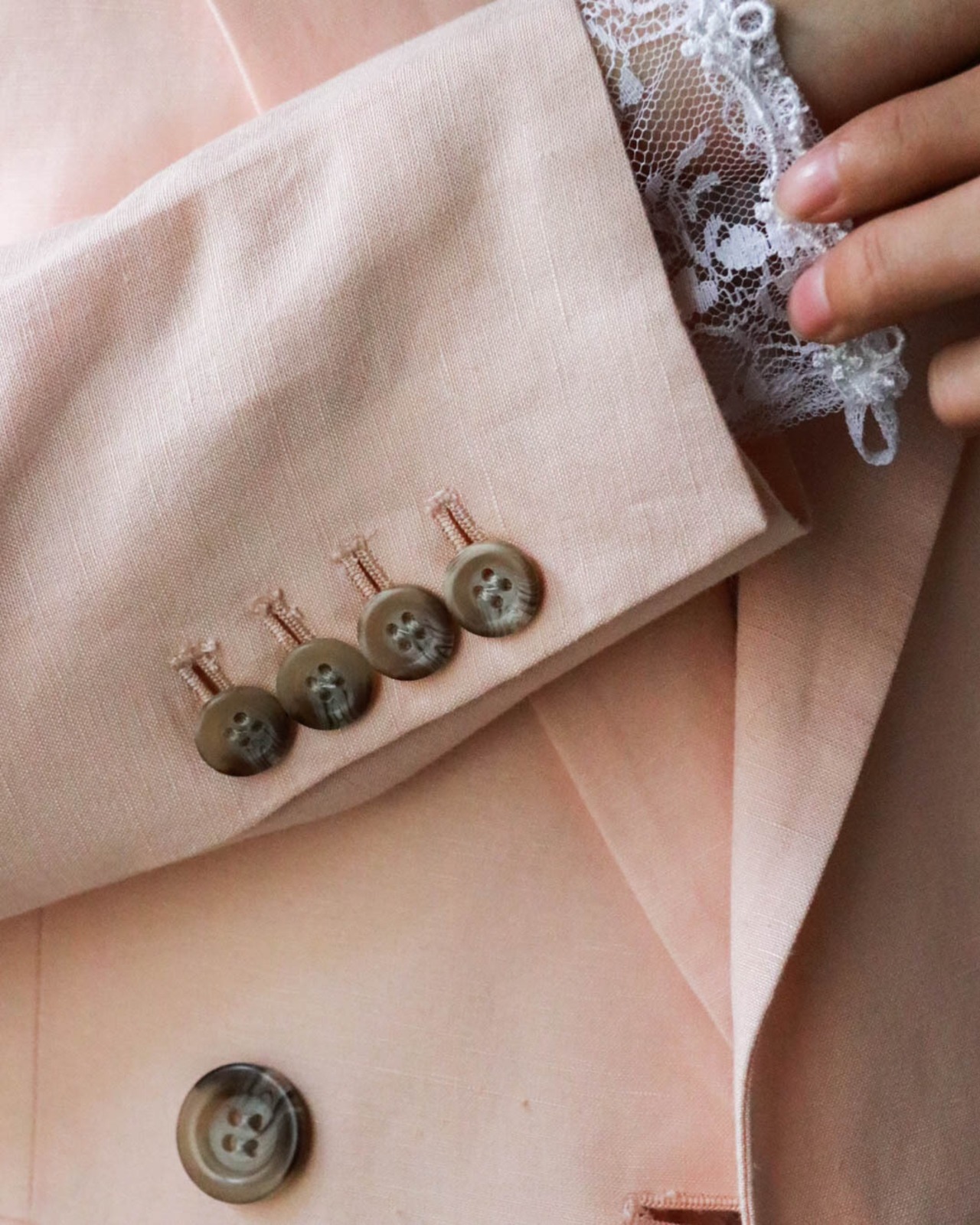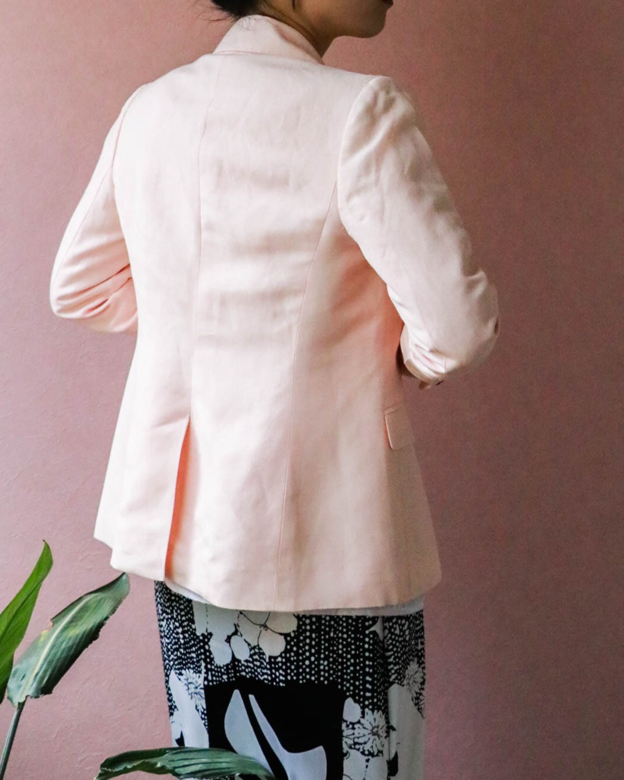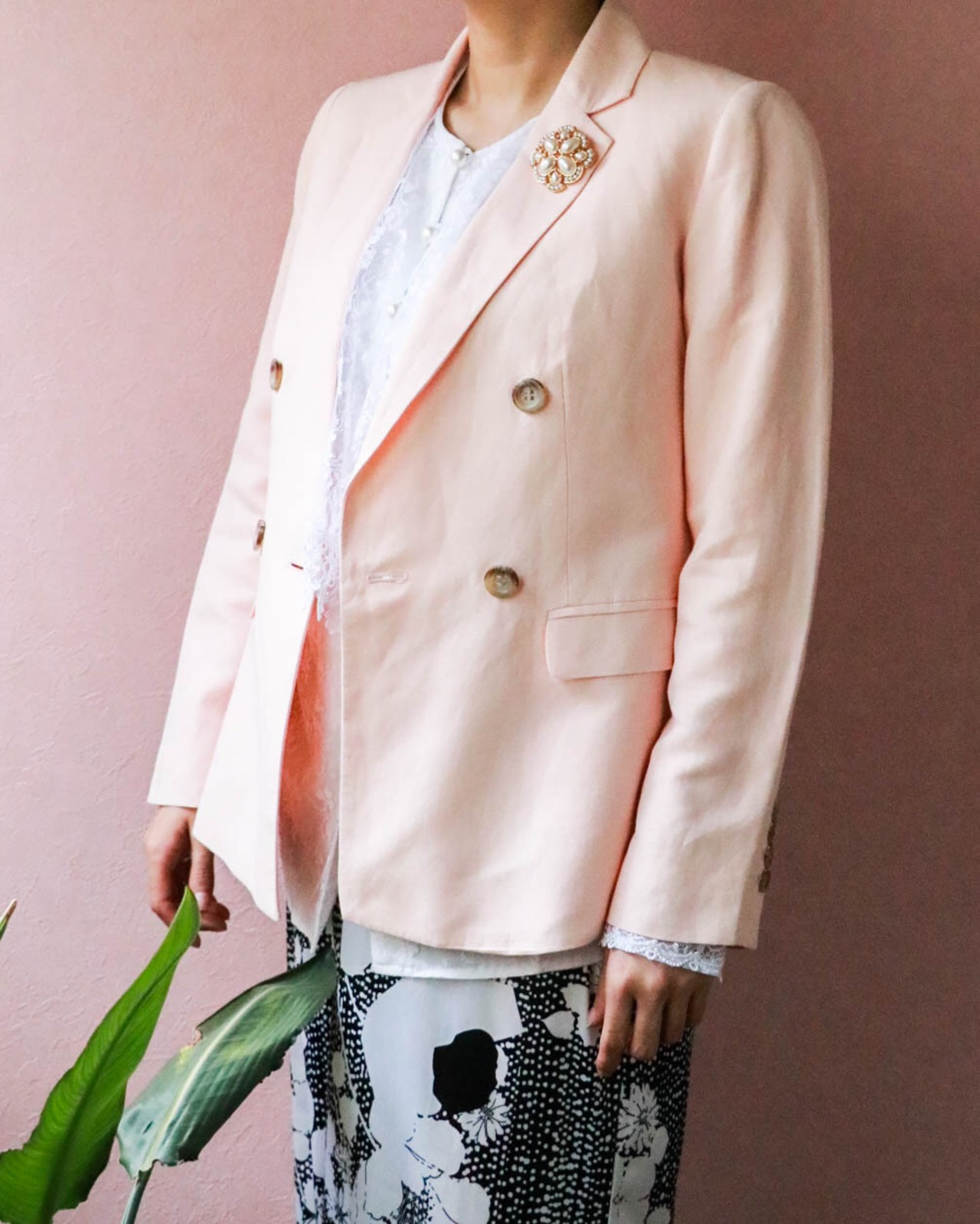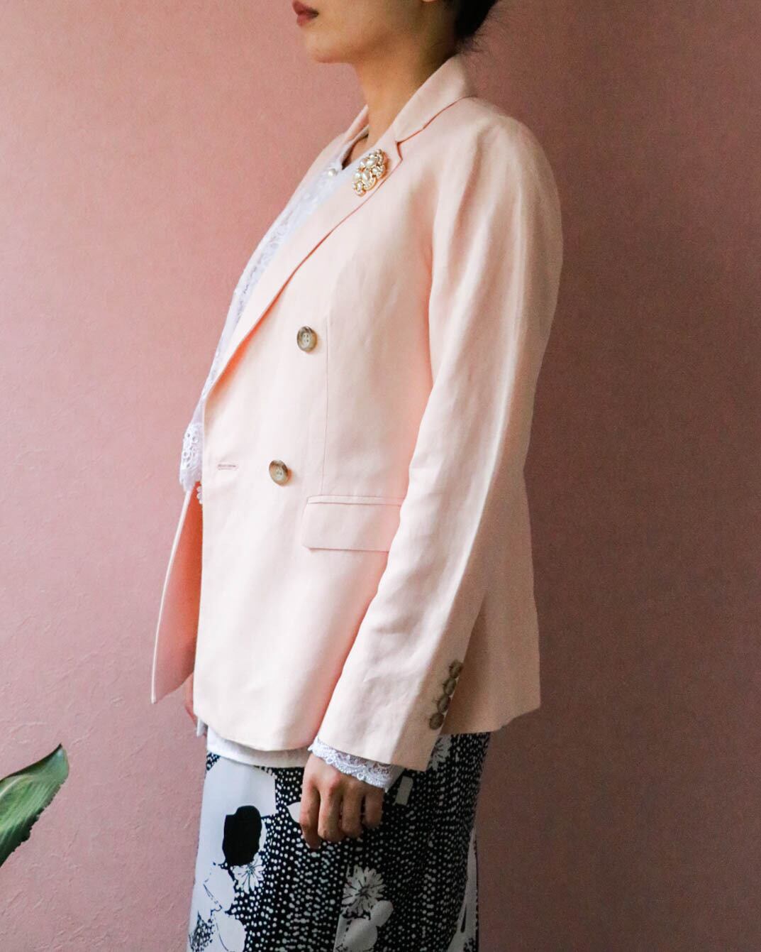春めくスタイリングに仕上げてくれるピンクジャケット。甘すぎない柔らかなピンクカラーはオレンジ味もあり馴染みやすいので白ジャケットのような感覚で着まわせます。爽やかなリネンに滑らかさをプラスするレーヨン混の生地は今の季節にぴったり。