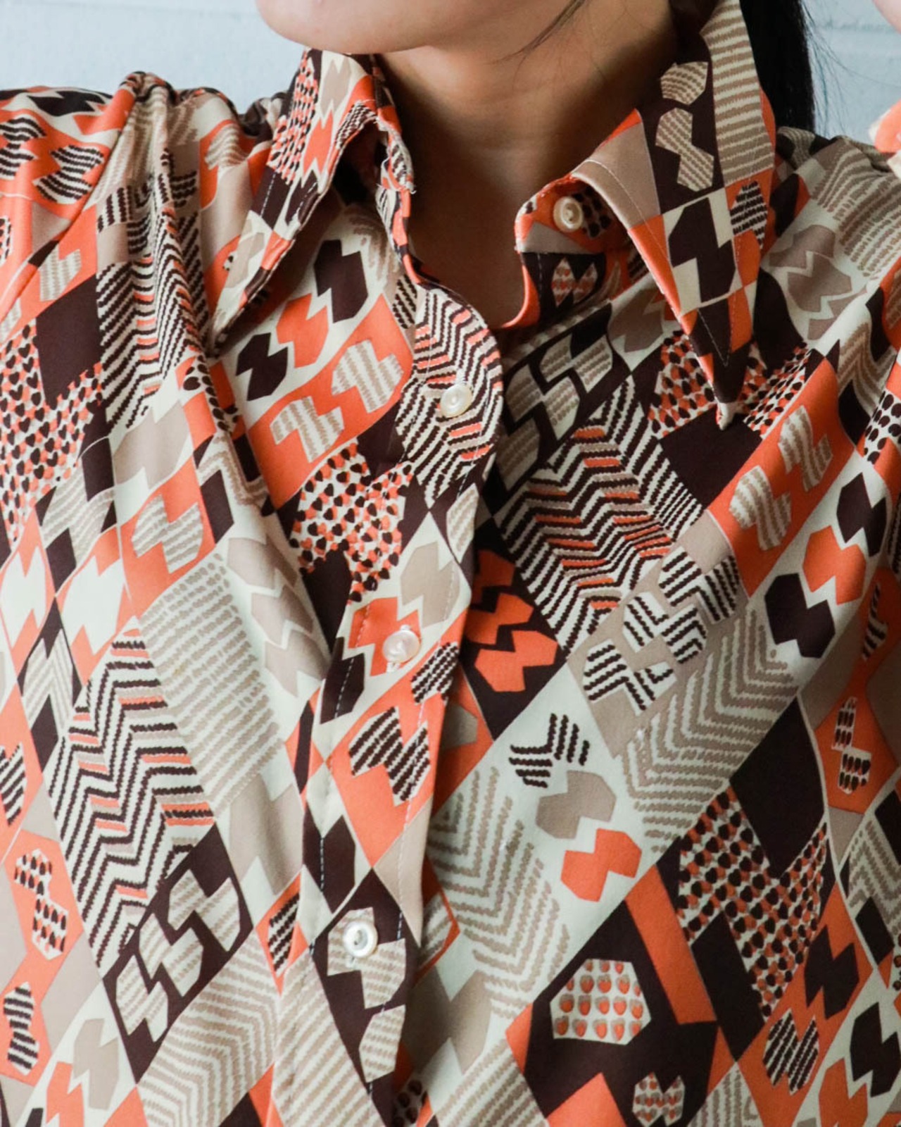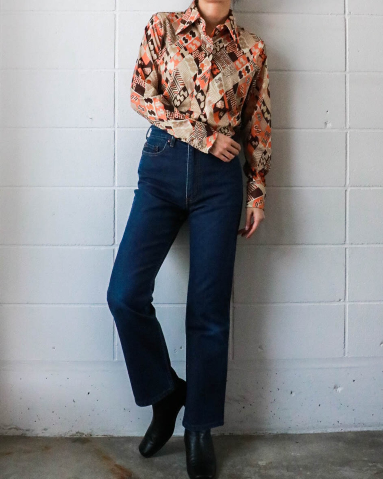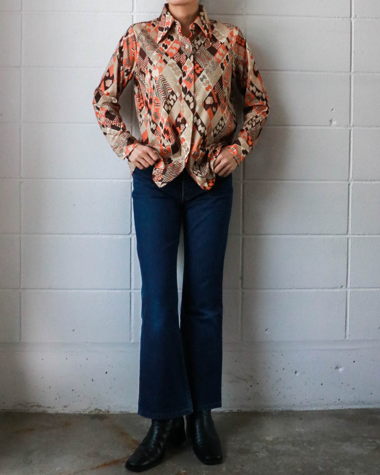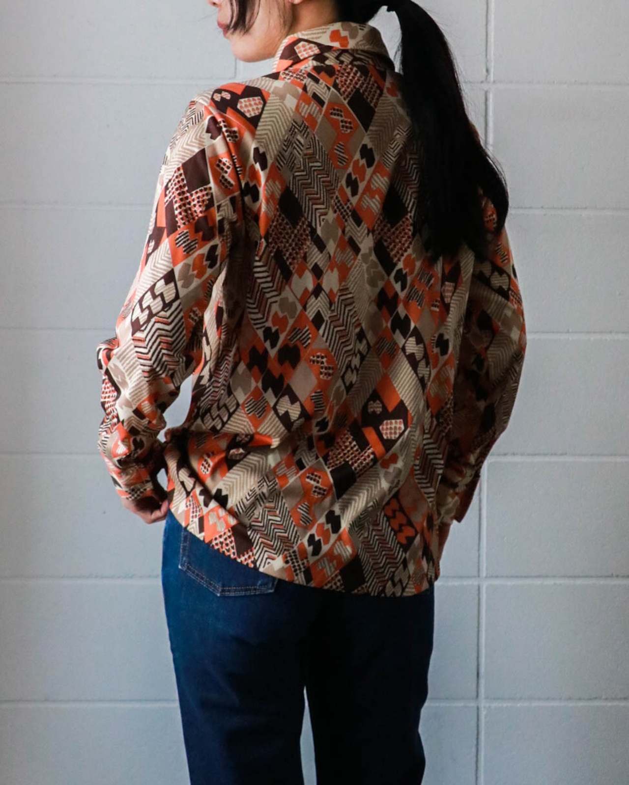 70年代らしいシャープな襟元が特徴のプリントブラウス。コンパクトなシルエットで合わせやすく、どんなボトムスとも相性抜群。。一枚で着るのはもちろん、柄をいかしてジャケットとレイヤーするのも楽しい。ストレッチの効いたポリエステル素材が軽量で使いやすい一着。
