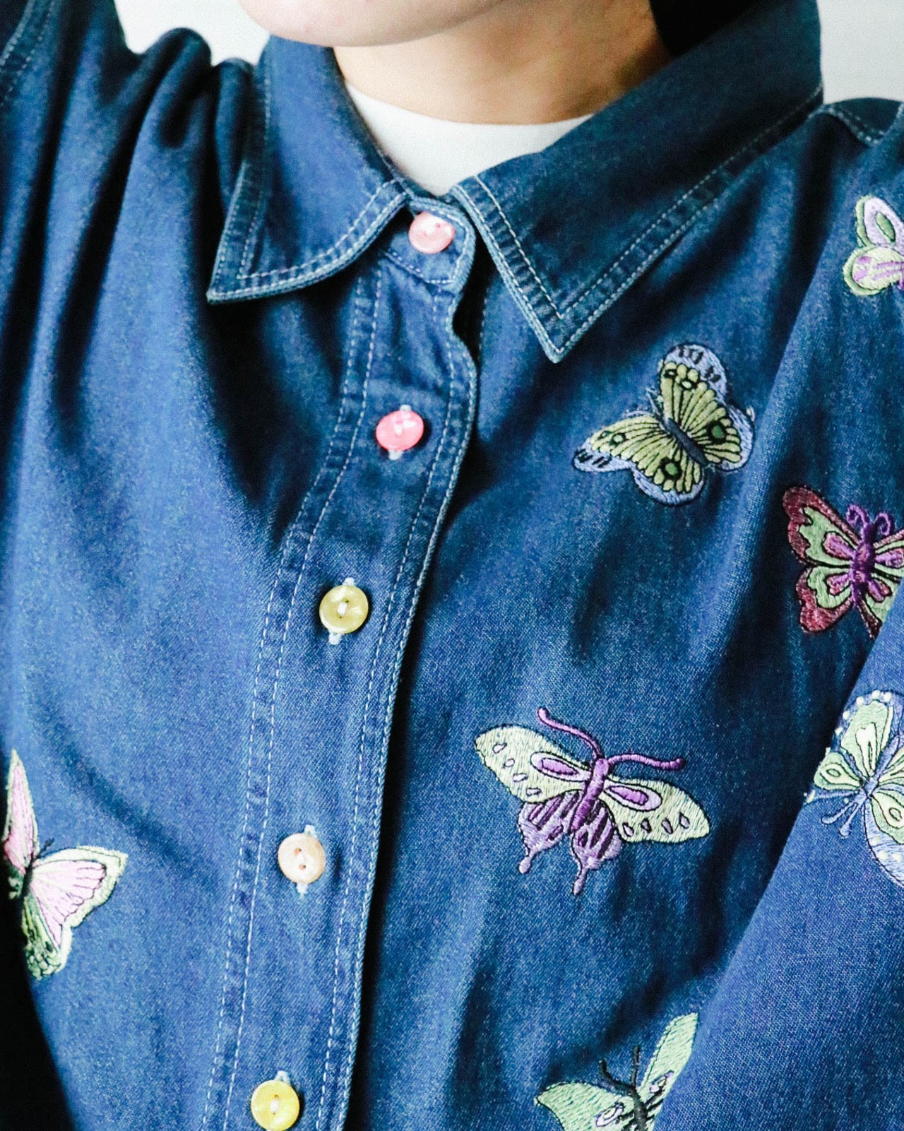 鮮やかなスプリングカラーのバタフライ刺繍が施され、ボタンもひとつひとつ