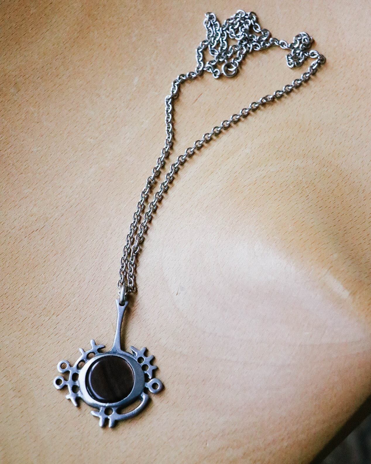 当時の北欧らしいデザインで中心のブラウンカラーはシェル素材。光を捉えて角度によって表情をかえる存在感はコーディネートのアクセントに。