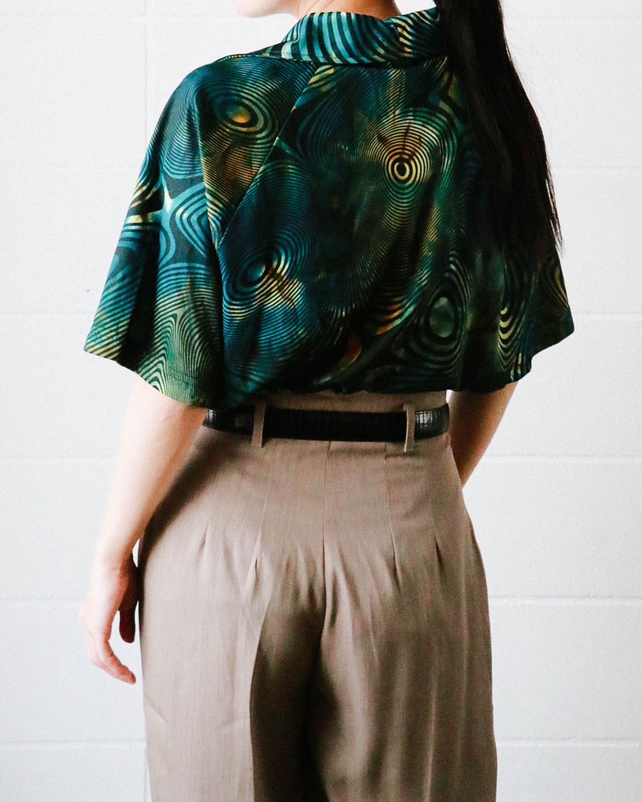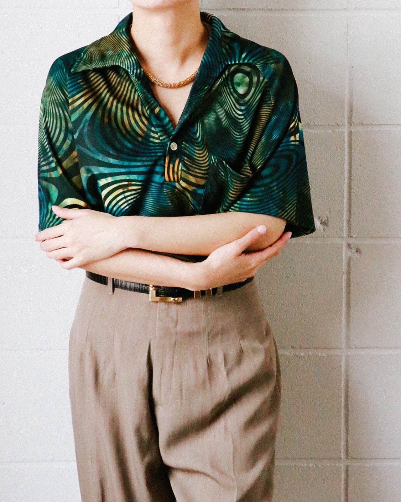 タイダイ柄にサークルモチーフ柄が重なり合っているユニークなプリントは時代を超えても新鮮です。是非、モードやリラックスムードで楽しんでみて。