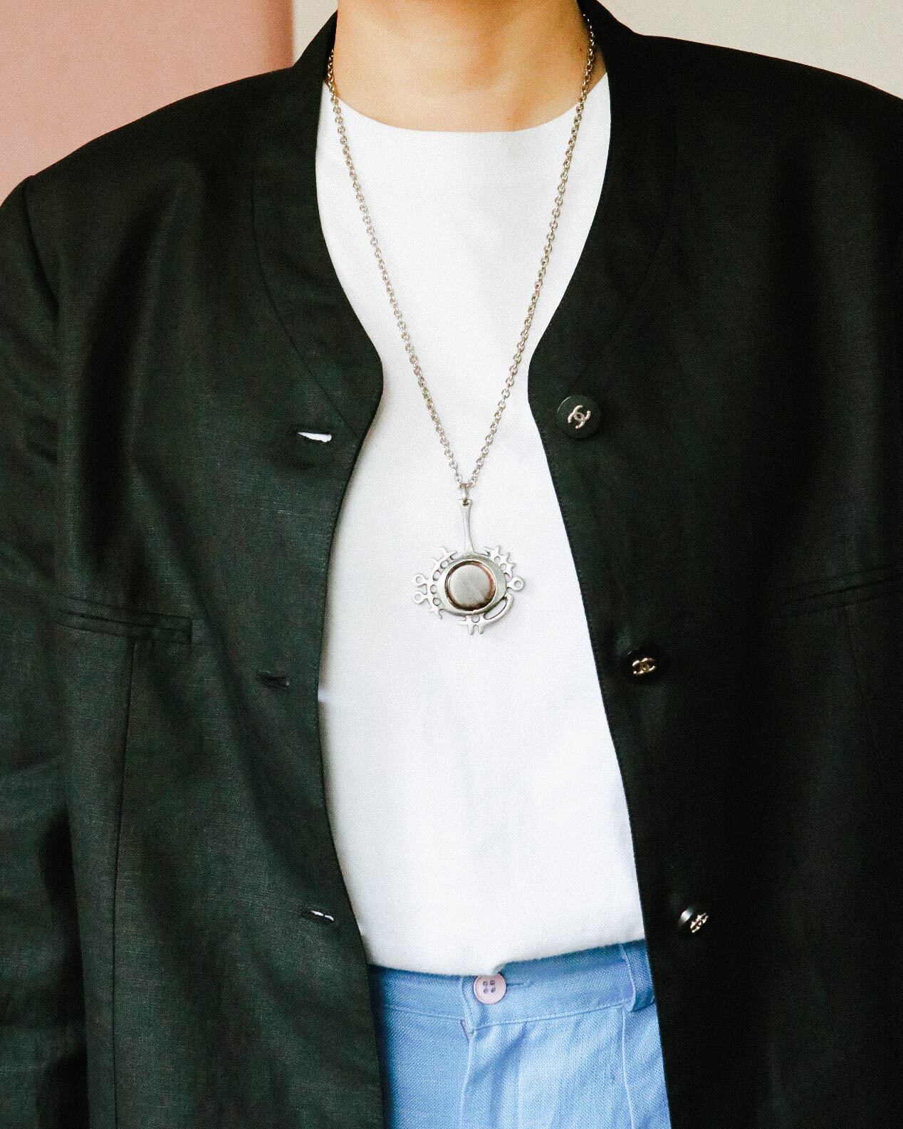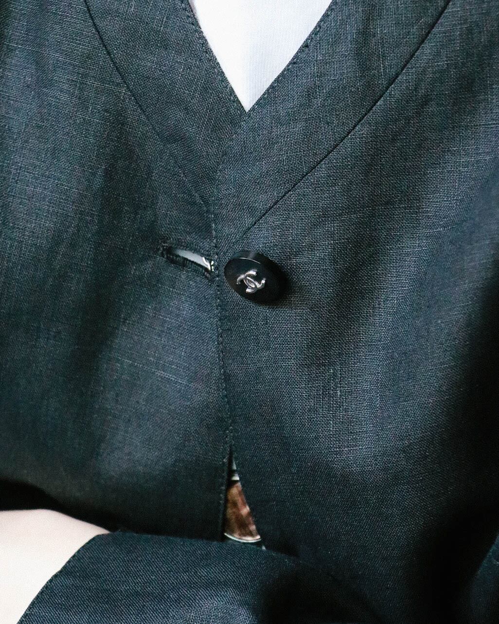 リネンの素材感で気分まで軽くなるシックなブラックジャケットは、メゾンブランドシャネルのもの。ミニマルでスッキリとした襟元にcocoマークが入ったボタン達が上品なアクセントに。