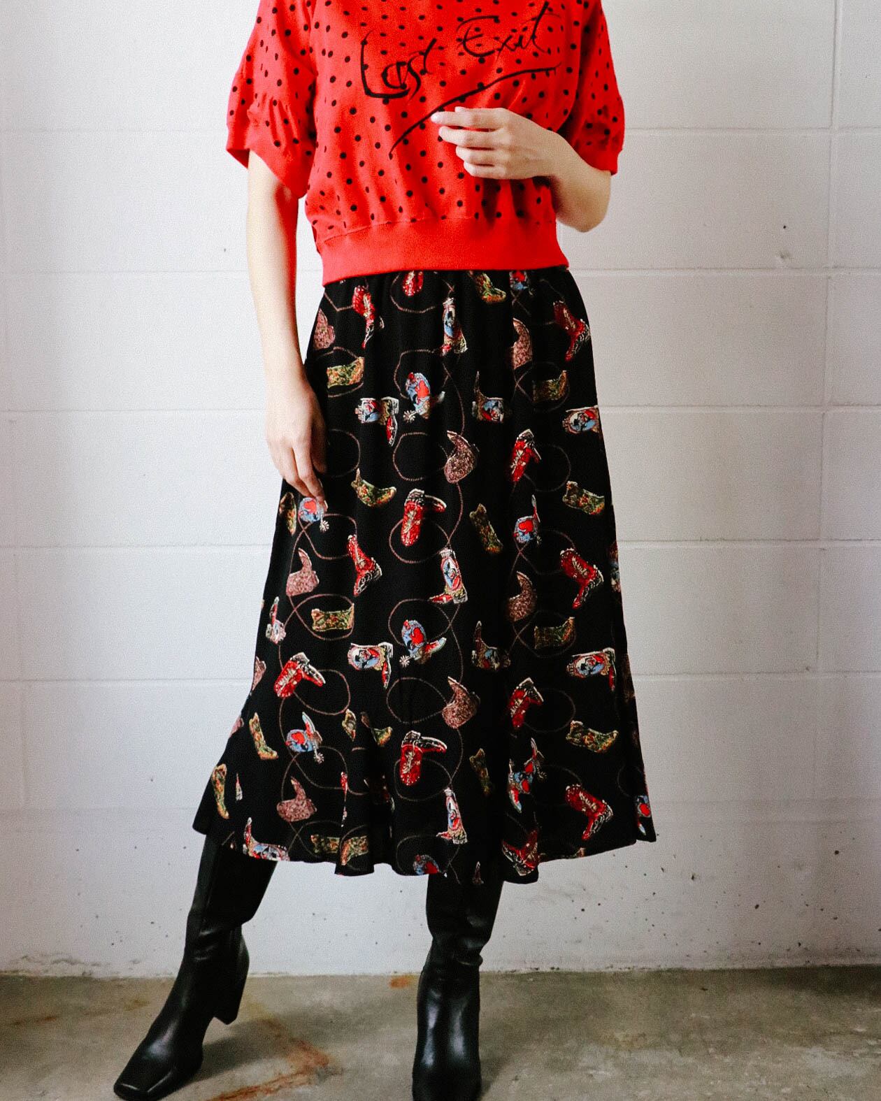 レーヨン素材の着心地いいウエスタンブーツ柄スカートが入荷。