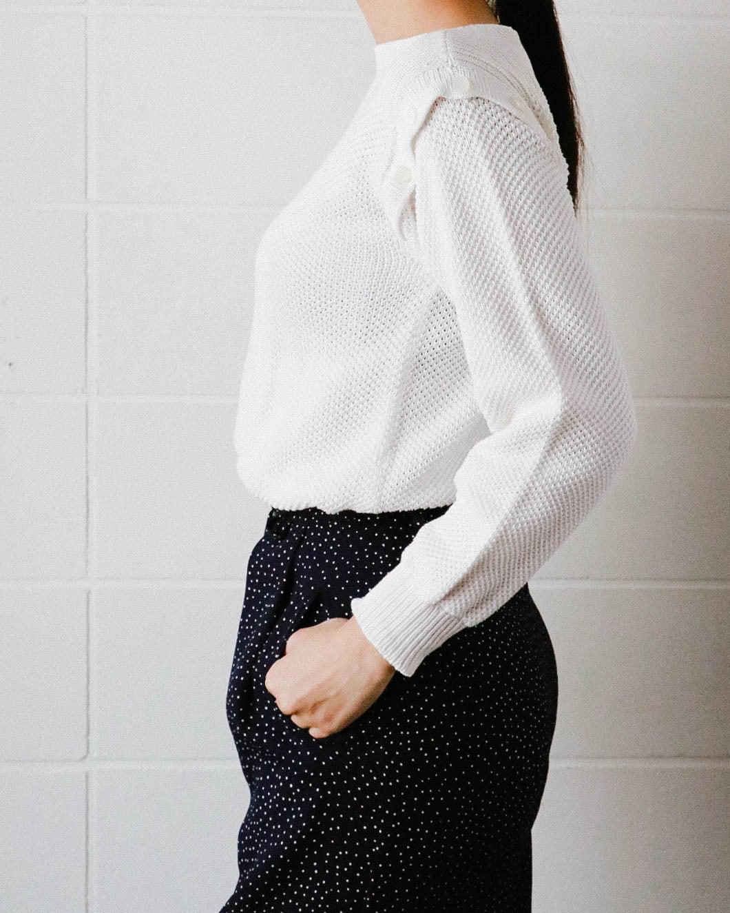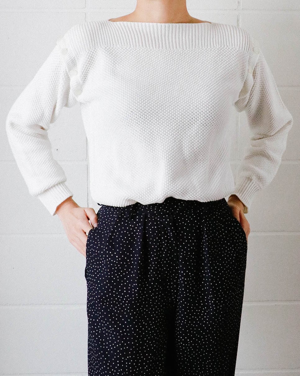 美ラインのボートネック、肩のボタン切り替えがアクセントに。