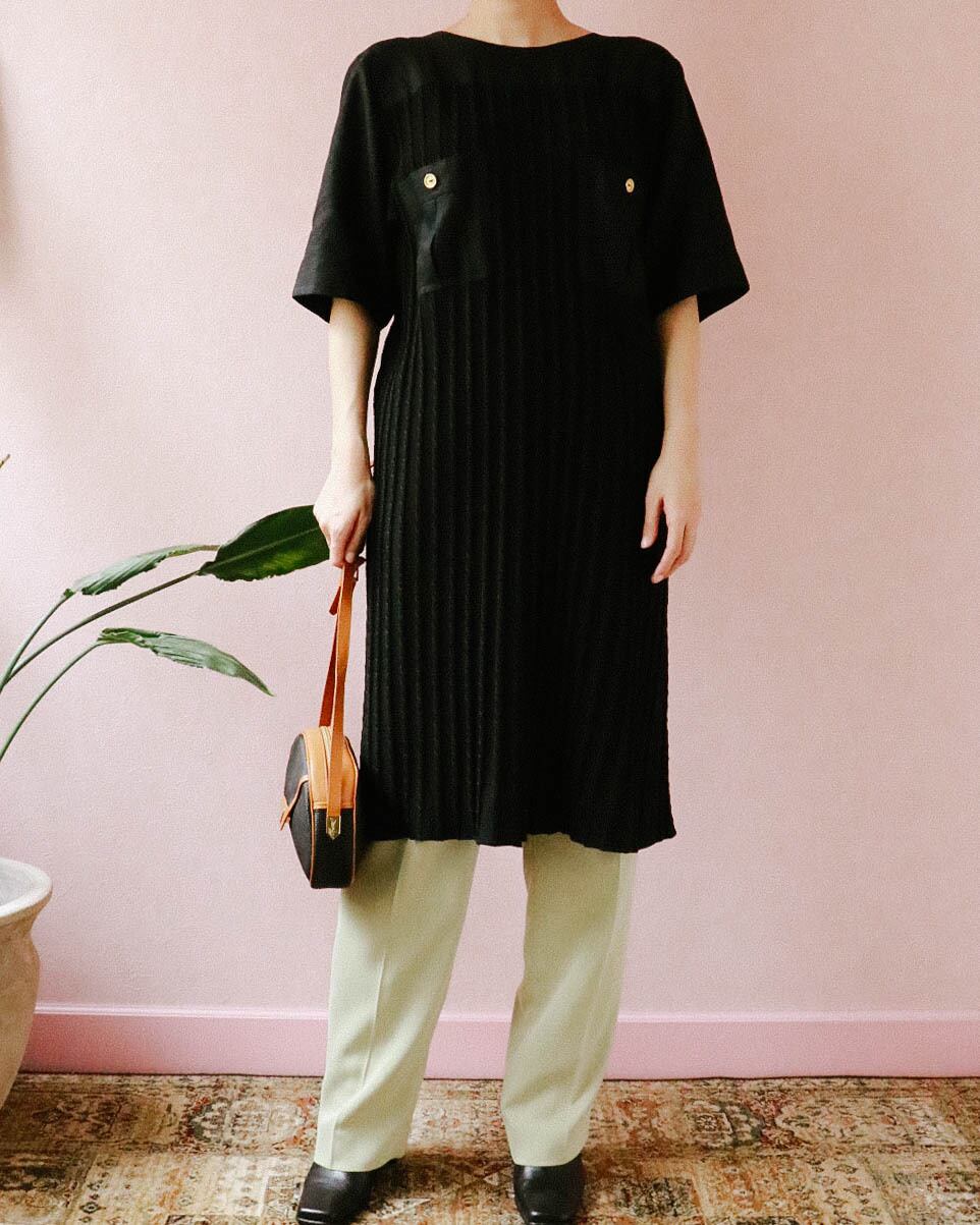 セリーヌのリネンとニットのコンビネーションがユニークなブラックドレス。