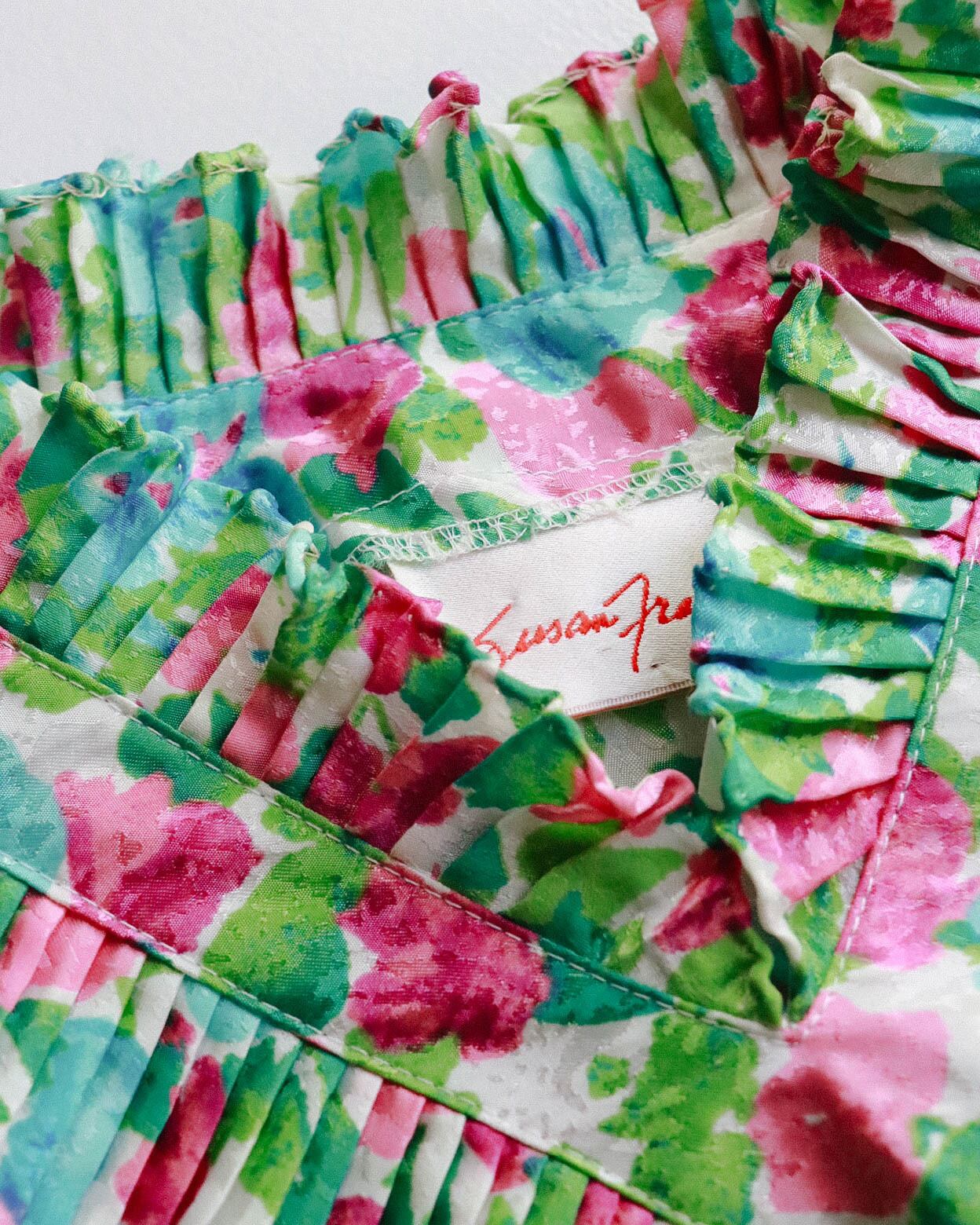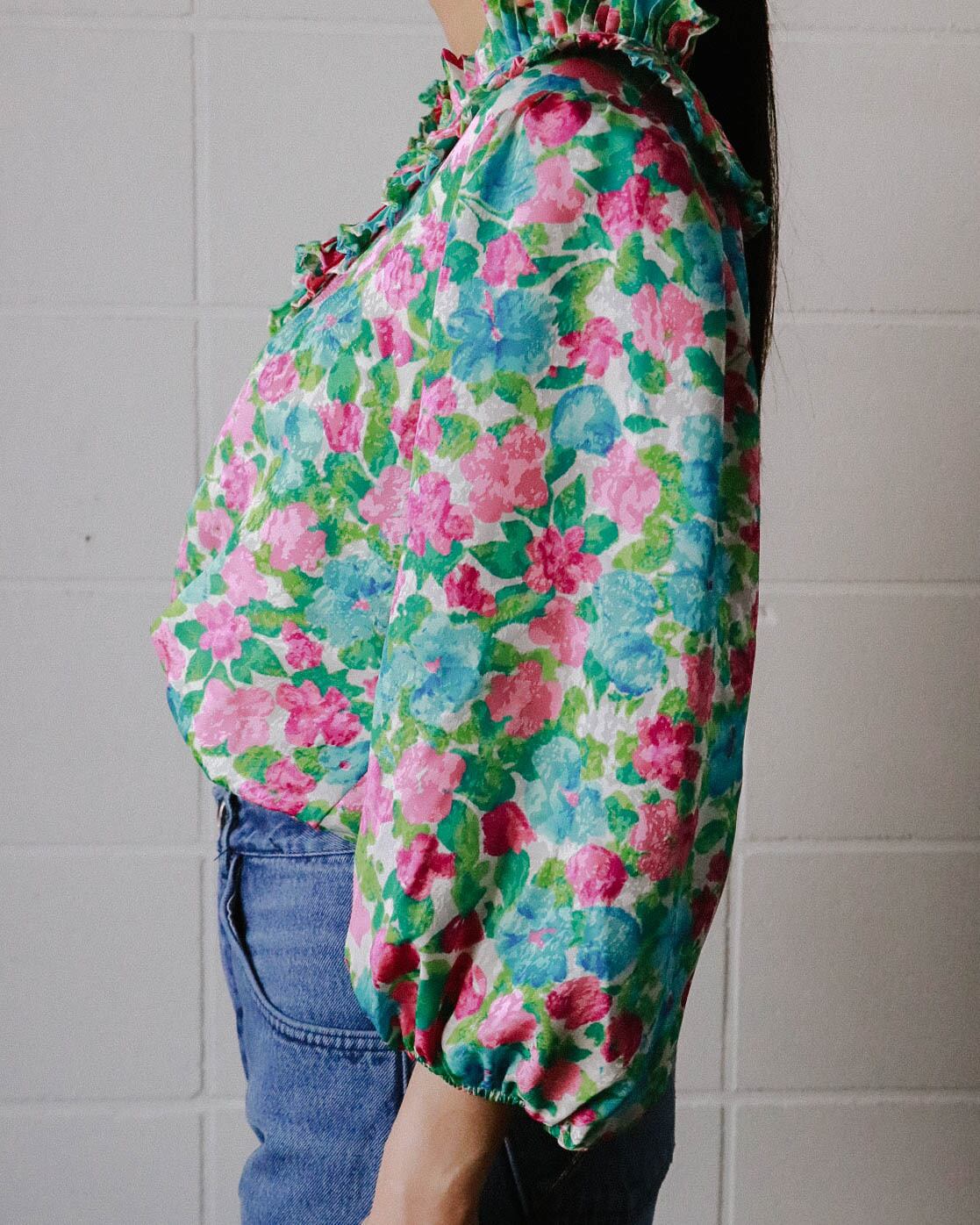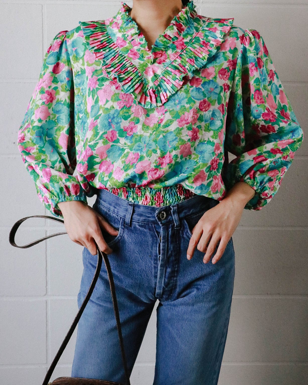 可愛いお花柄のスーザンフレイスのブラウスが入荷。襟のフリルや裾のディテールが女性らしいデザイン。お好みのデニムやワンカラーのボトムズに合わせて自分だけのコーディネートをお楽しみください。