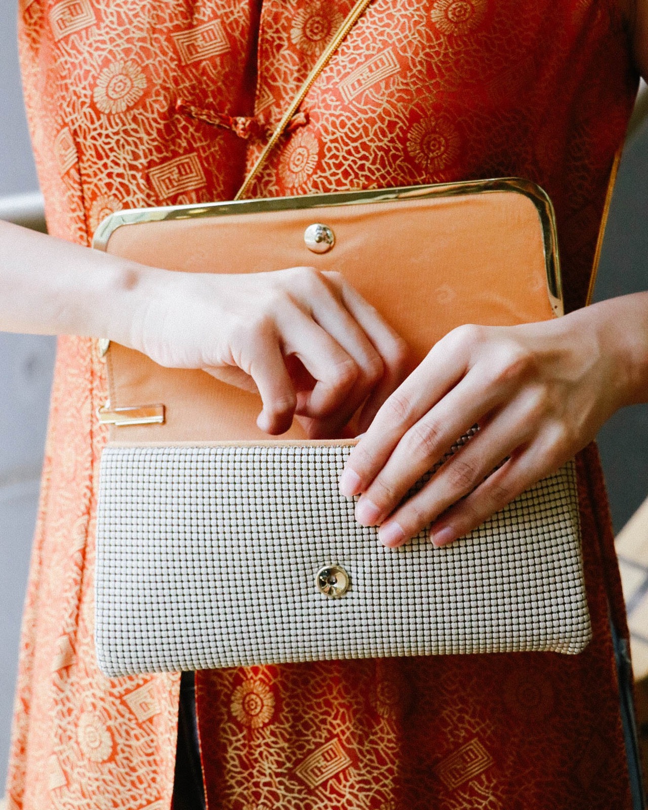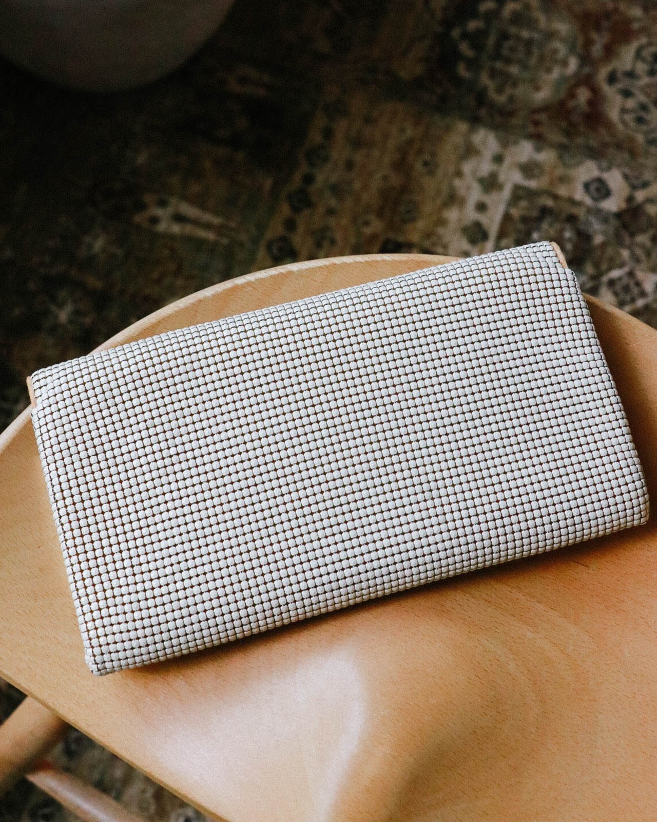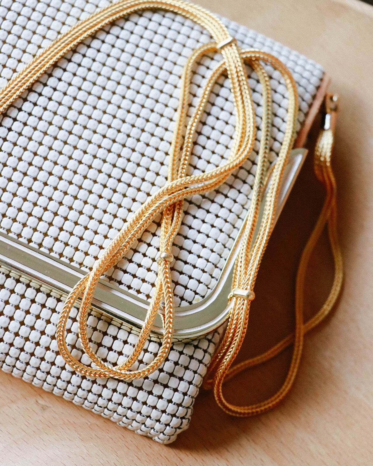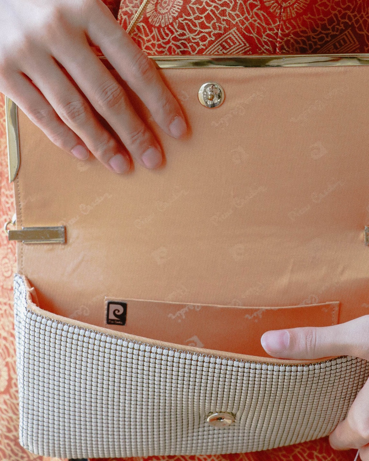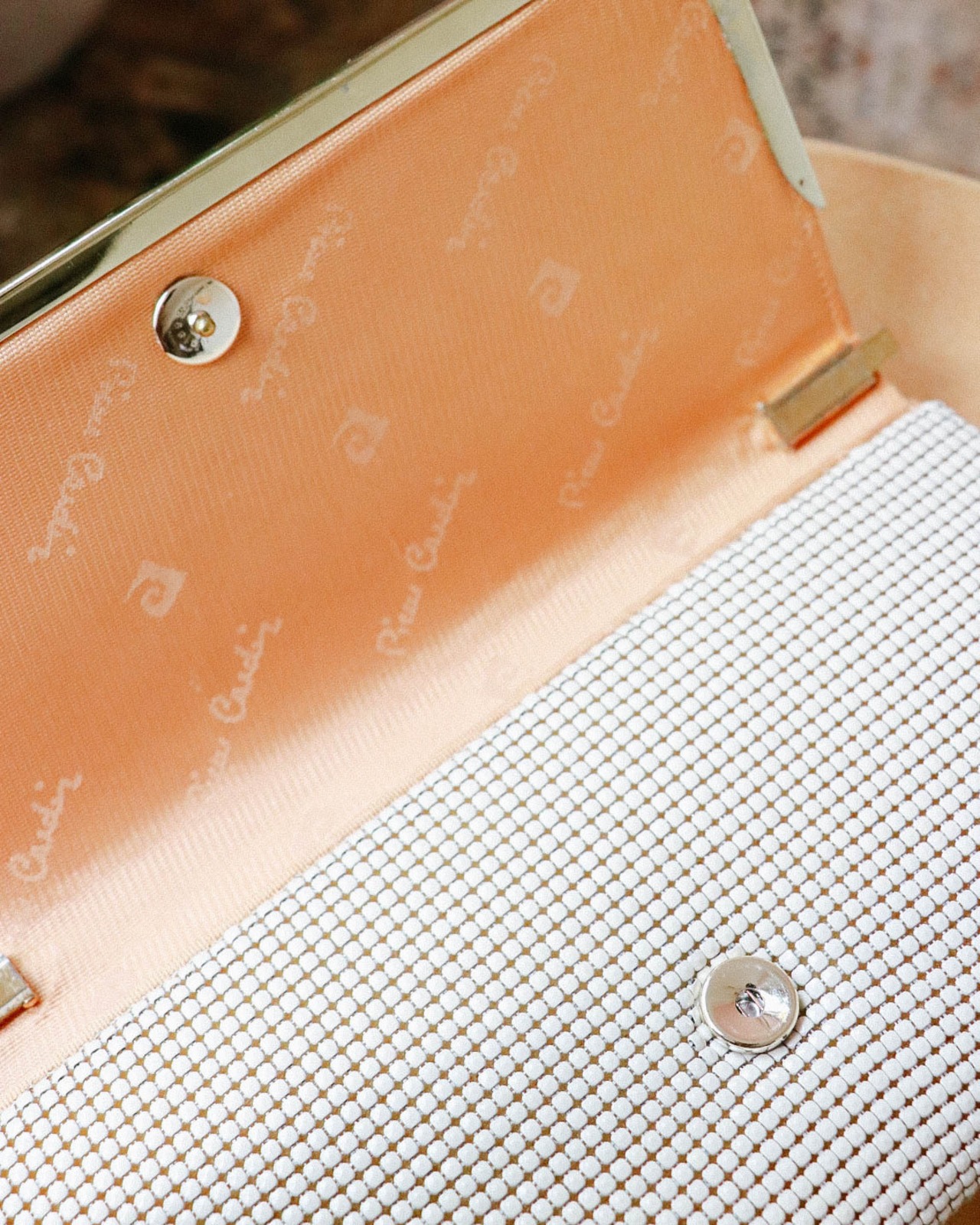 ピエールカルダンのチェーンバッグ。エレガントなホワイトベージュの艶やかなバッグはコーディネートのアクセントに。パーティーシーンはもちろん、普段のデニムなどのカジュアルなデイリースタイルにも合わせたい。