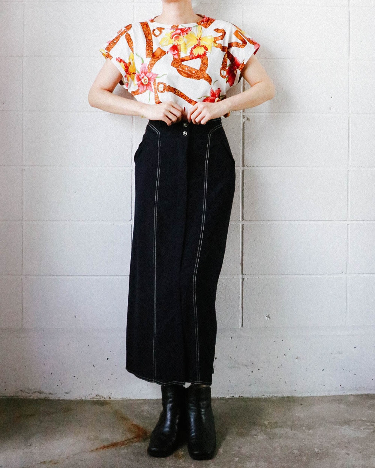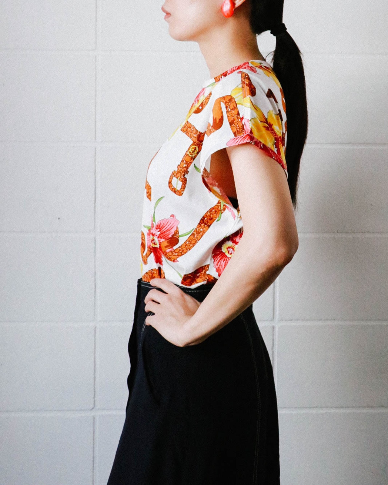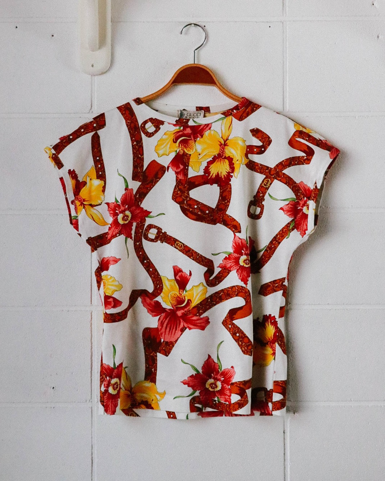 華やかなプリント柄が引き立つトップスはオールドグッチのもの。GUCCIらしいカラーで目をひくデザインはボトム次第で幅広い雰囲気にマッチします。デッドストックなのも嬉しいポイント。是非、取り入れやすいTシャツで差をつけてみて。