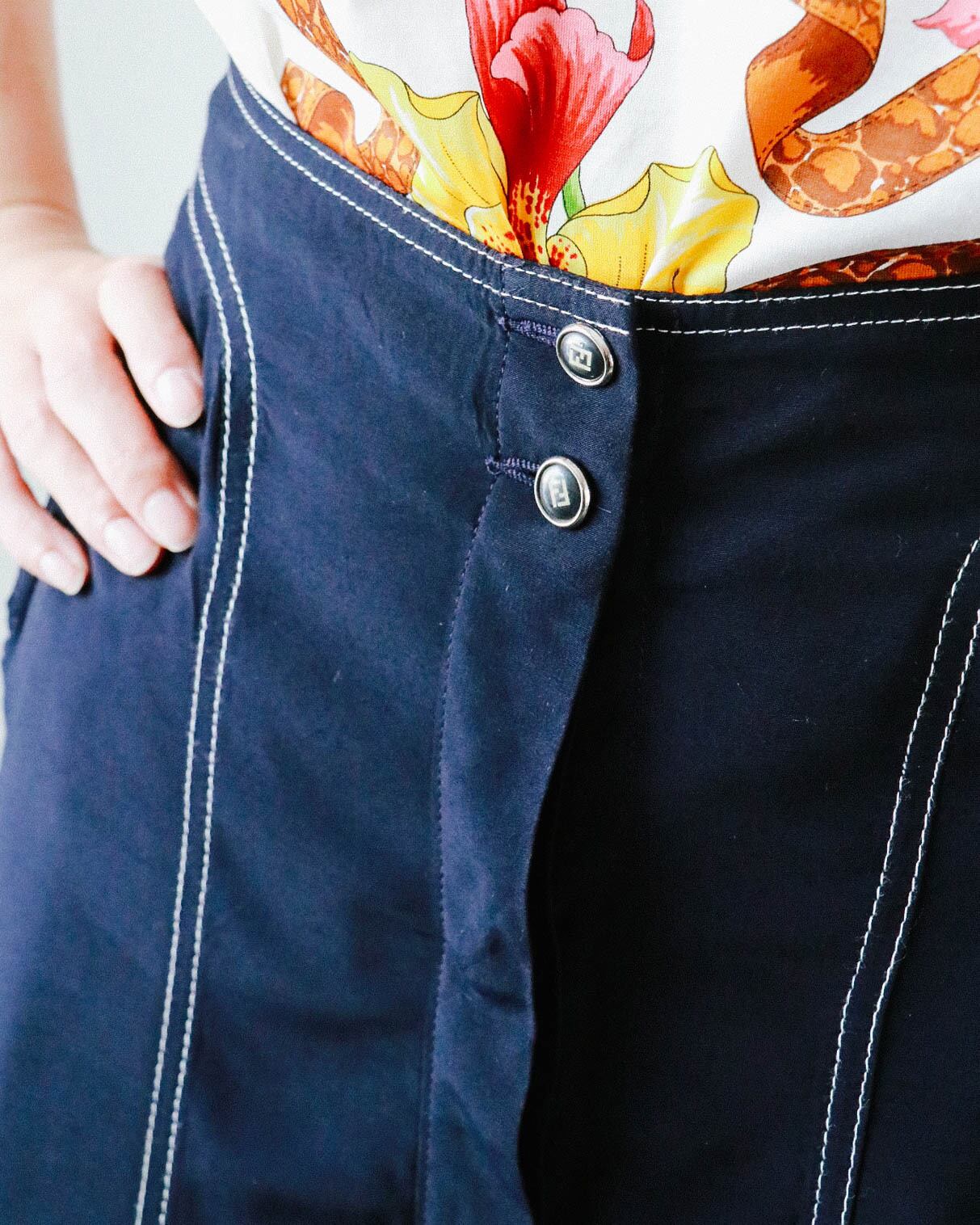 なめらかでさらりとした素材はボディーラインを美しく、ステッチデザインがさらにラインを引き立たせてくれます。フロントボタンのズッカマークも嬉しいポイント。ヴィンテージらしいアイテムでスタイリングもより楽しめるはず。