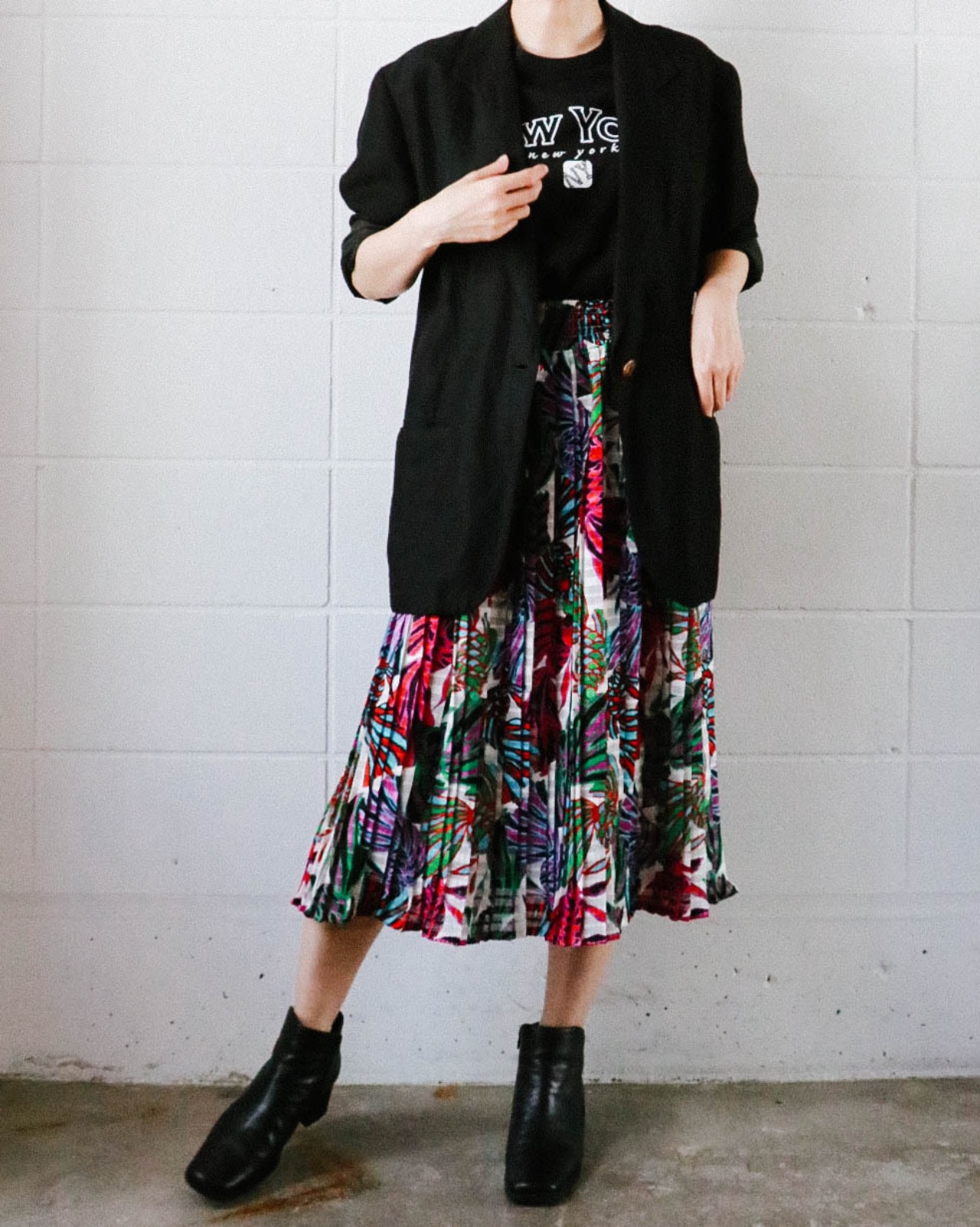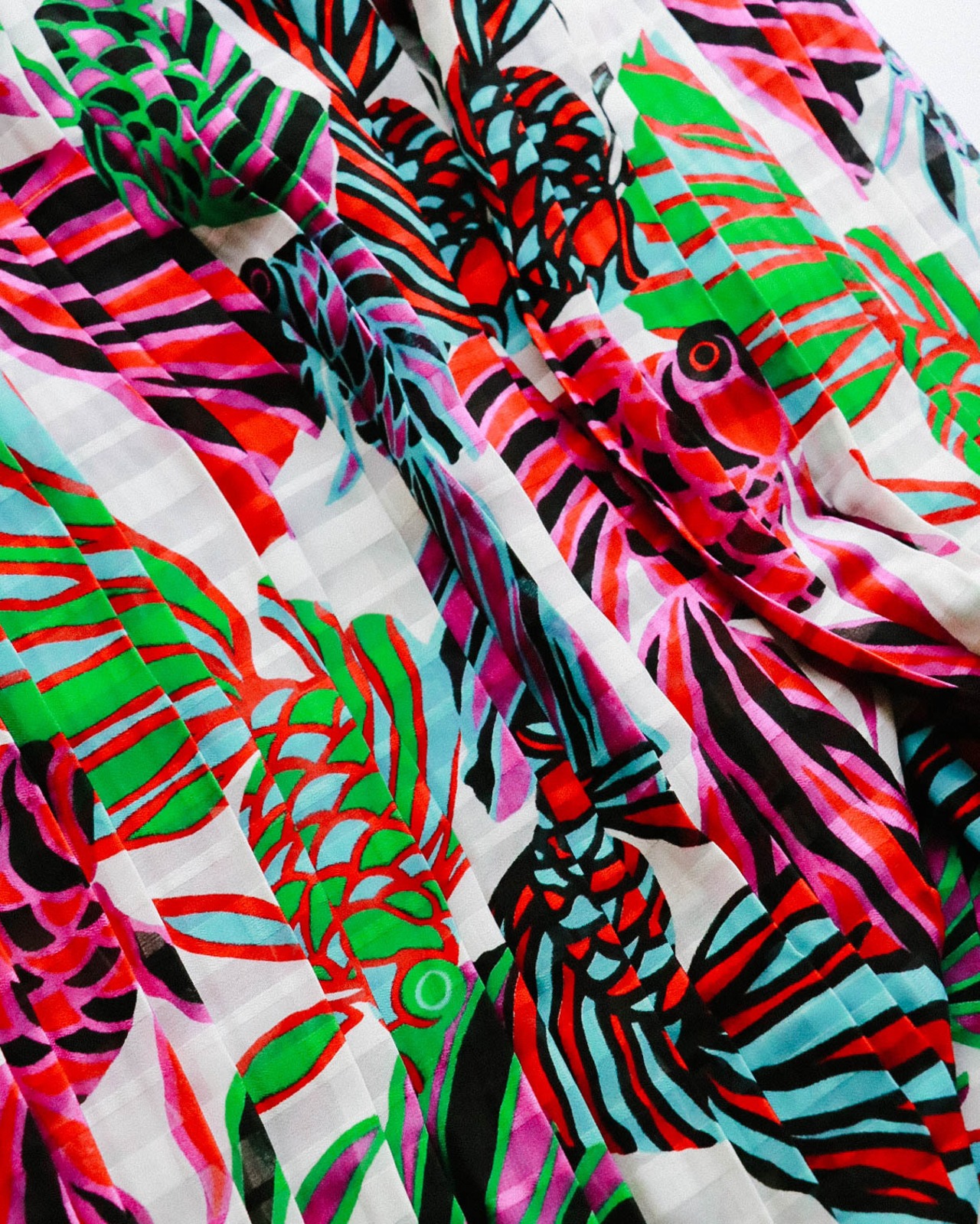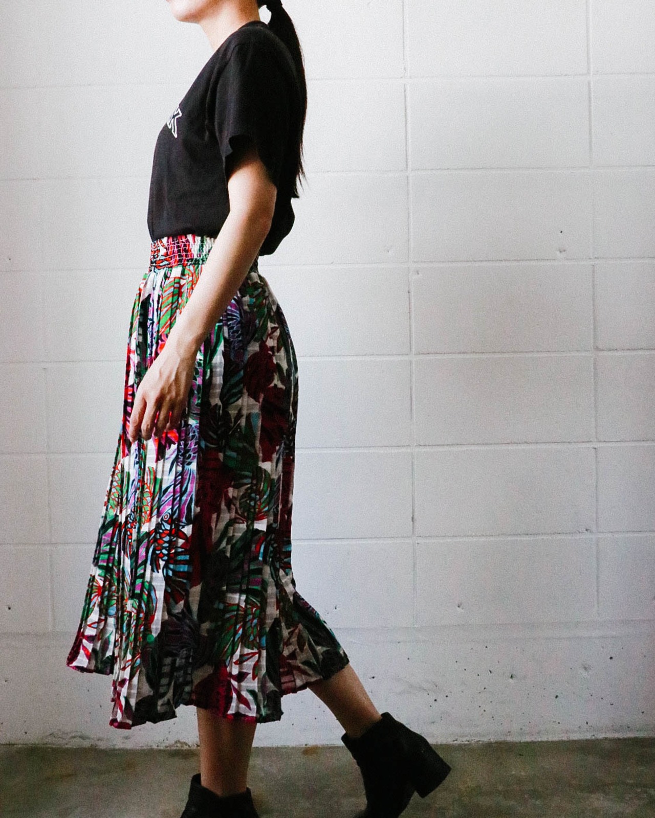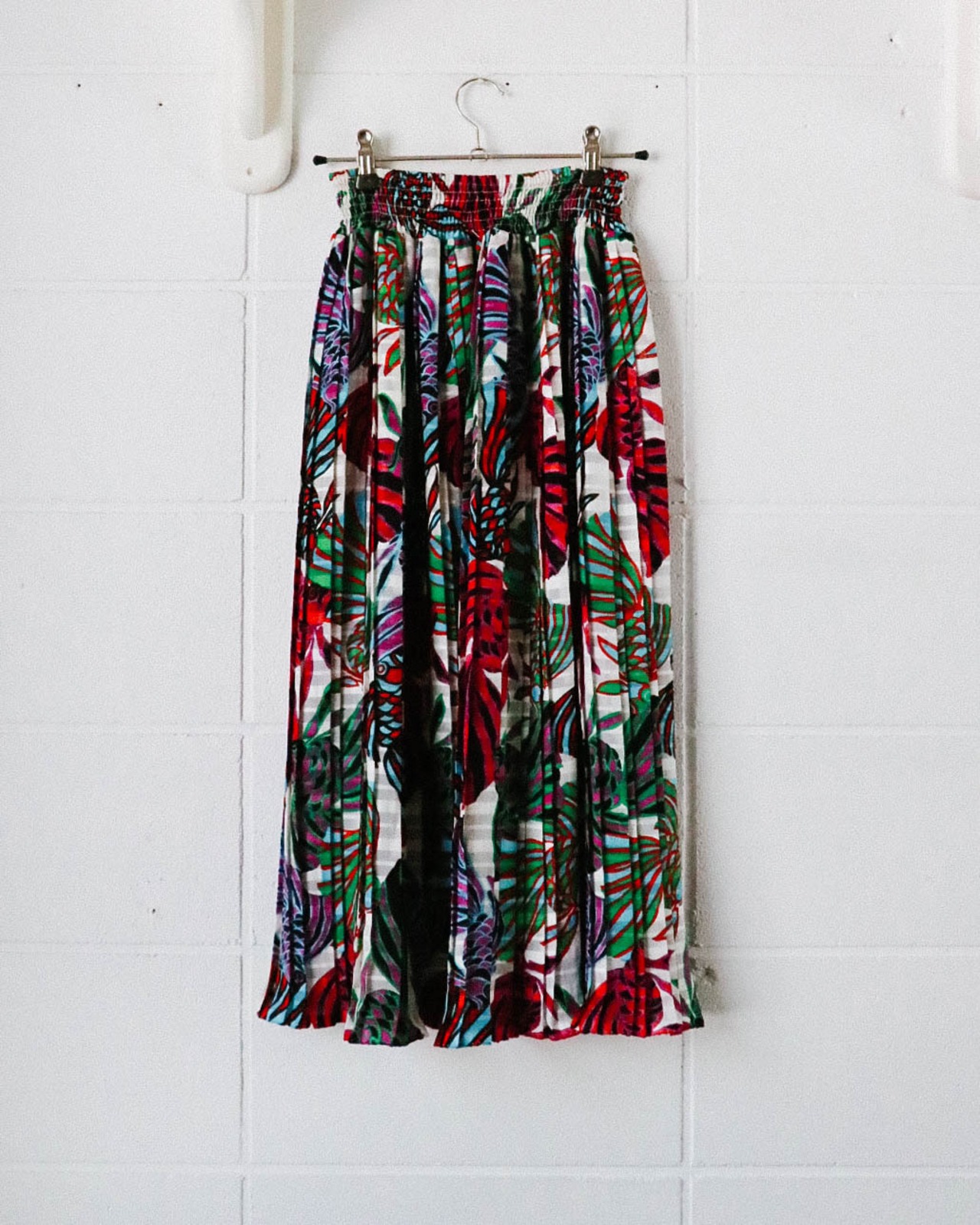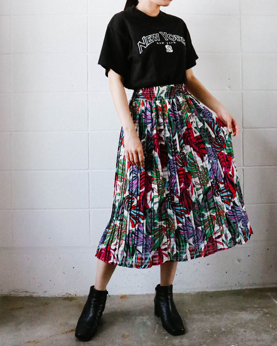 ビビットカラーが目を惹くプリントのミディ丈のプリーツスカートが入荷しました。ホワイトベースなので爽やかにサラリと履きたい気分にぴったりです。ウエストはゴムなのでストストレスフリーと着心地も◎。これからの季節に大活躍するはず。