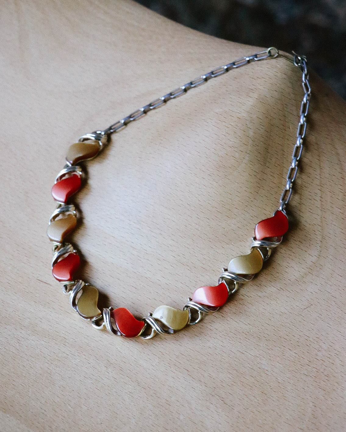 60年代に多いプラスチック素材を多分に生かした、クリアでリーフモチーフのような華やさのあるデザイン。ブラウスやTシャツの首元から覗かせるてさりげなくアクセントを取り入れたい。