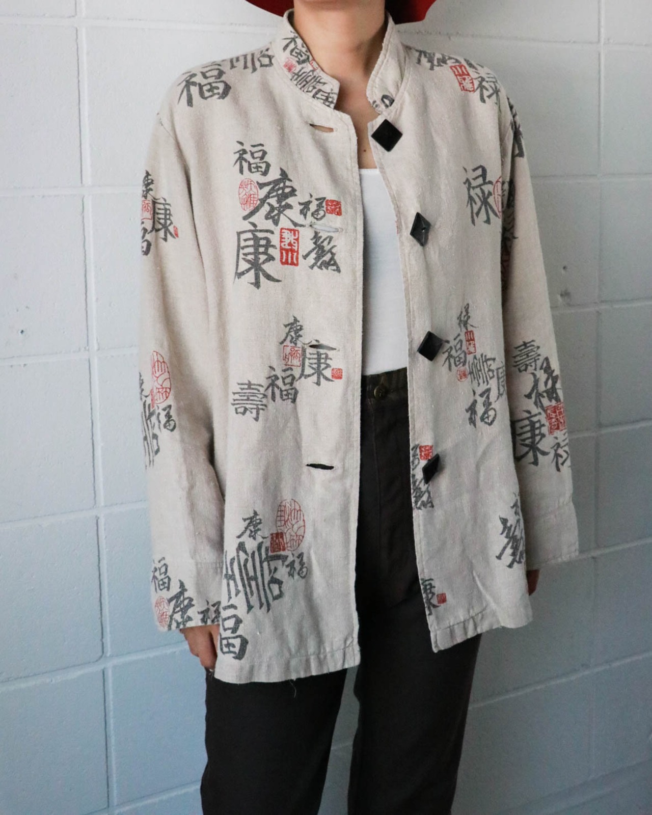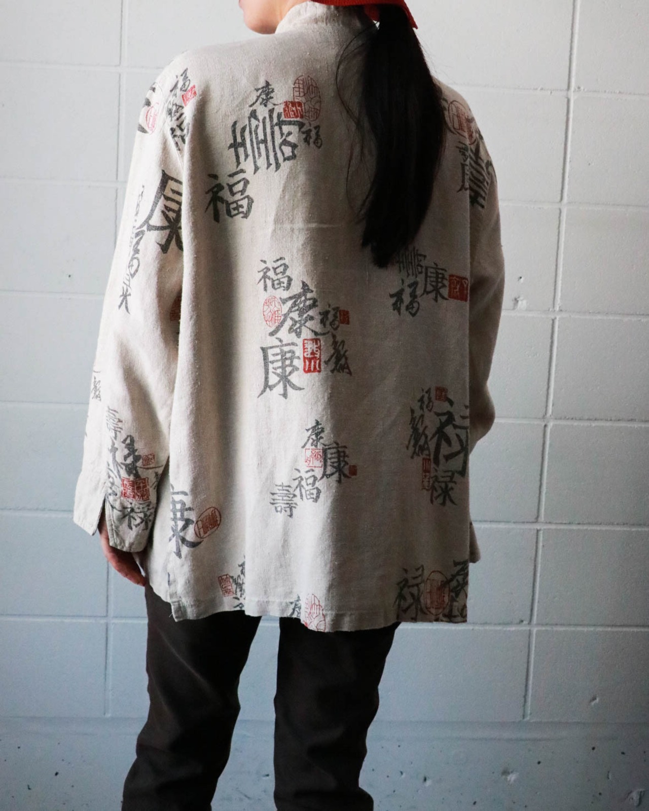 柔らかで身軽な漢字モチーフのジャケット。ナチュラルなリネン素材が肌馴染みよく、実用的な風合いを醸し出す一着。ベーシックなベージュカラーがトップスやボトムスを選ばず受け入れてくれるので、コーディネートの幅がぐっと広がります。ゆったりとしたサイズ感をいかして、フェミニンなアイテムと合わせたり、肩を落としルーズに着こなすのもオススメです。