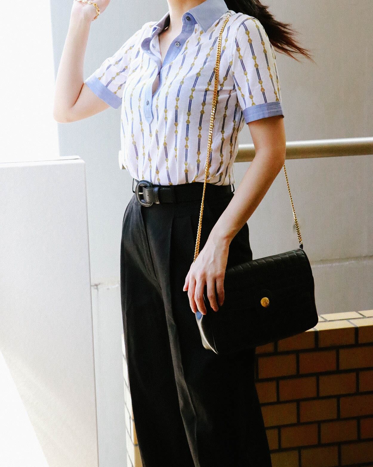 清涼感ある色合いとオールドセリーヌらしいチェーン柄が特徴的。薄手のピュアコットン100%で真夏も快適に過ごせる。