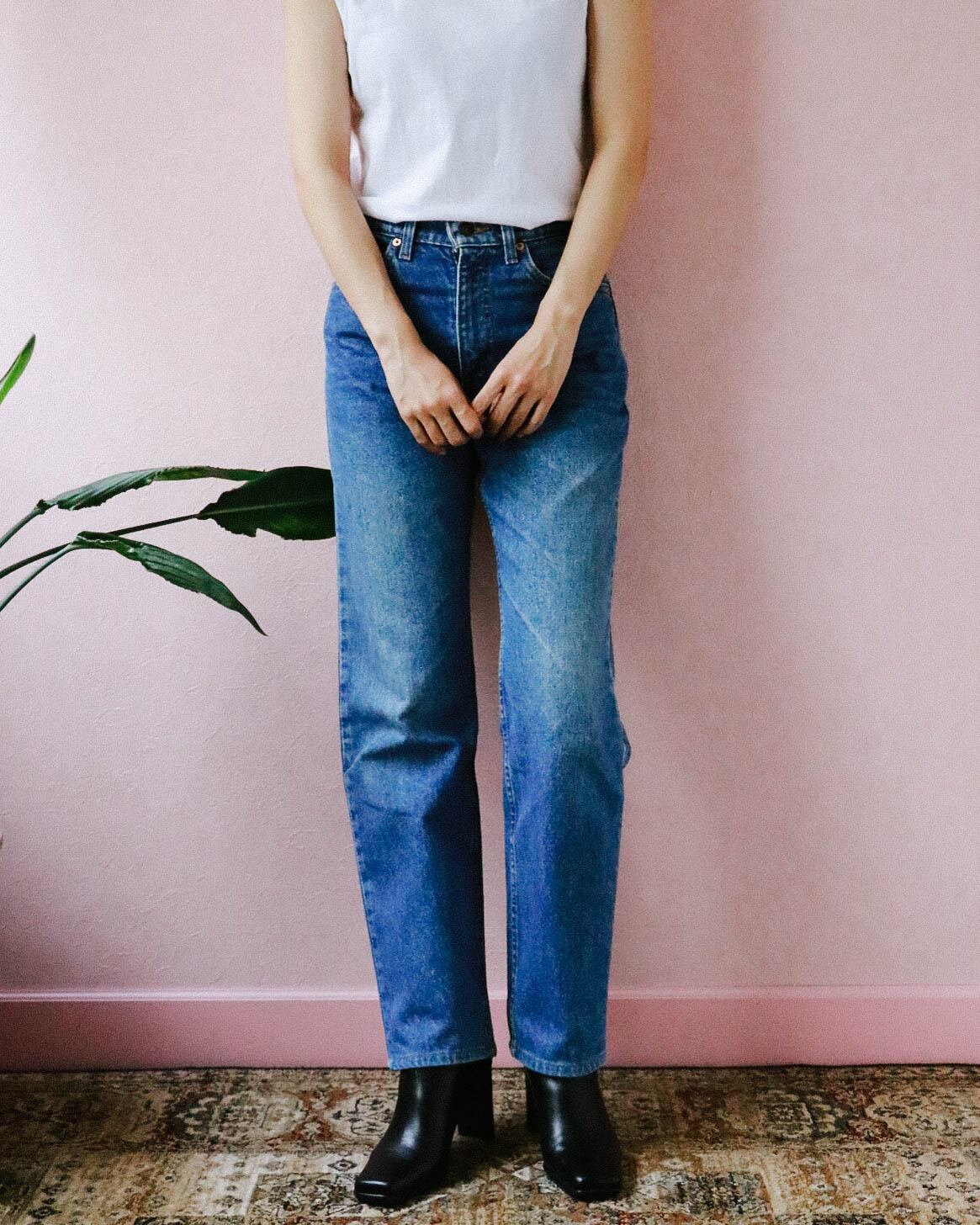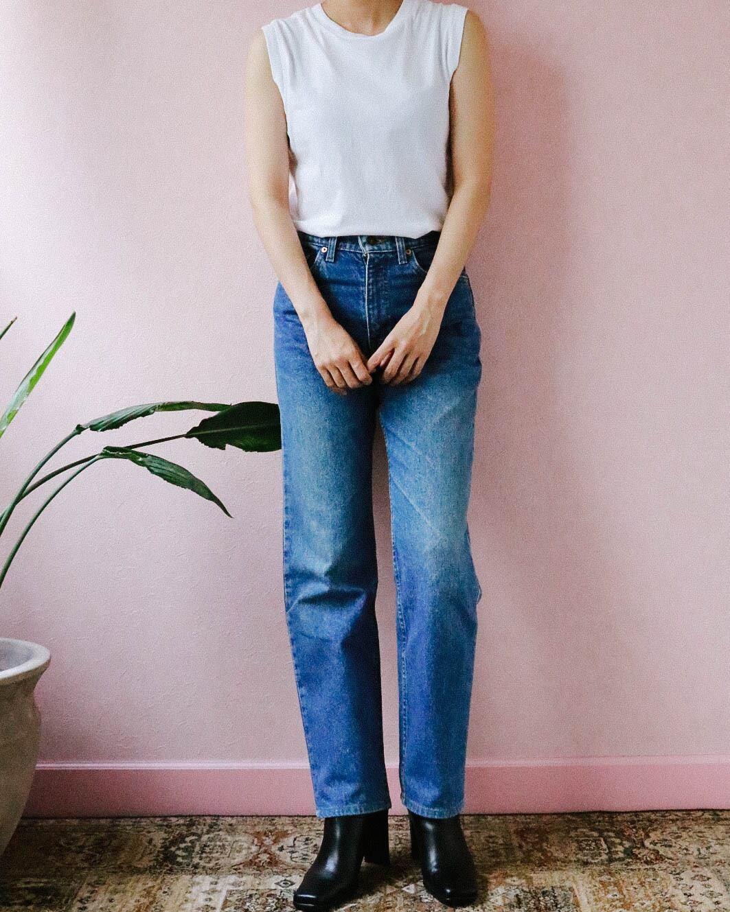 ジッパーフライのジーンズで、タックインも綺麗に決まる。