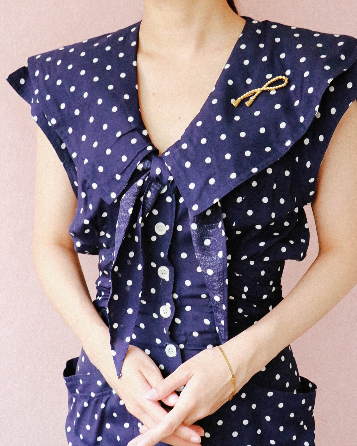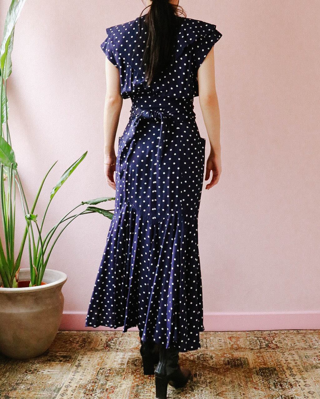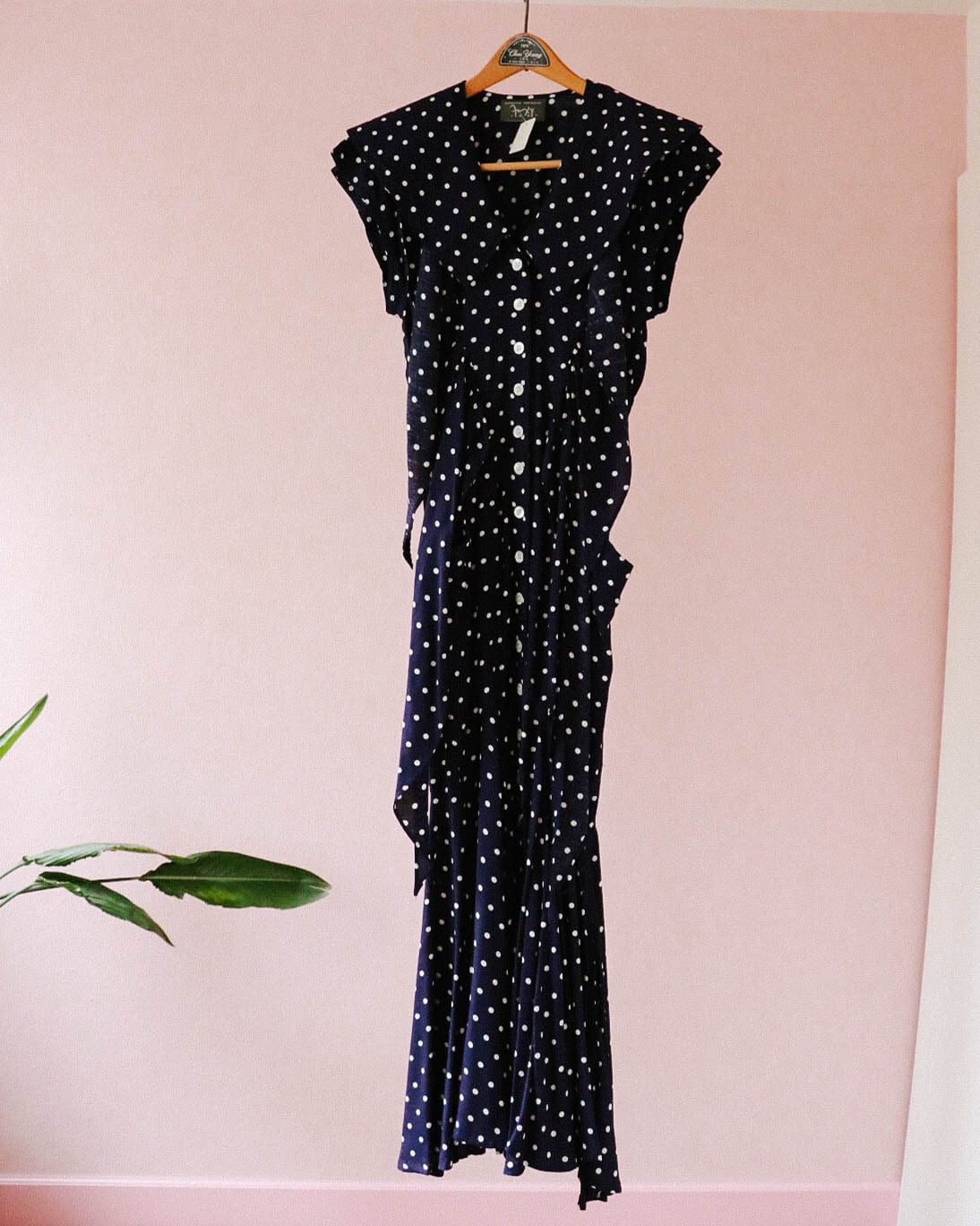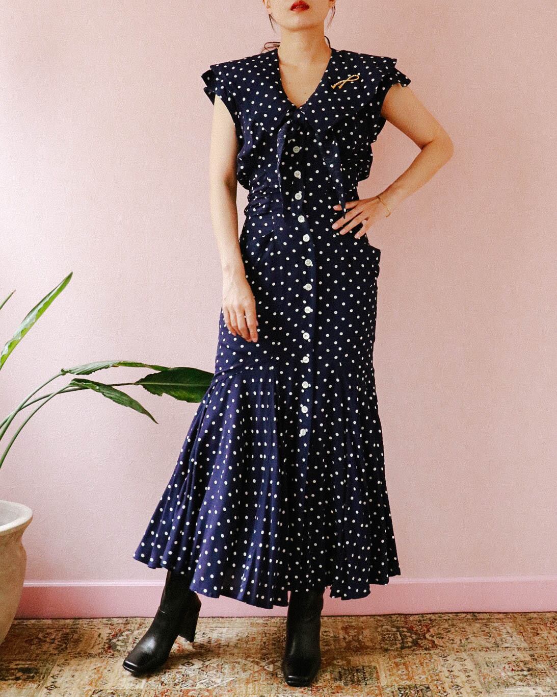 裾のV字マーメイドラインは歩くたびに優美さが漂い、全体的に女性らしいシルエットですが、大きなポケットがついていたりヴィンテージらしいユニークさを加味した素敵な1着。